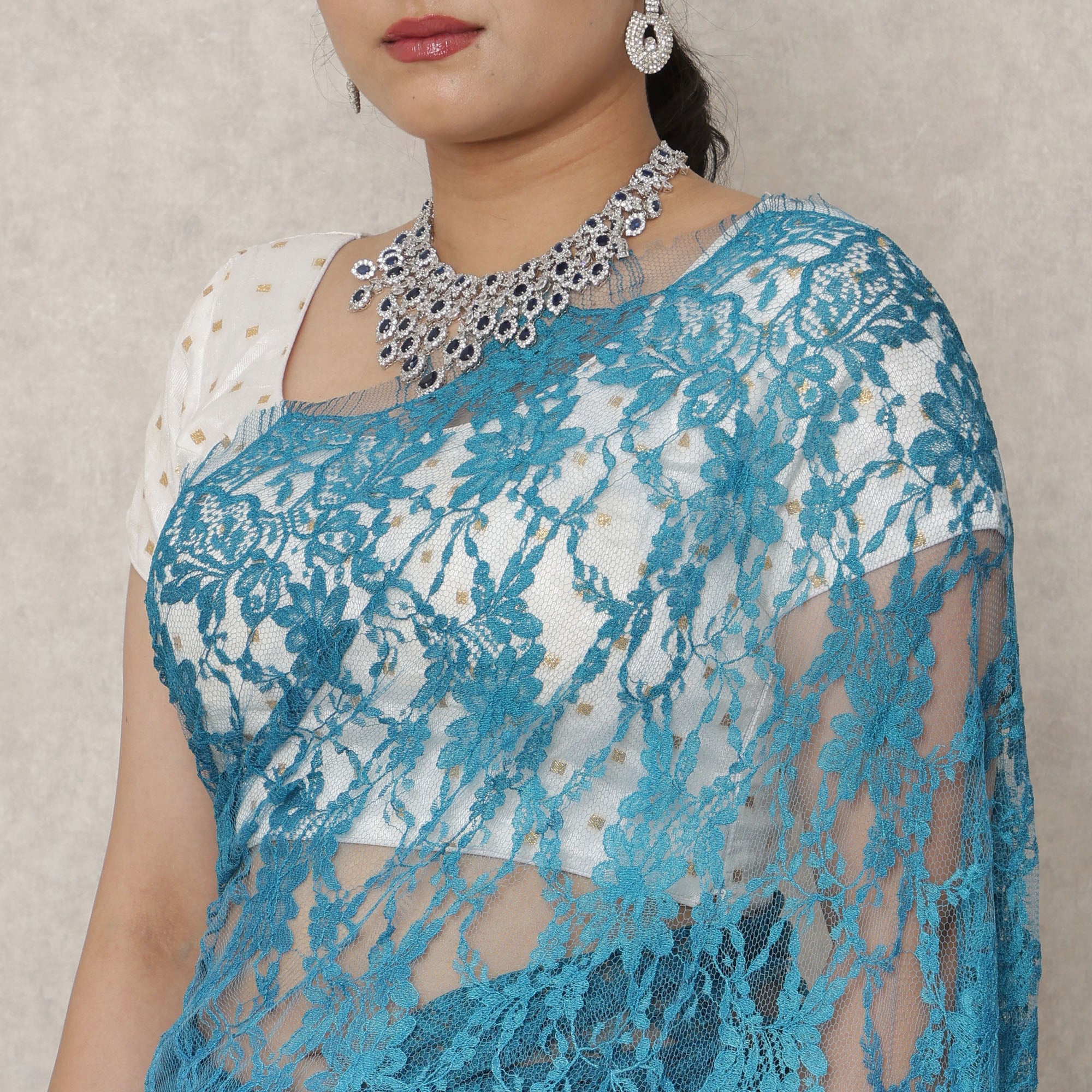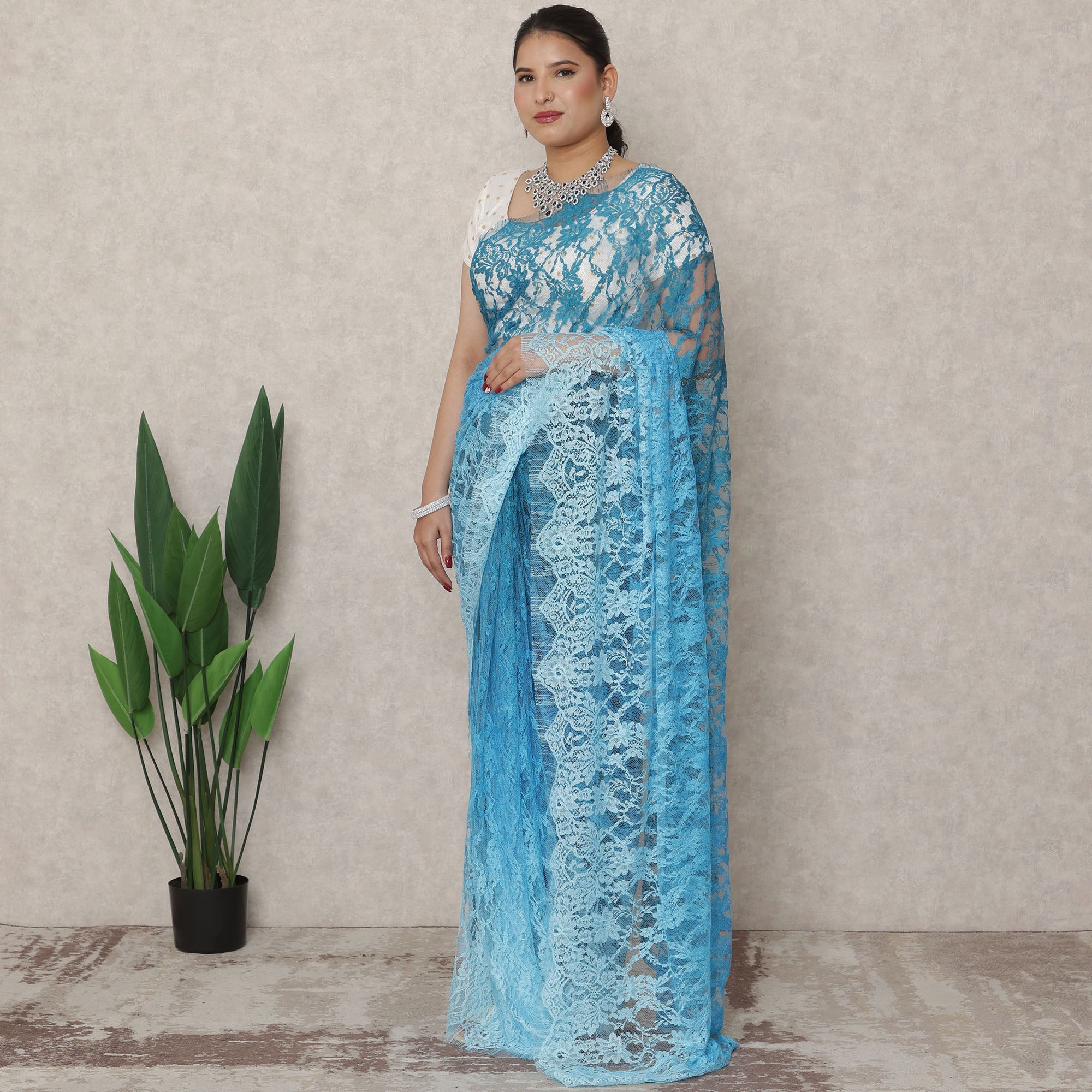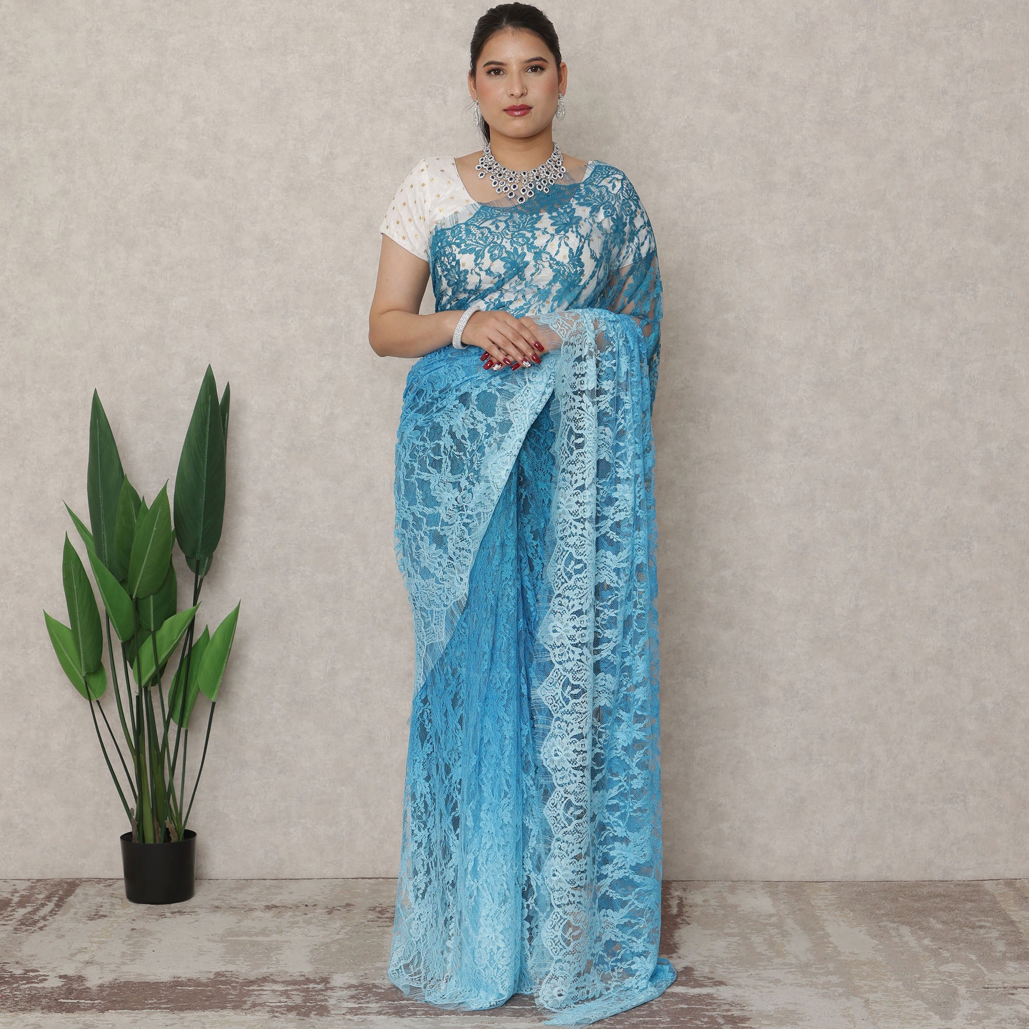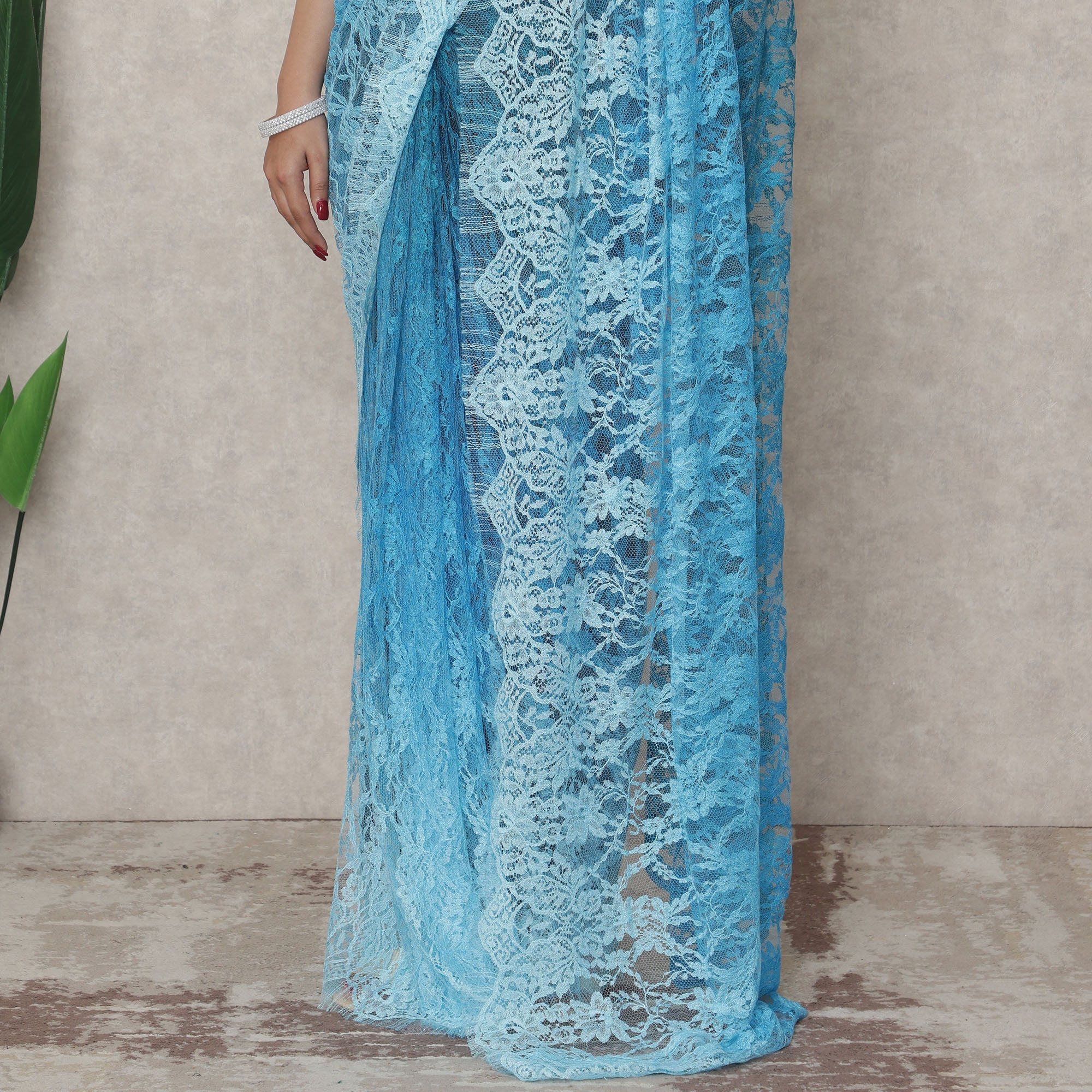 ساري فرنسي فاخر من الدانتيل الشانتيلي، من اللون الأزرق السماوي إلى الأزرق السماوي، بطول 5.5 متر، وعرض 110 سم، صنع في فرنسا - D24424