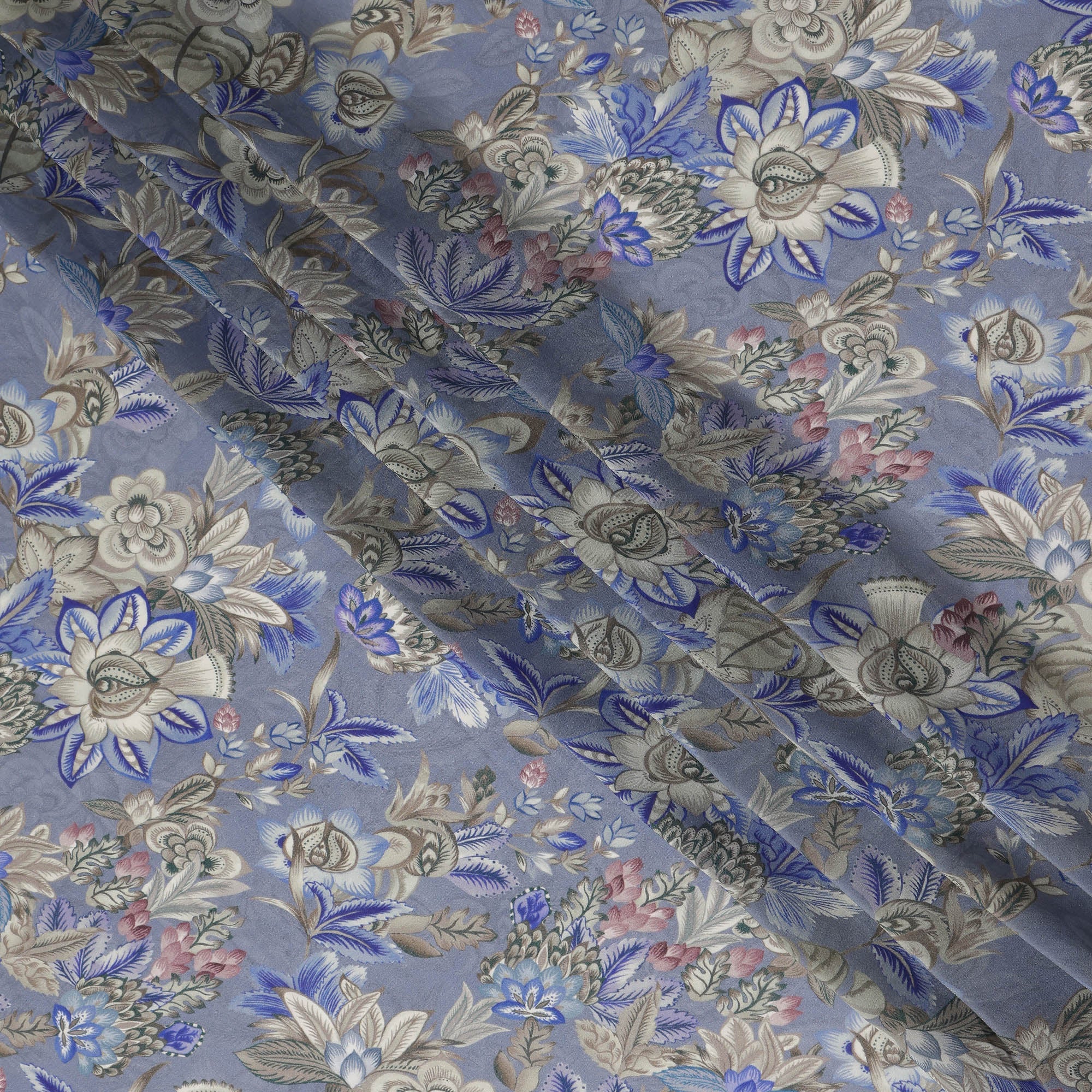 This slate blue floral printed viscose modal satin fabric is a refined and elegant textile created for designers, boutiques, and sewing enthusiasts who appreciate cool-toned sophistication with intricate detailing. Crafted from a viscose modal blend, the fabric features a smooth satin surface with a subtle sheen and a fluid drape that enhances the natural fall and movement of garments. The calming slate blue base is beautifully complemented by floral and foliage motifs in soft ivory, grey, and blue accents, creating a balanced and timeless aesthetic. Lightweight and breathable, it feels gentle on the skin and remains comfortable for extended wear. Easy to cut and stitch, this fabric supports clean tailoring and polished finishes, making it ideal for dresses, sarees, kurtis, blouses, skirts, and coordinated fashion pieces suitable for both everyday elegance and special occasions.