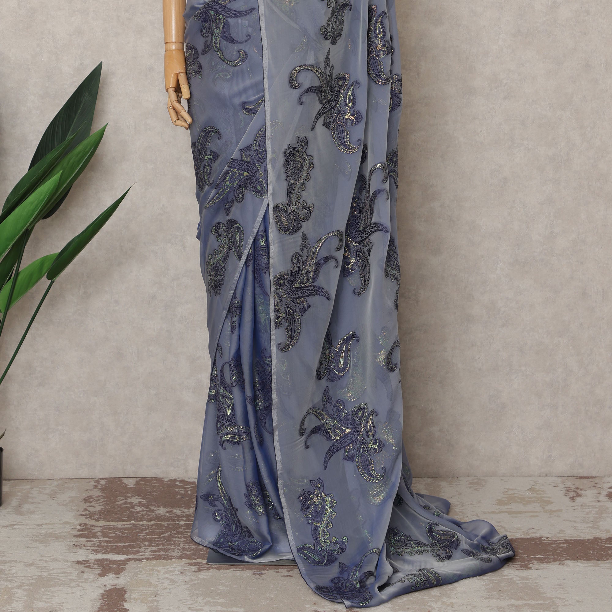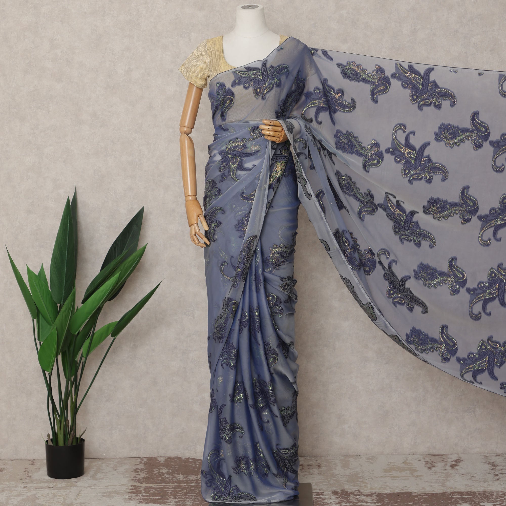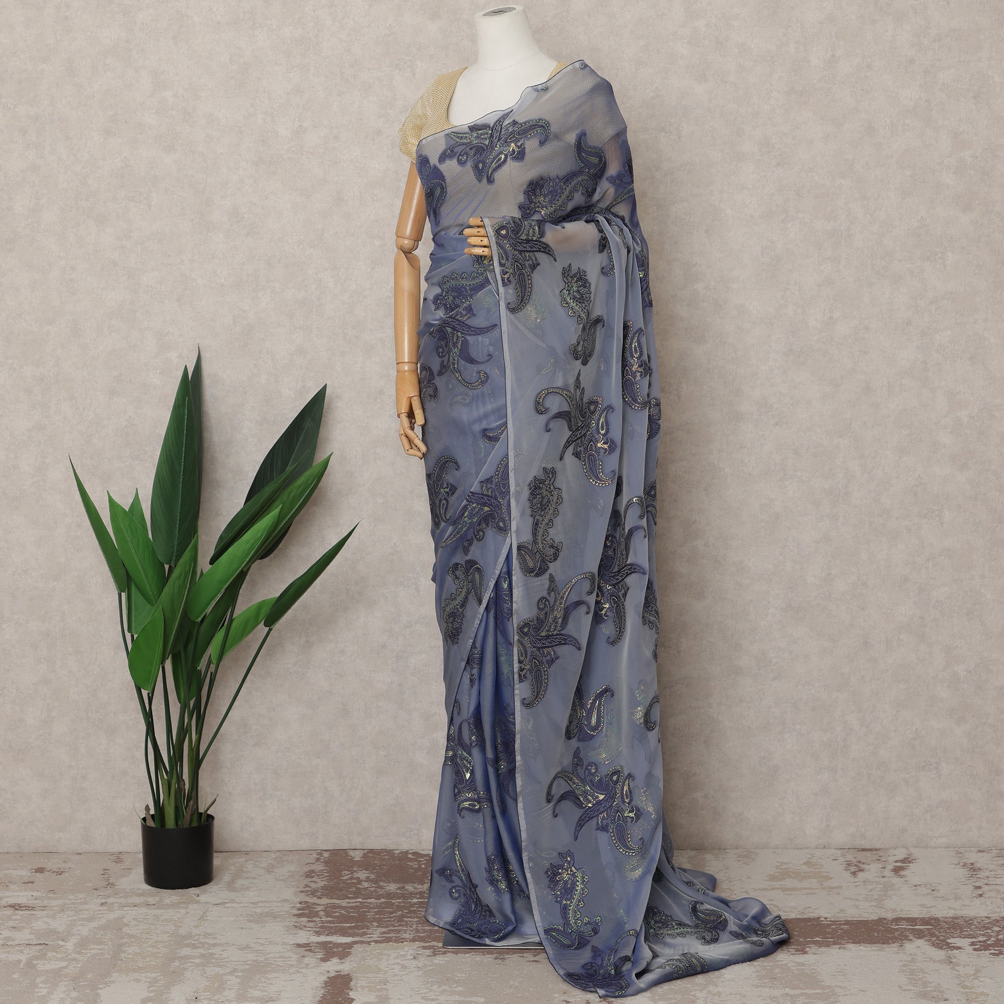 انطلقي نحو الأناقة بكل سهولة مع هذا الساري الفرنسي الفاخر من الشيفون الأزرق الداكن، والمُصمم بنقوش بيزلي معدنية منسوجة بدقة،... اقرأ أكثر اقرأ أكثر