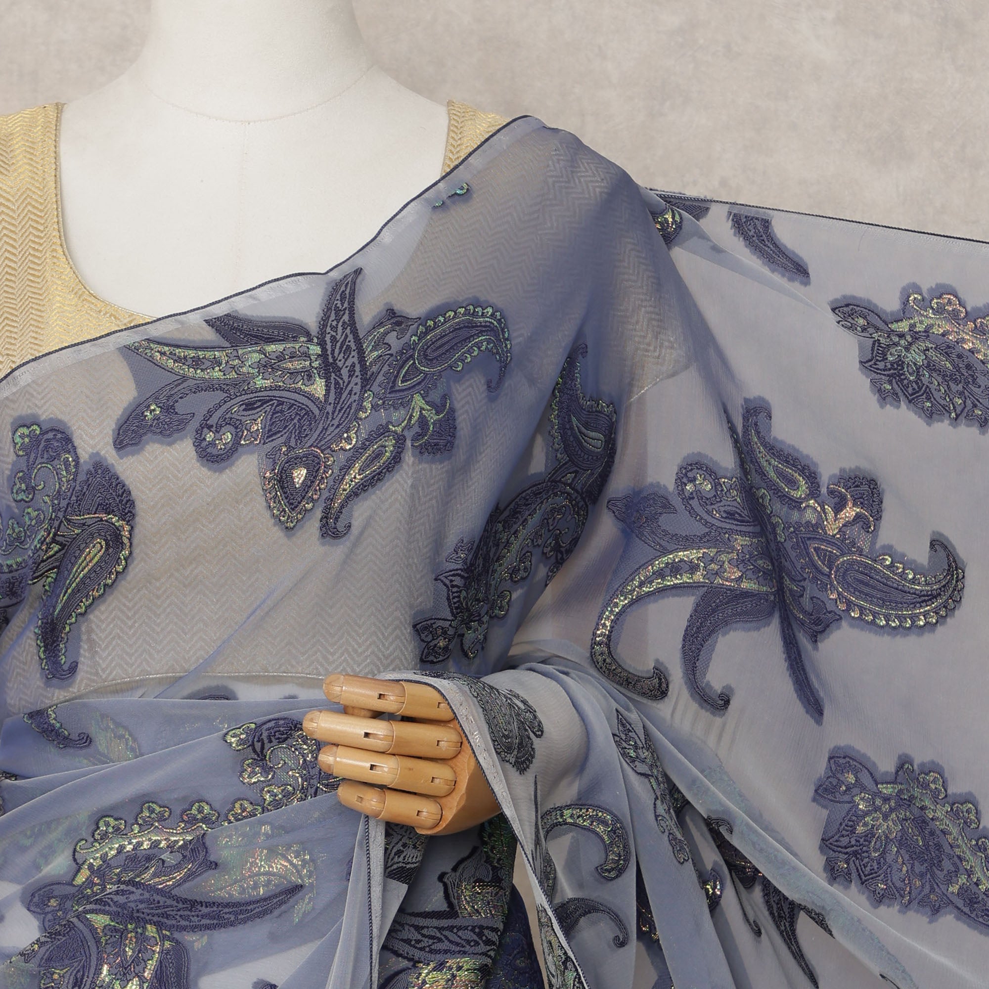 ساري شيفون فرنسي فاخر باللون الأزرق الداكن مع نقشة بيزلي من لوركس معدني، طول 5.5 متر، عرض 110 سم، صنع في فرنسا - D24300
