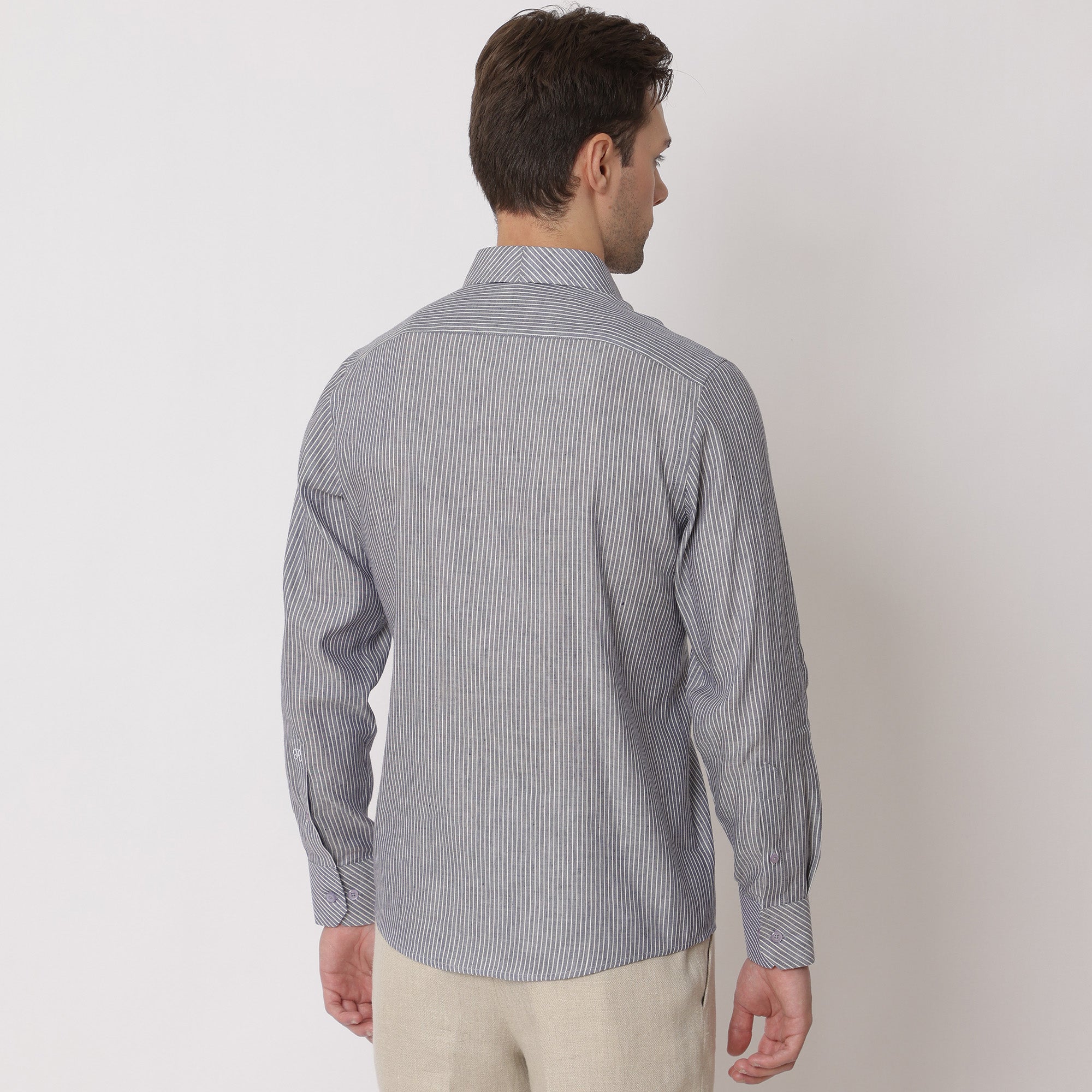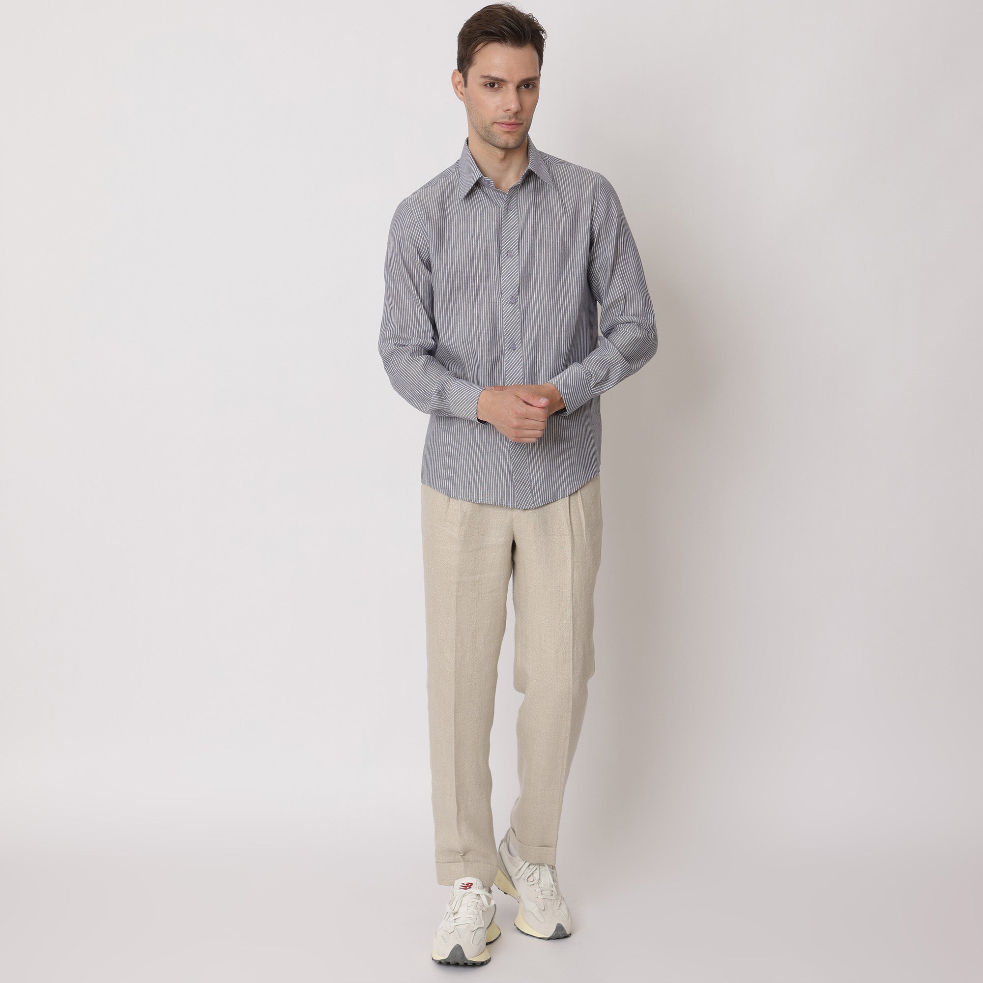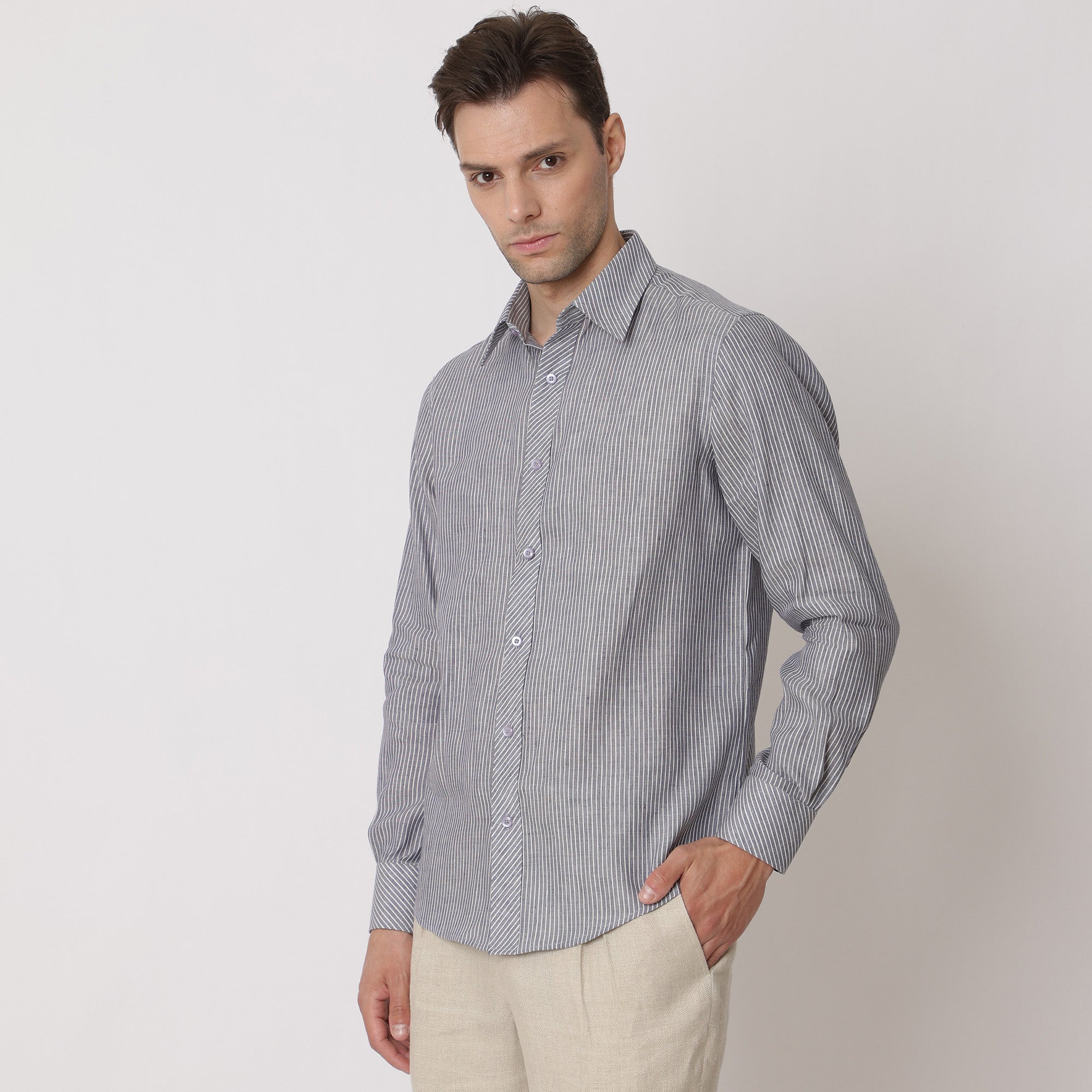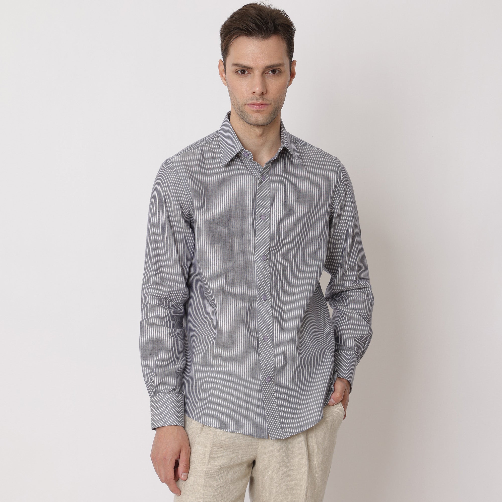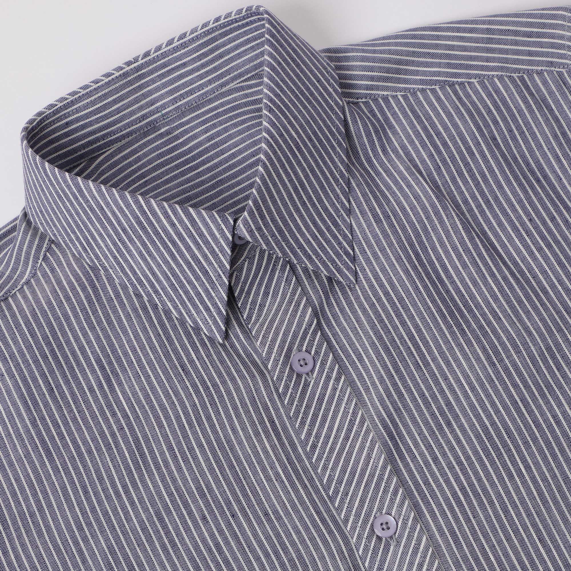 قميص كتان نقي فاخر مخطط باللونين الرمادي والأبيض، بقصّة كلاسيكية، صنع في الإمارات العربية المتحدة - D22008