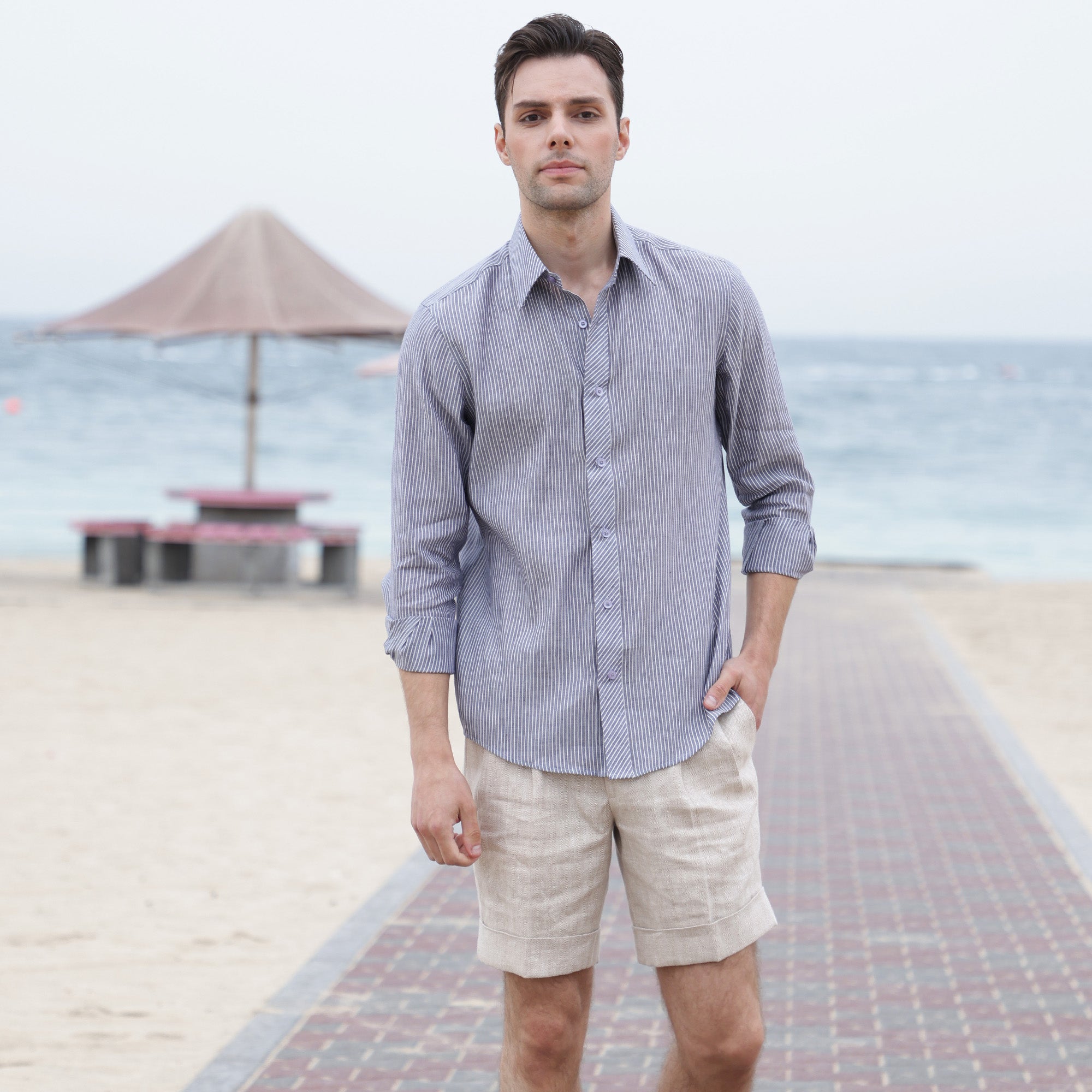 • قميص كتان نقي فاخر مخطط باللونين الرمادي والأبيض، بقصّة كلاسيكية، صنع في الإمارات العربية المتحدة - D22008