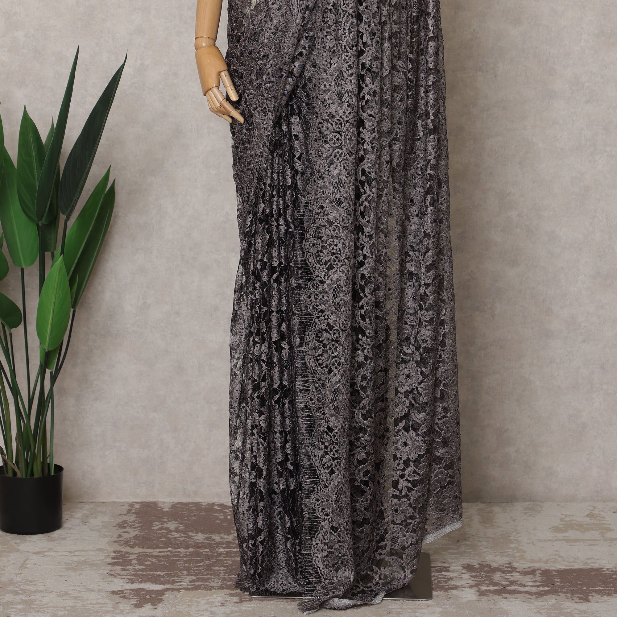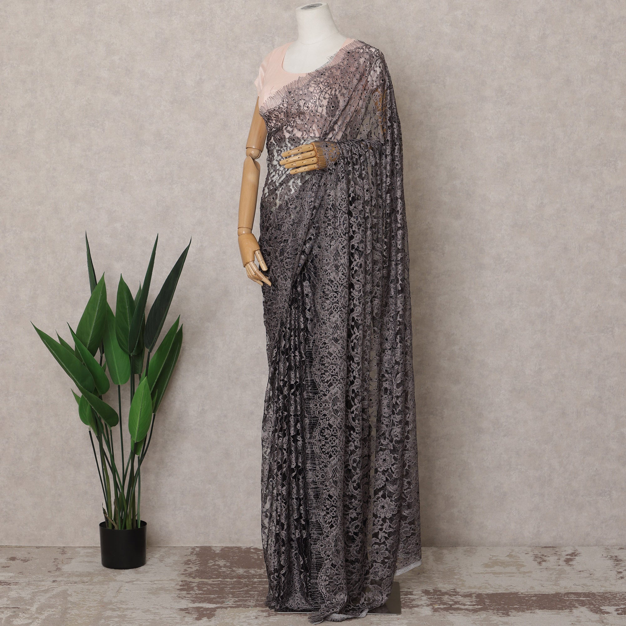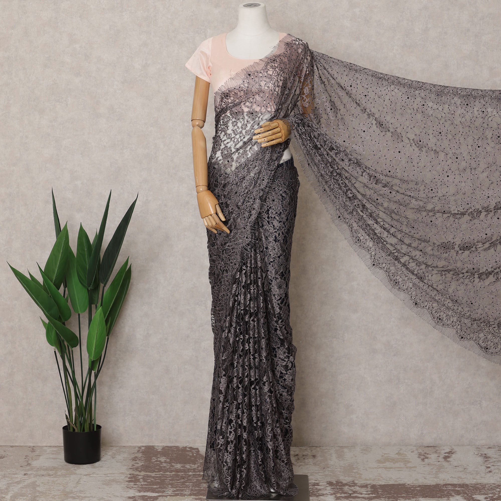 ساري فرنسي فاخر بلون بنفسجي دخاني من قماش شانتيلي ثنائي اللون مع تطريز حجري - طول 5.5 متر وعرض 110 سم - مستورد من فرنسا - D22951