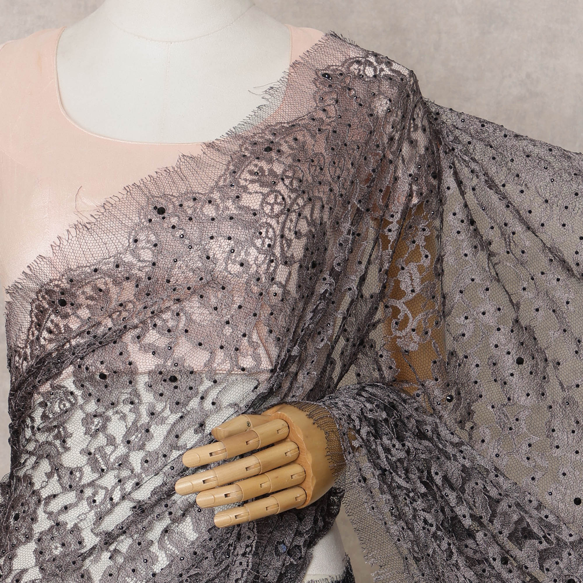 دانتيل شانتيلي فاخر ثنائي اللون مستورد من فرنسا مع زخارف حجرية سوداء
