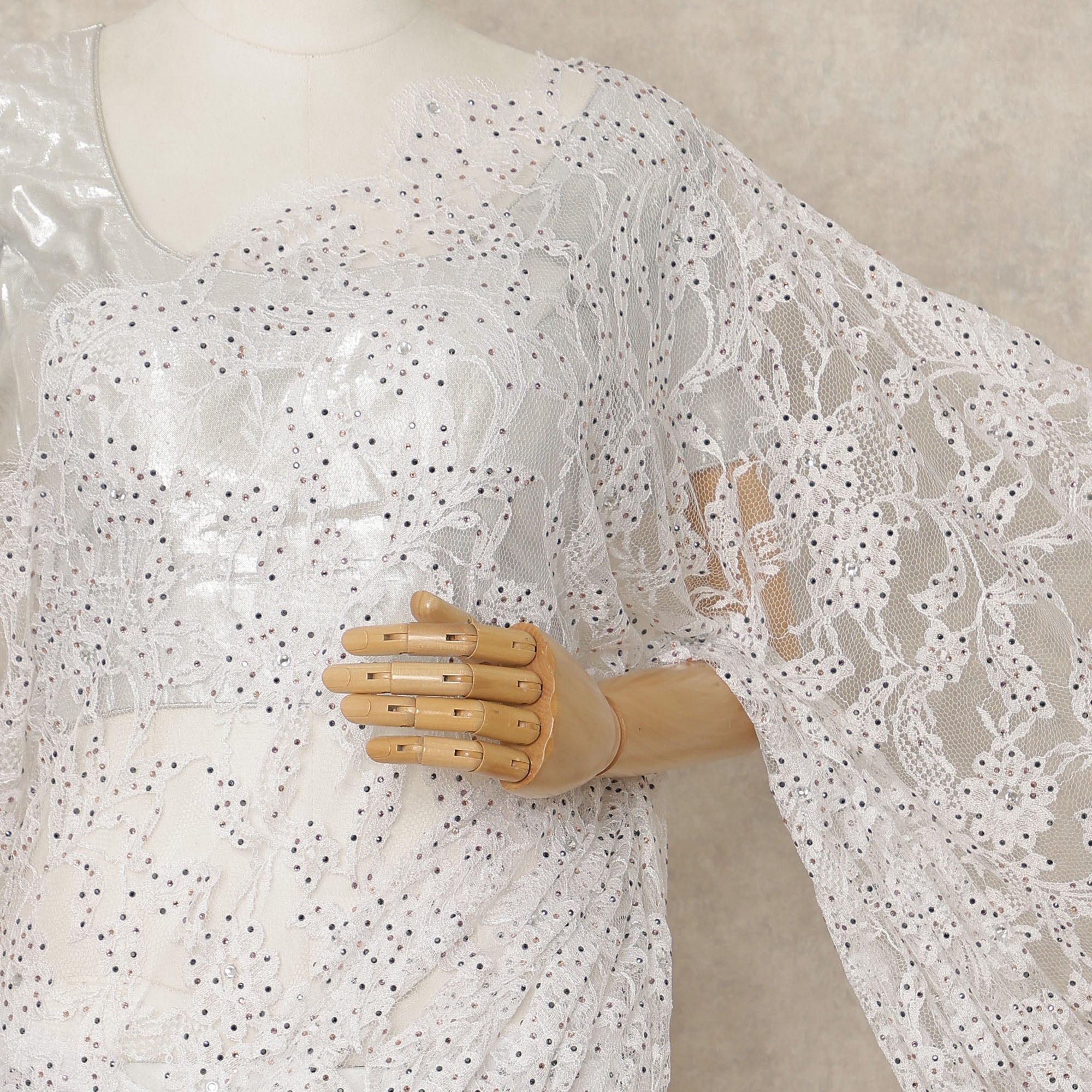 Snow White Premium French Chantilly Saree Lace with Stone Work 5.5 Mtrs Length, Width 110 Cms and Made in France-D27176