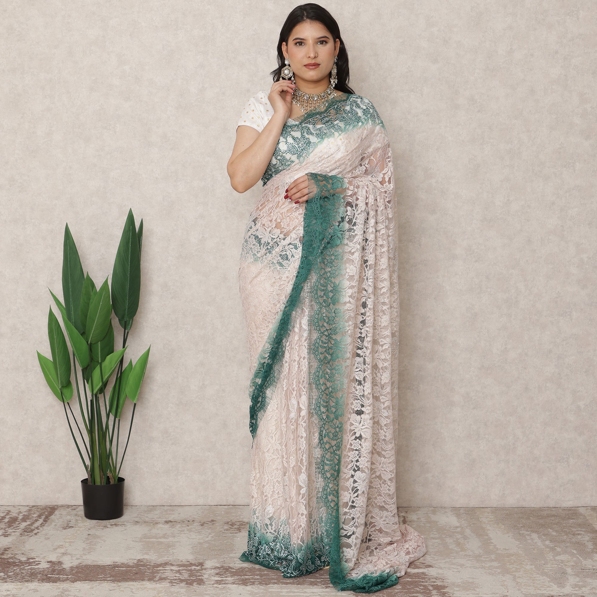 اكشفي عن أناقة راقية مع هذا الساري الناعم ذو اللون الوردي الفاتح إلى الأخضر الزمردي، المنسوج بشكل رائع من دانتيل شانتيلي الفرنسي الفاخر والمزين بدقة بأحجار لامعة للحصول على لمسة نهائية أثيرية. يبدأ تأثير التدرج الناعم بدرجة لون وردية لطيفة ويتحول بسلاسة إلى اللون الأخضر الزمردي الغني، مما يخلق تصميمًا مذهلاً بصريًا يعزز سحر الساري الملكي. صُنع هذا الساري بخبرة في فرنسا، ويبلغ طوله حوالي 5.5 متر وعرضه 110 سم، مما يوفر مرونة في التصفيف والتصفيف. يضفي نسيج الدانتيل المزخرف لمسة من الأنوثة والرقي، وهو مثالي للمناسبات الاحتفالية وحفلات الزفاف الحميمة والمناسبات المسائية الأنيقة. ترفع لمسات الأحجار اللامعة من نمط الدانتيل التقليدي بلمسة من السحر المناسب. على الرغم من أن قطعة البلوزة غير متضمنة، إلا أن لوحة الألوان ثنائية اللون تجعل من السهل تنسيقها مع بلوزات مصممة متباينة لتصفيف شخصي. اشتري عبر الإنترنت لتجربة اندماج الفن الفرنسي الراقي والنعمة العرقية الهندية - تسوق عبر الإنترنت الآن لجعل هذا الإبداع الخالد جزءًا من خزانة ملابسك.