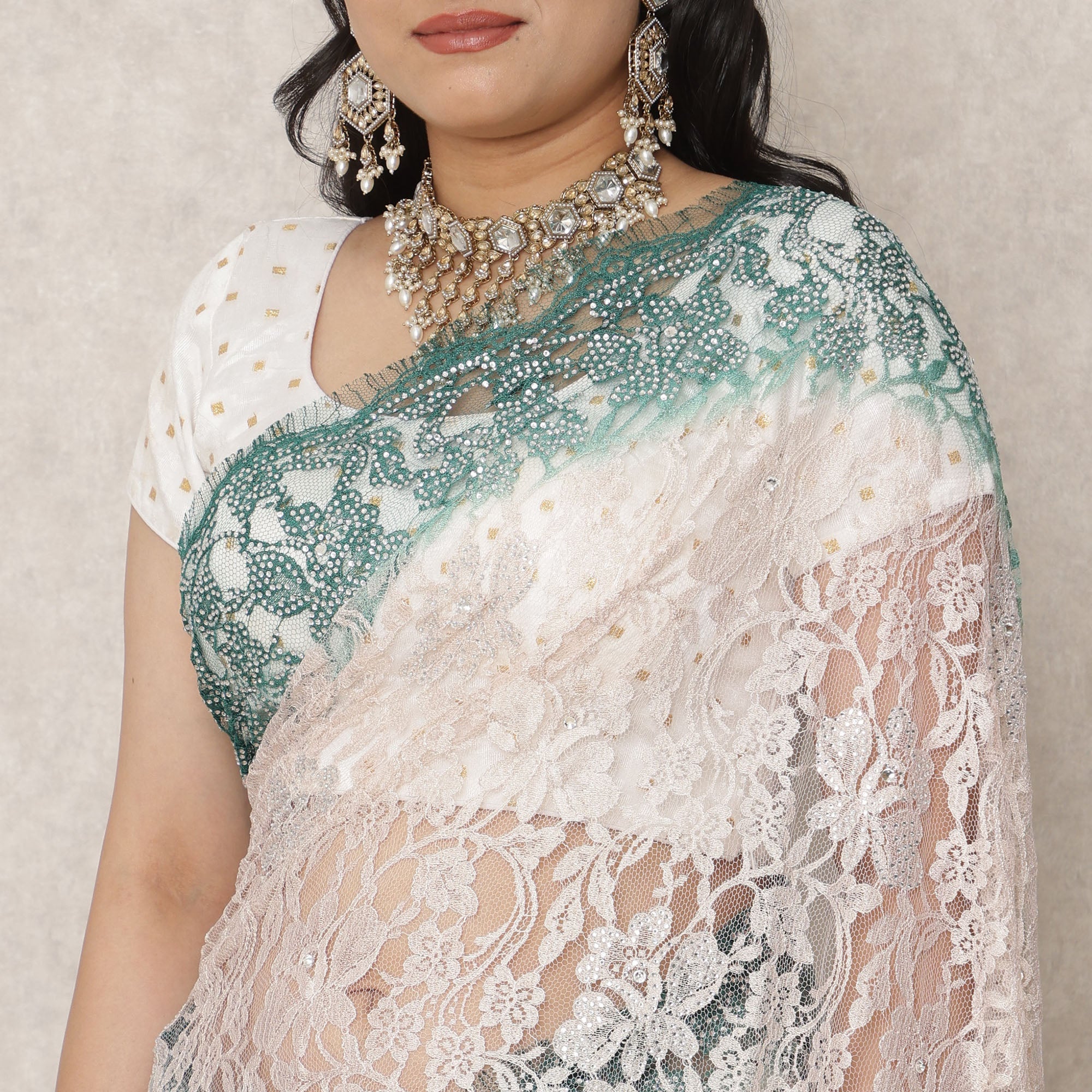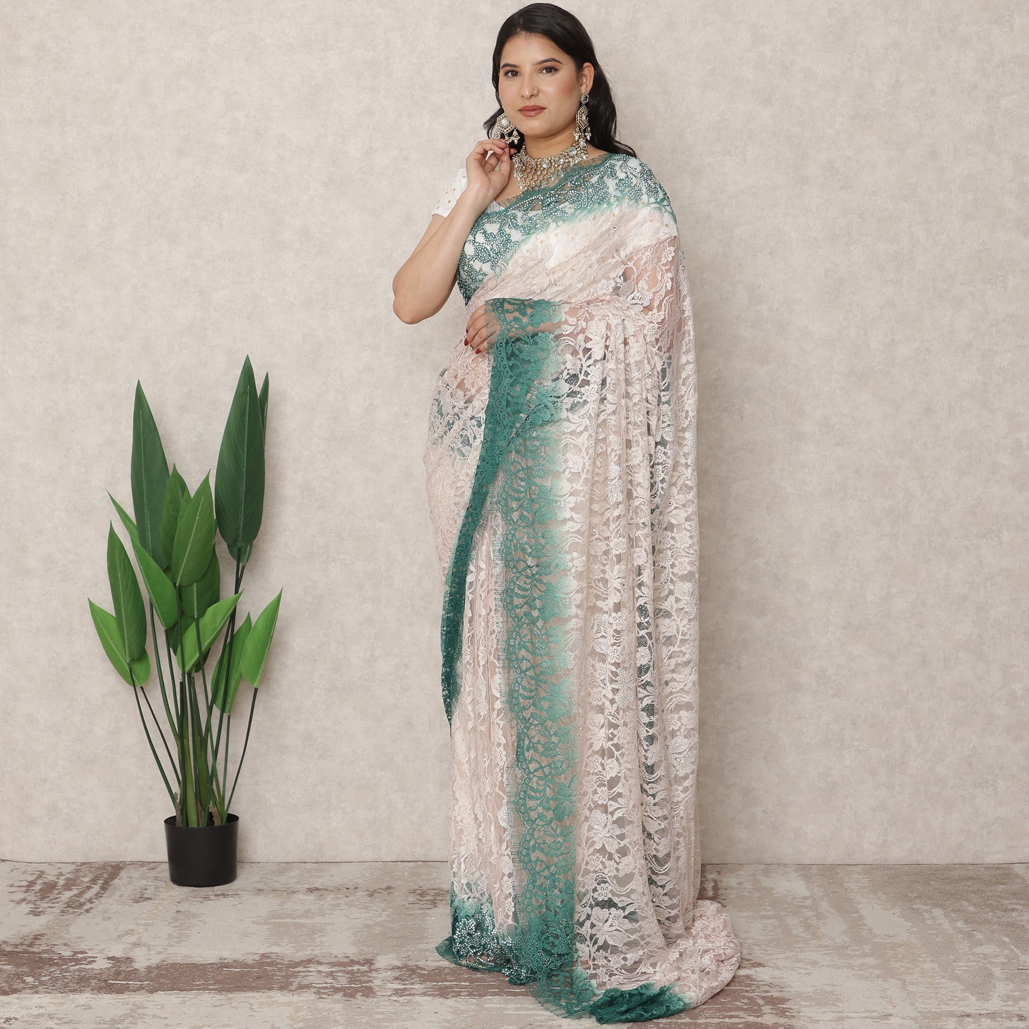 اكشفي عن أناقة راقية مع هذا الساري الناعم ذو اللون الوردي الفاتح إلى الأخضر الزمردي، المنسوج بشكل رائع من دانتيل... اقرأ أكثر اقرأ أكثر