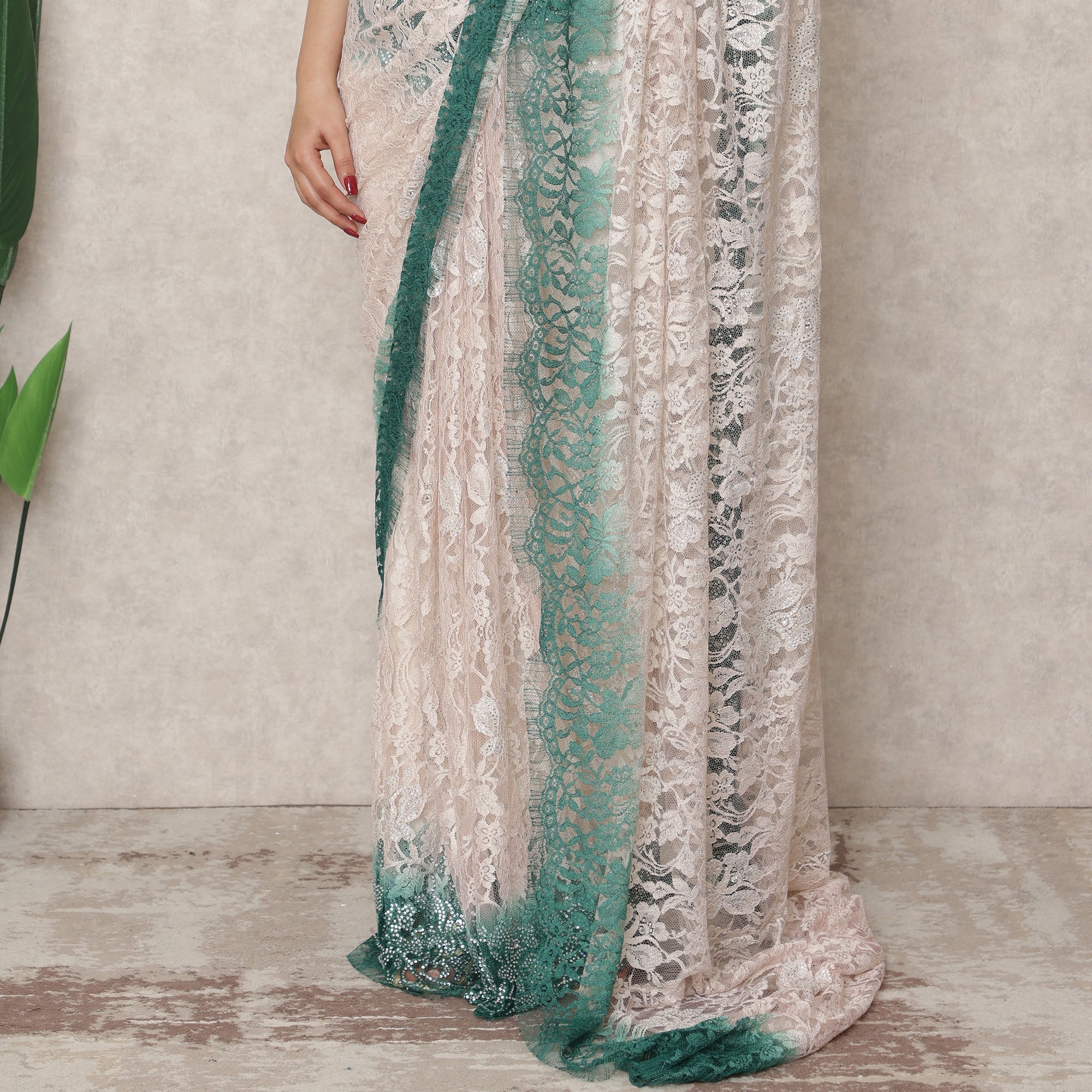 ساري فرنسي فاخر من الدانتيل الشانتيلي، بلون وردي فاتح إلى أخضر زمردي، مع تطريز حجري، بطول 5.5 متر، وعرض 110 سم، صنع في فرنسا - D24416