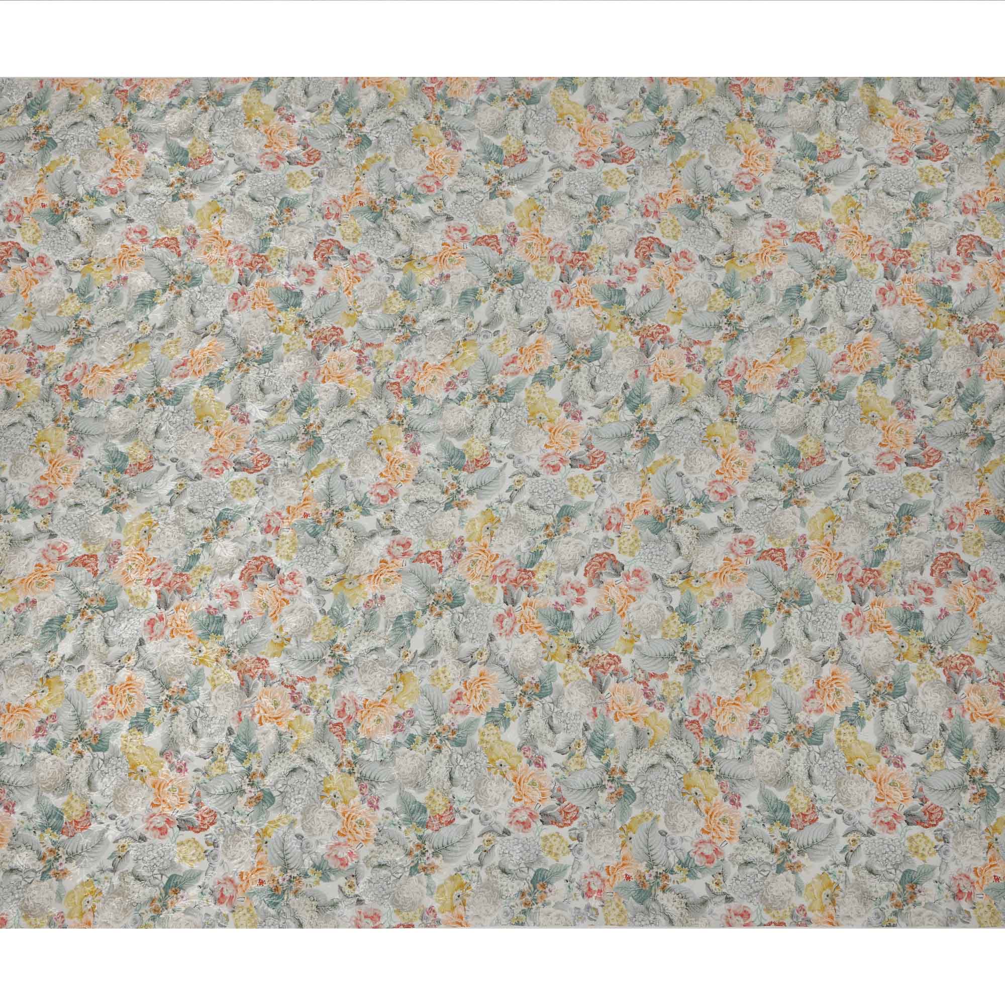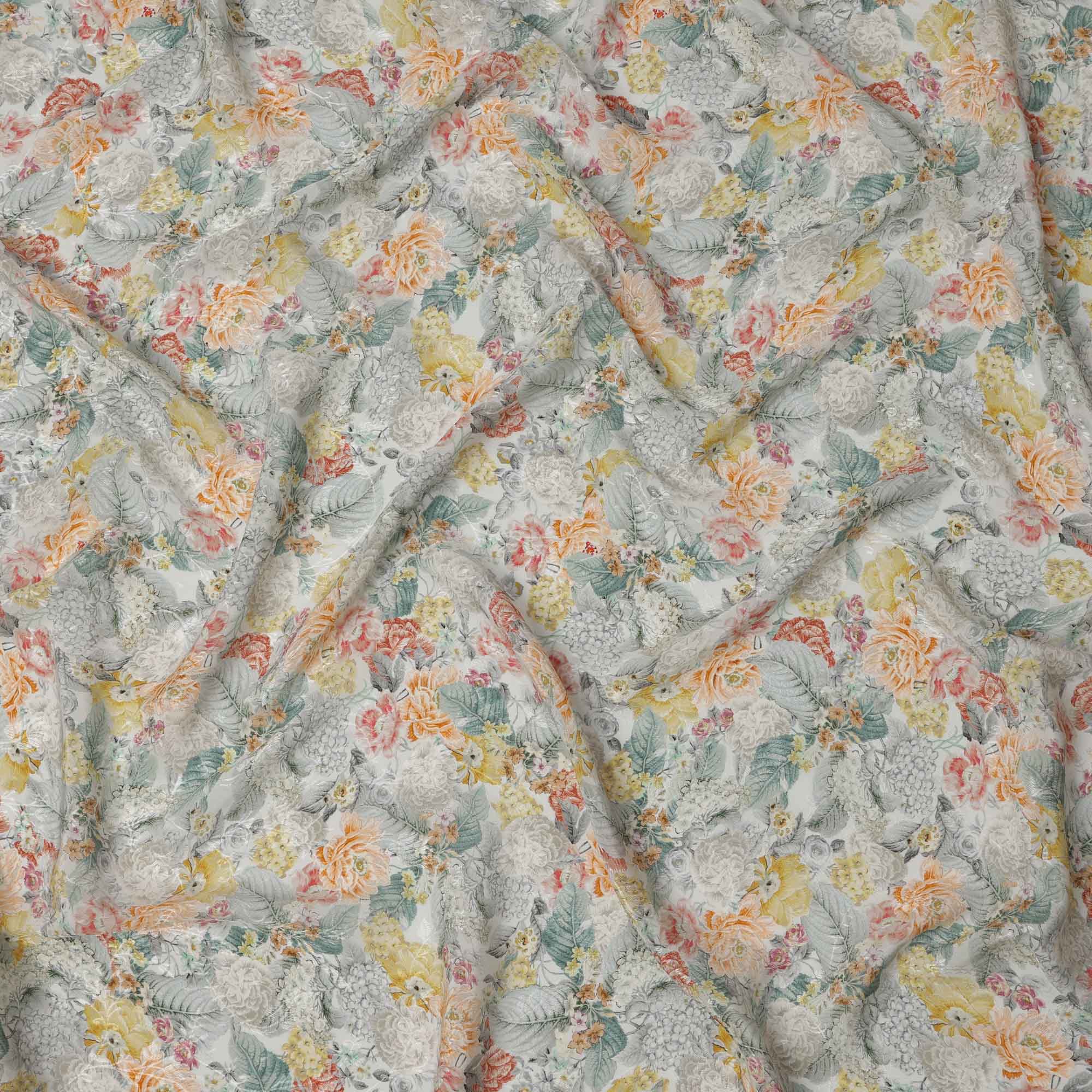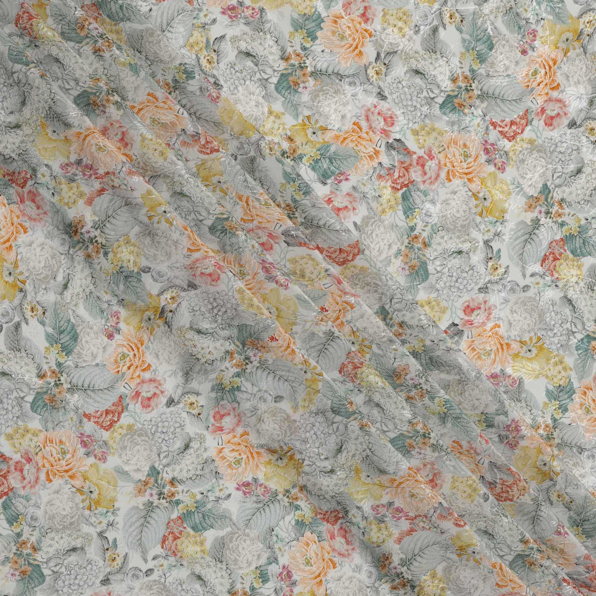 قماش كريب فيسكوز ناعم رمادي اللون بطبعة زهور، تصميم زهور الحديقة باللونين الأصفر والخوخي، عرض 110 سم، صنع في الهند - D23436