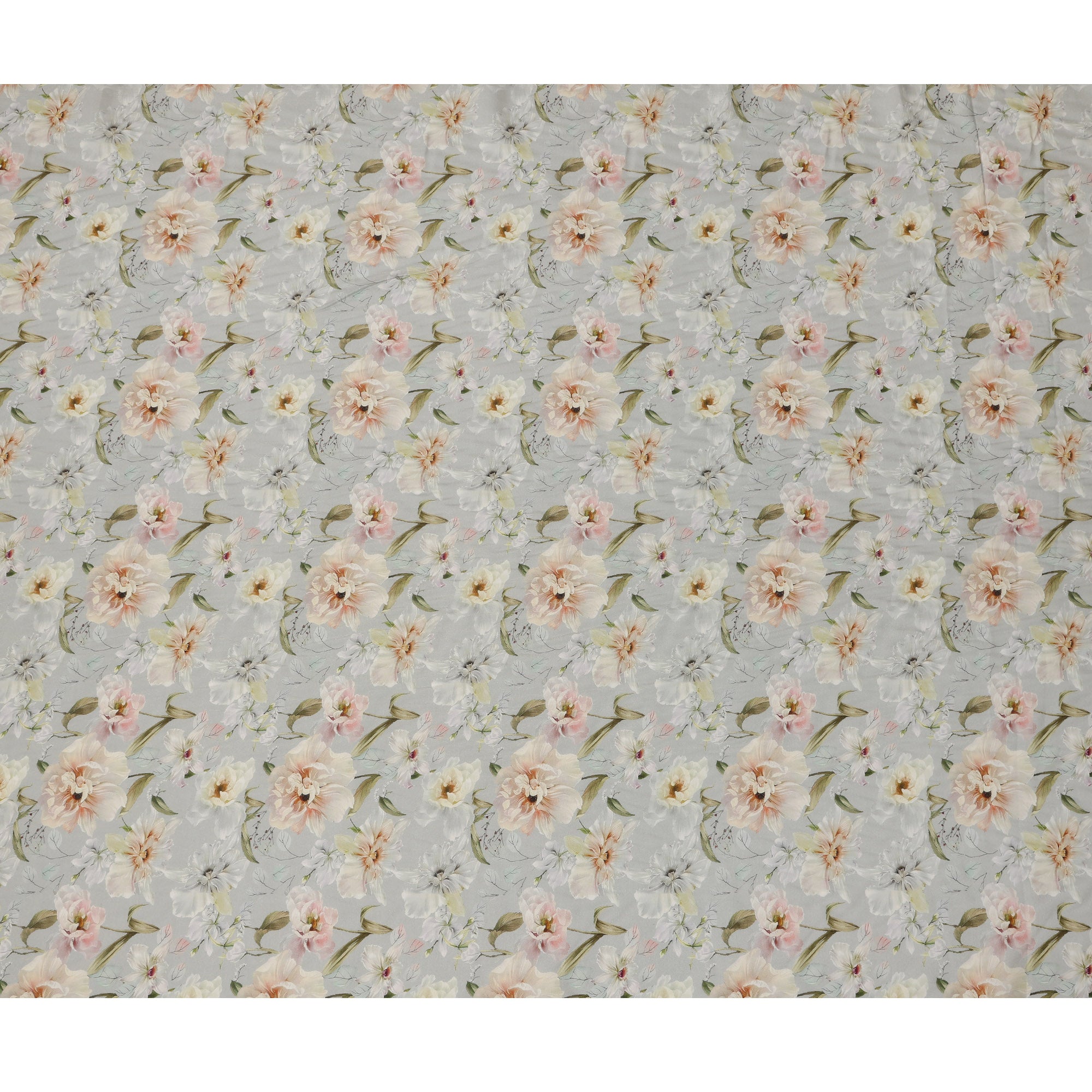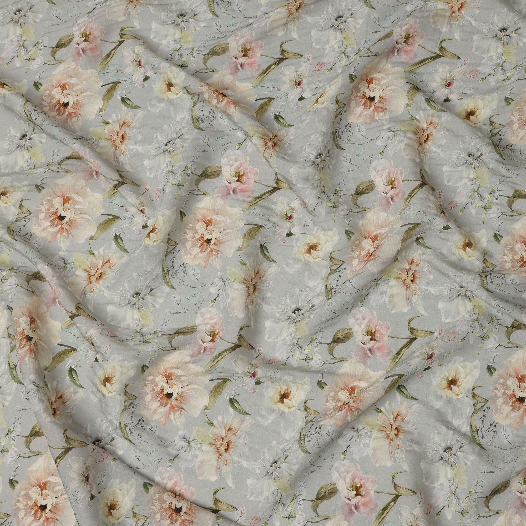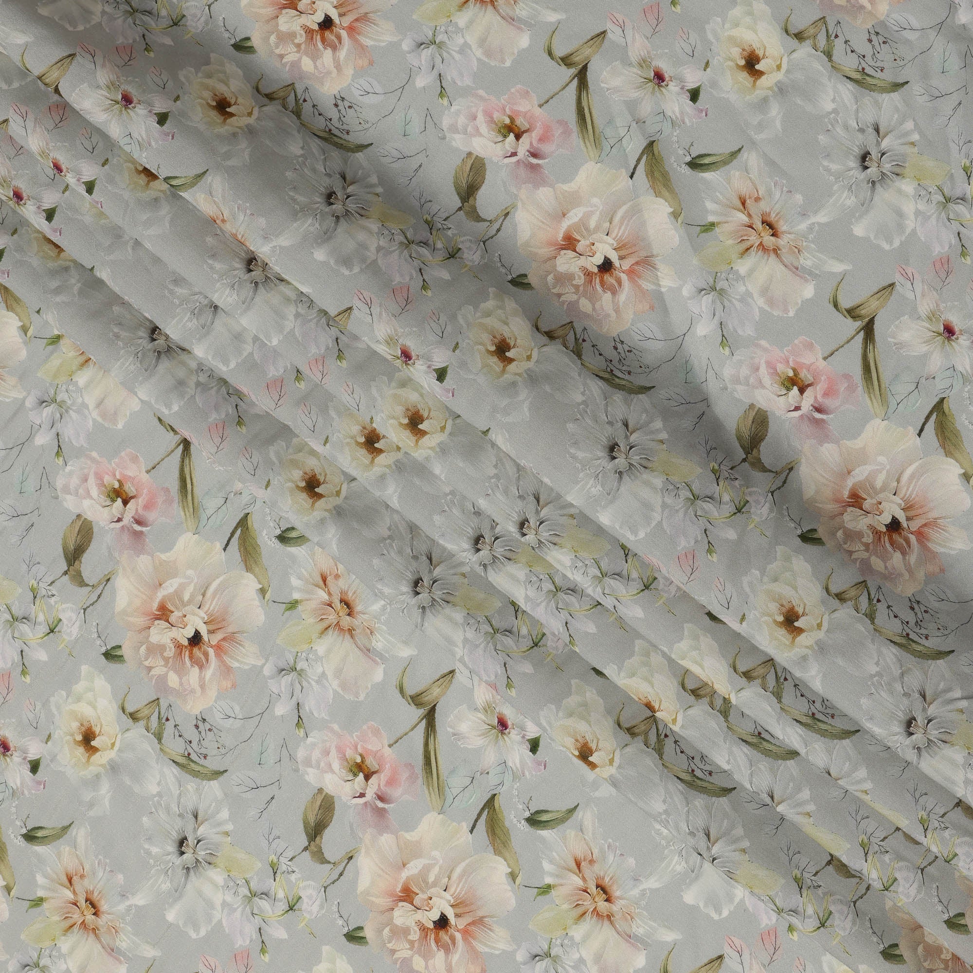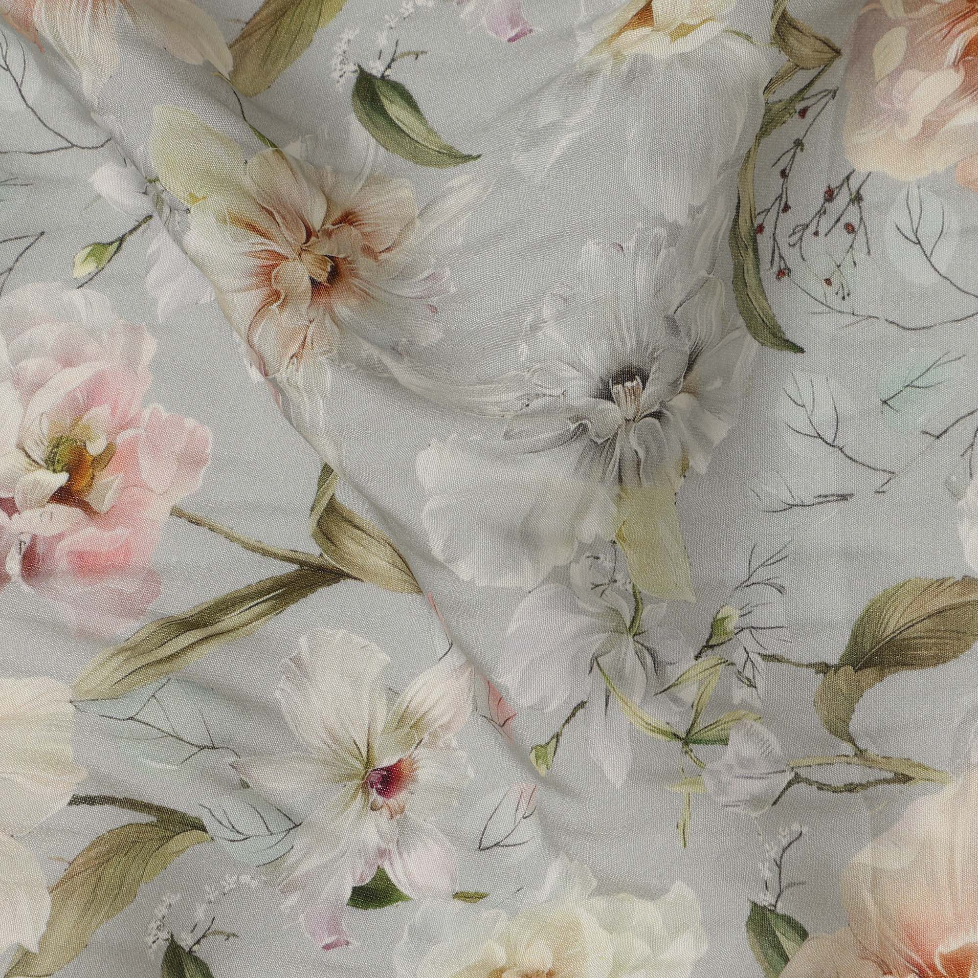 قماش كريب فيسكوز ناعم رمادي فاتح مطبوع عليه زهور بألوان مائية، عرض 110 سم، صنع في الهند - D23396