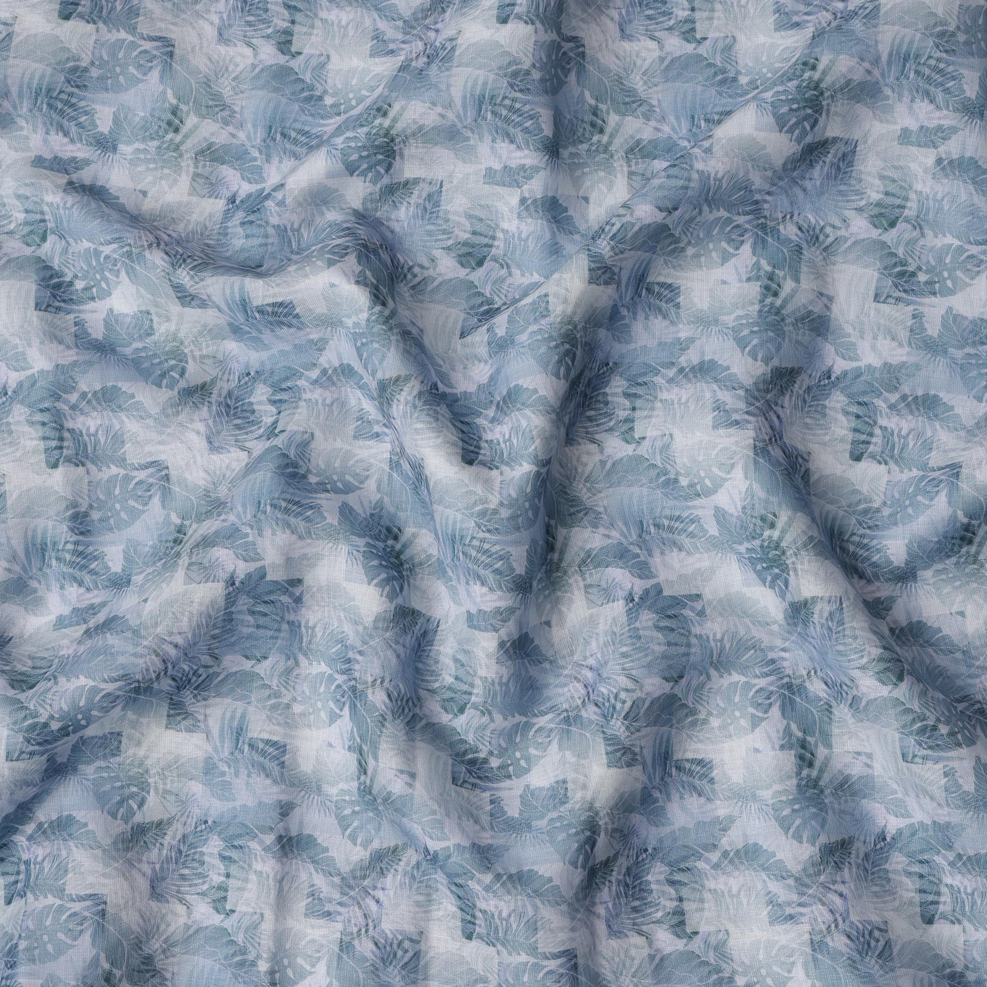 قماش كتان مخلوط بطبعة أوراق استوائية باللون الأزرق الفولاذي، تصميم متعدد الطبقات من نبات المونستيرا والنخيل بدرجات اللون الأزرق المائي والكحلي، عرض 140 سم، صنع في الهند - D23242