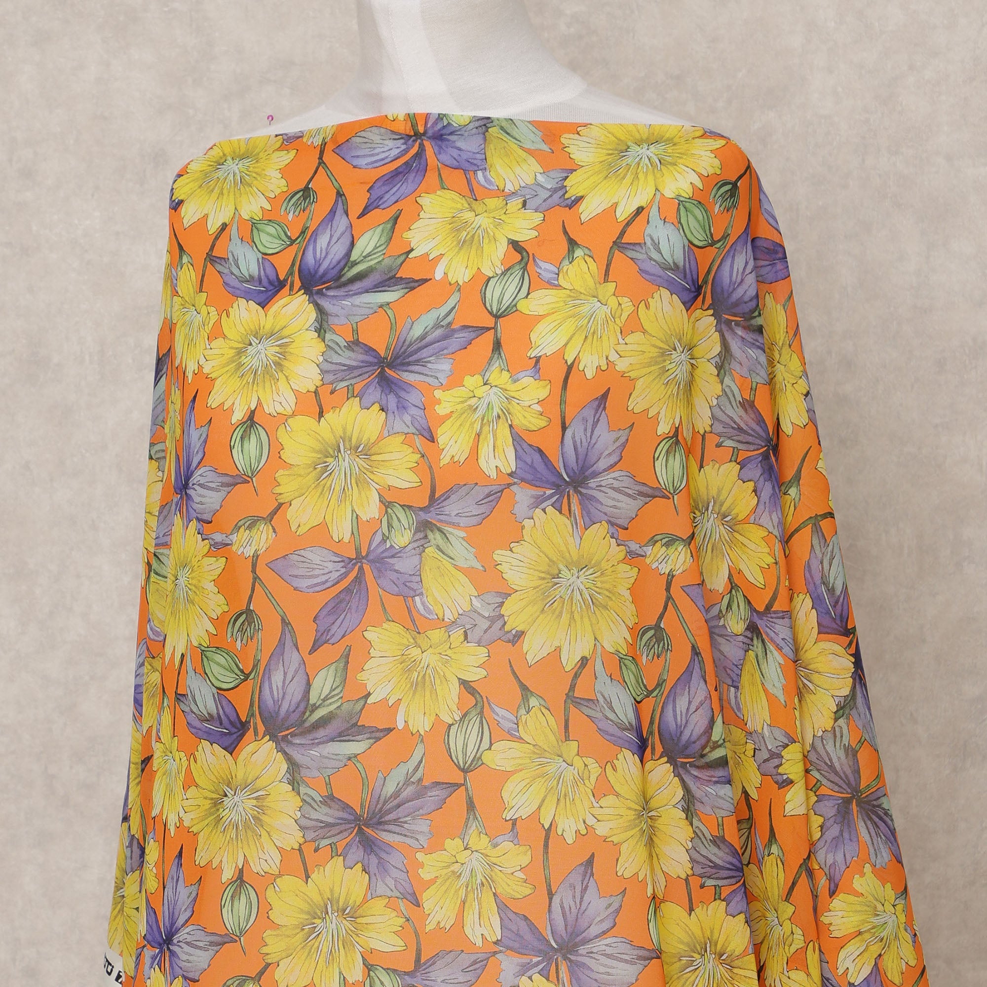 قماش ديراك من القطن الصومالي بلون الغروب البرتقالي مع طبعة زهور صفراء وأرجوانية - 3.5 متر، عرض 140 سم، صنع في إيطاليا - D24547