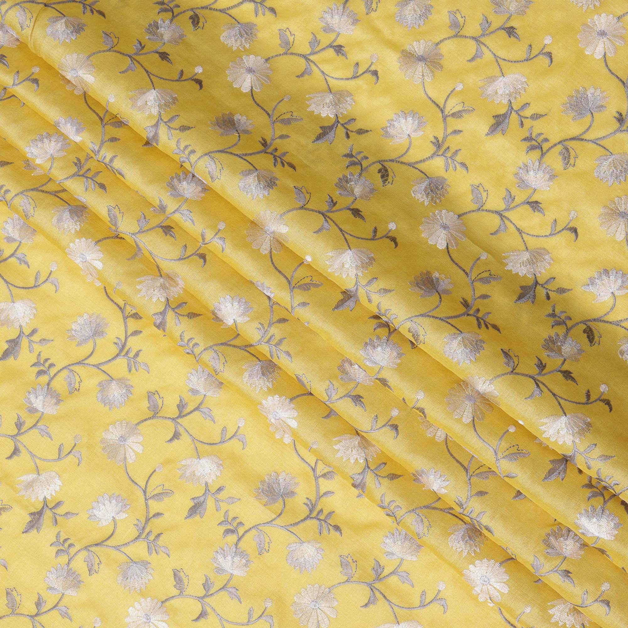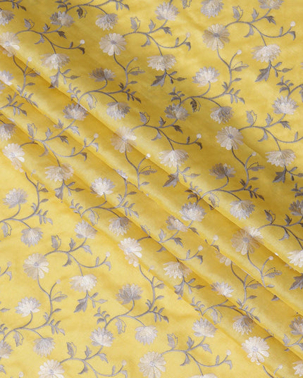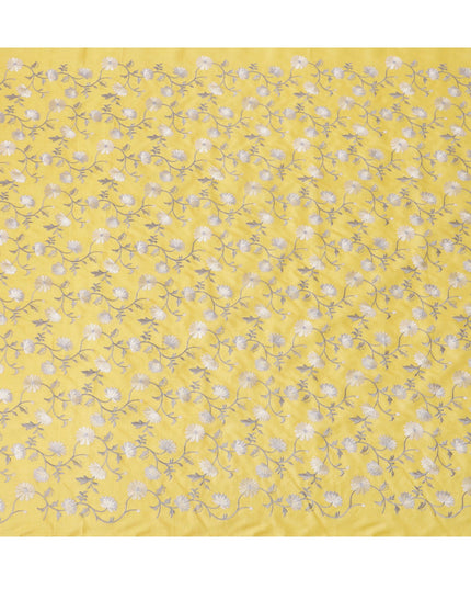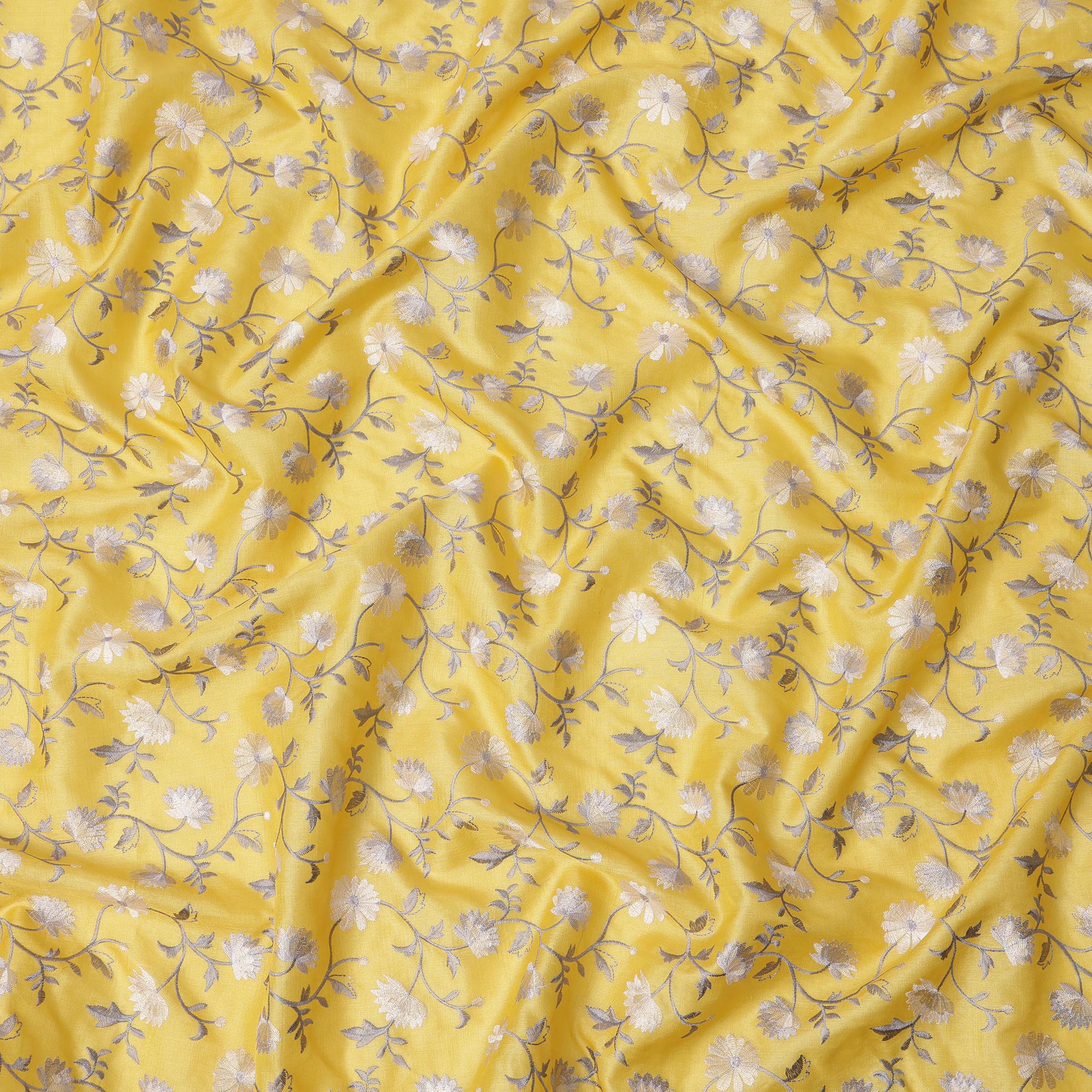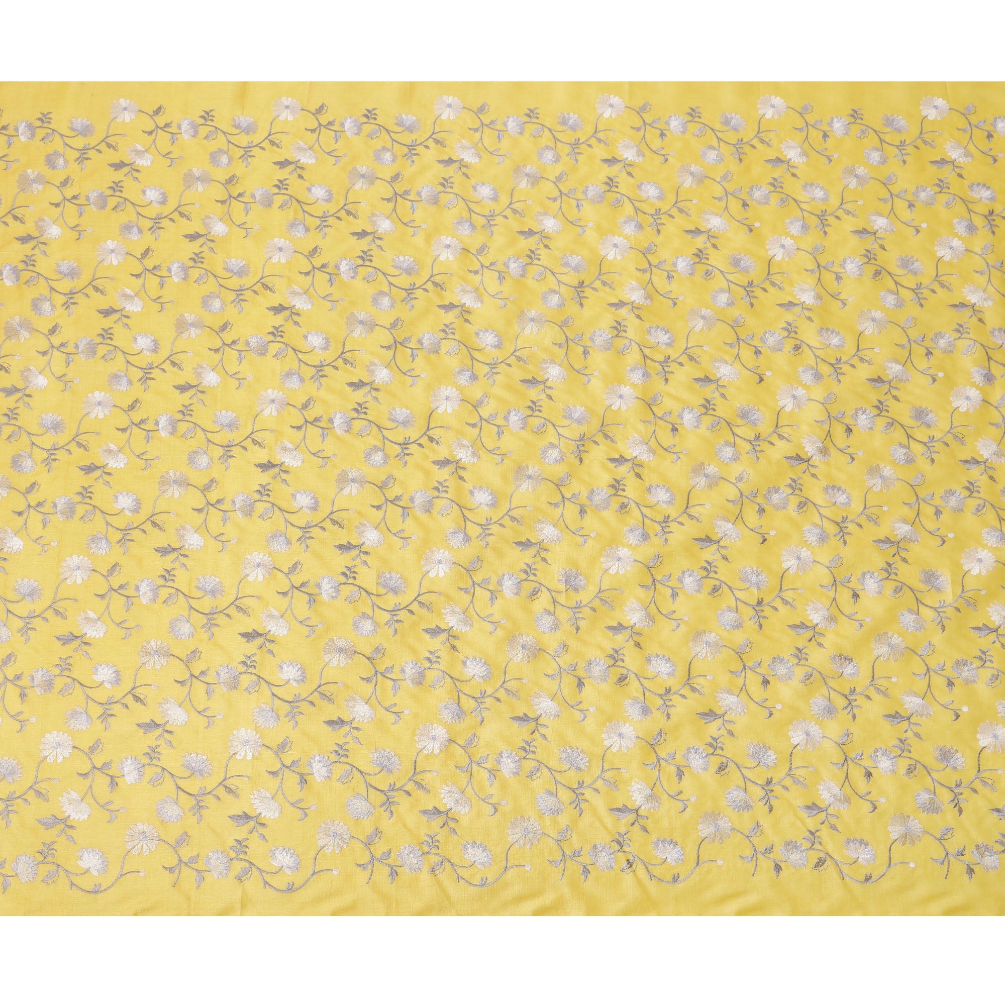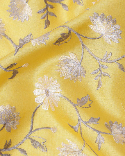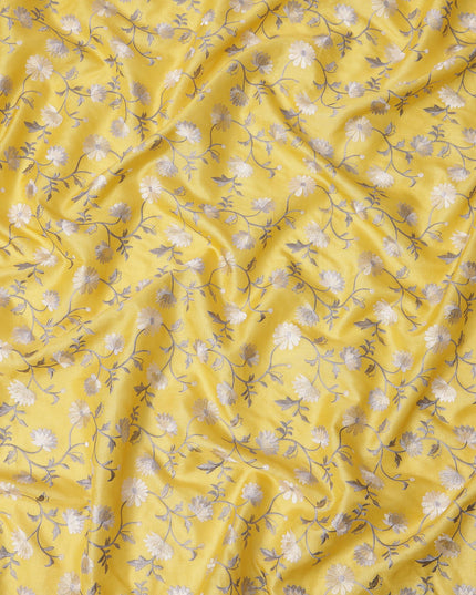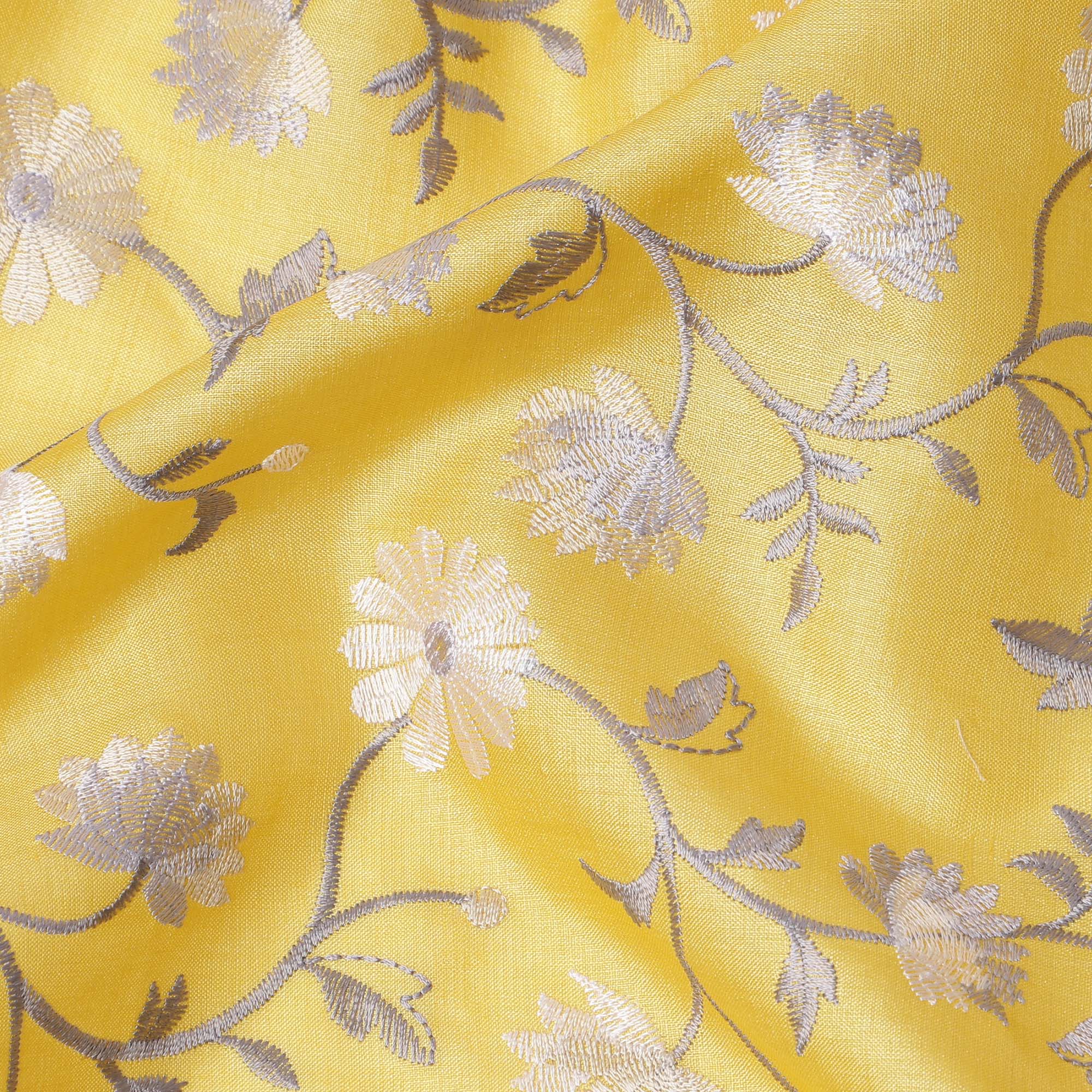 • قماش حرير توسار مطرز بنقشة زهور صفراء مشمسة، عرض 110 سم، صنع في الهند - D23373