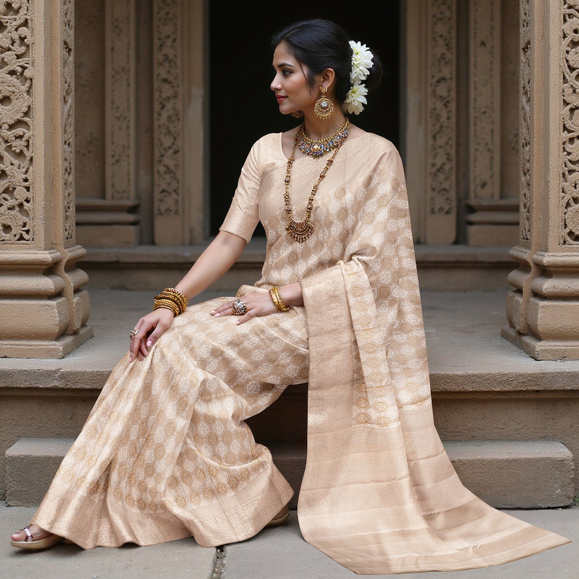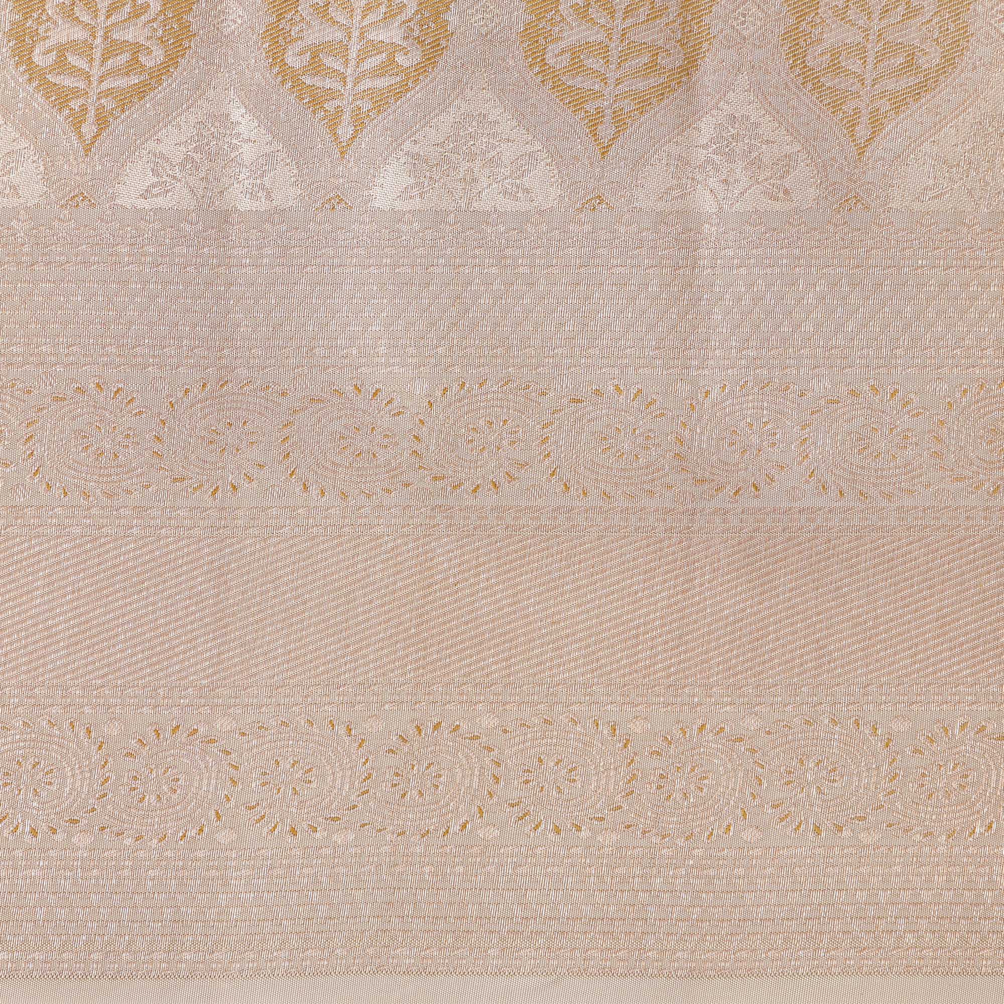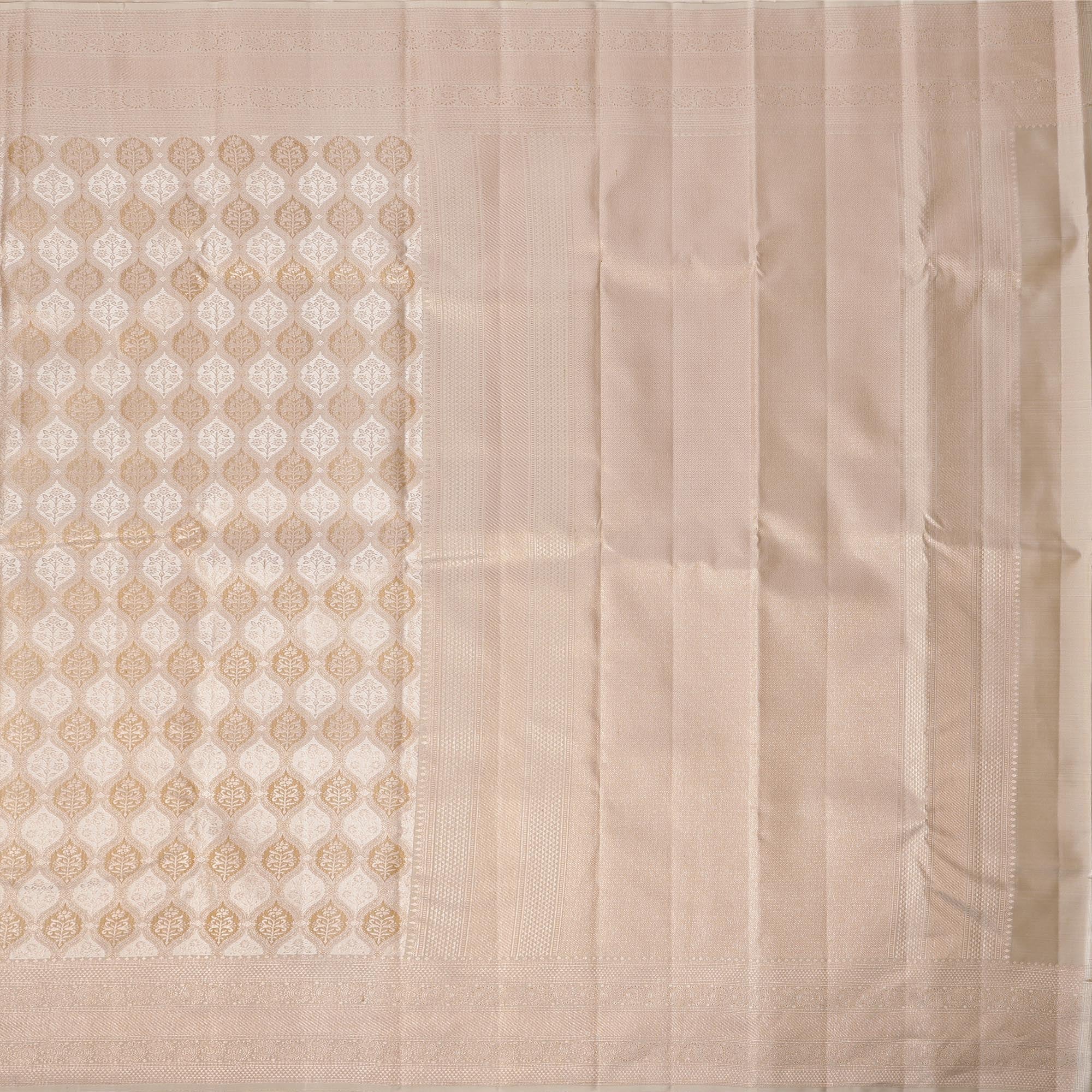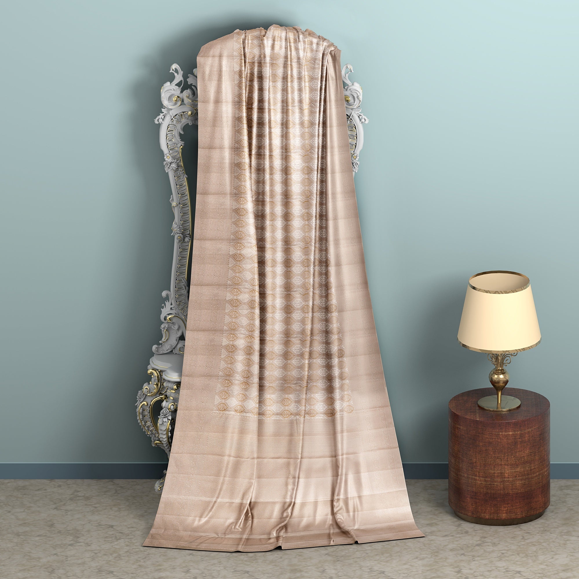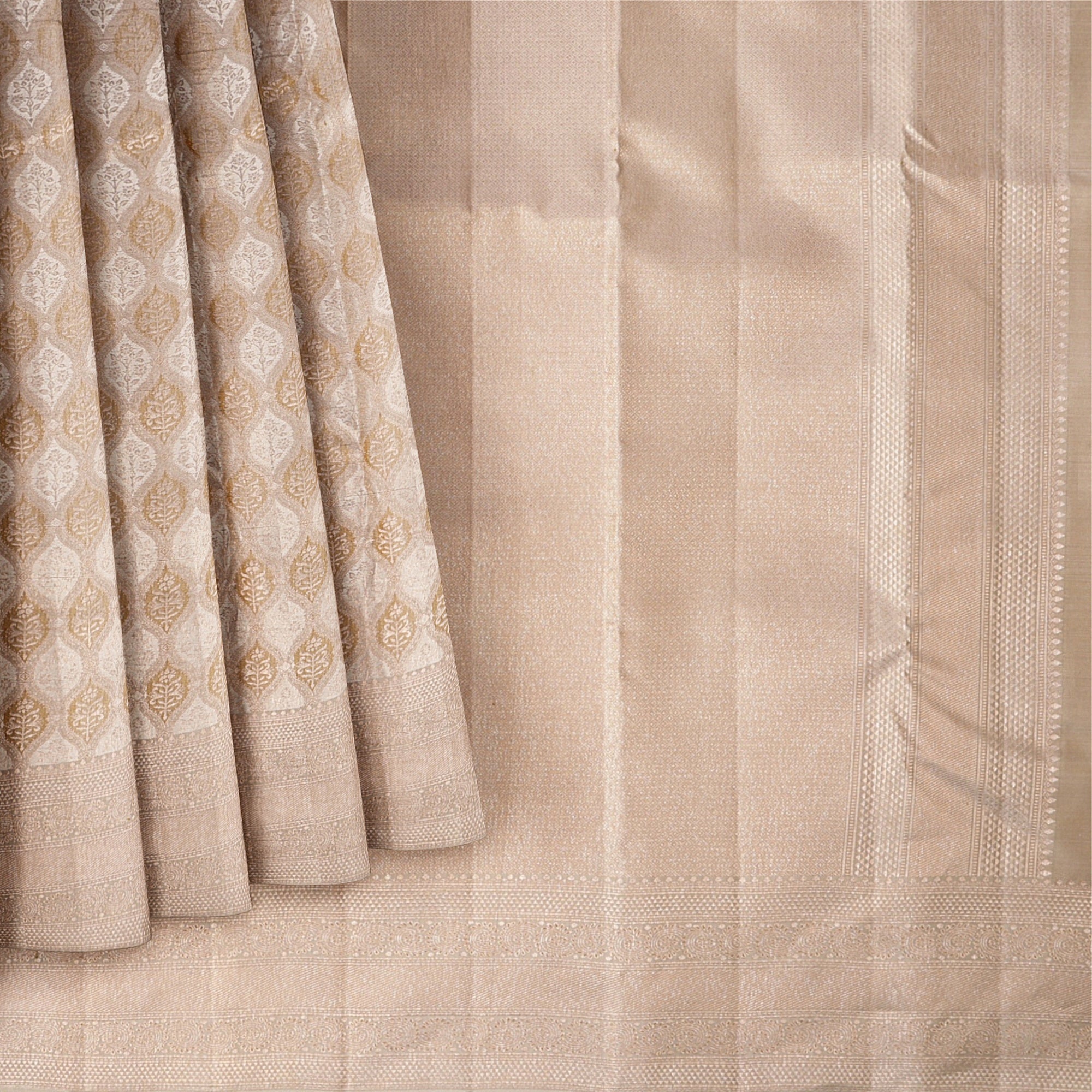 ساري كانجيفارام من الحرير الخالص بلون بني رمادي فاتح، مع لوحة دائرية منسوجة يدويًا وتفاصيل زاري رقيقة، بطول 5.5 متر مع قطعة بلوزة، من أصل هندي - D22703