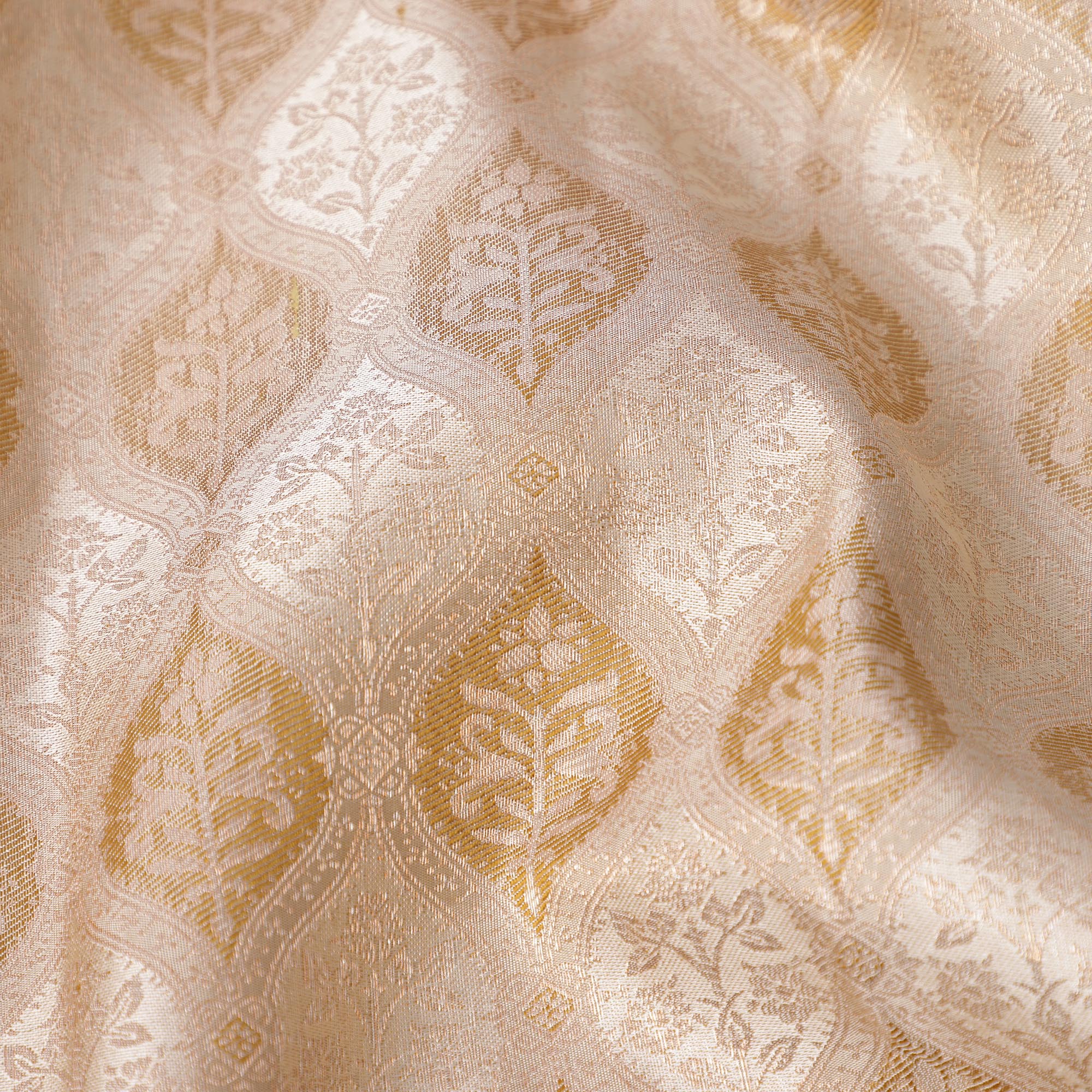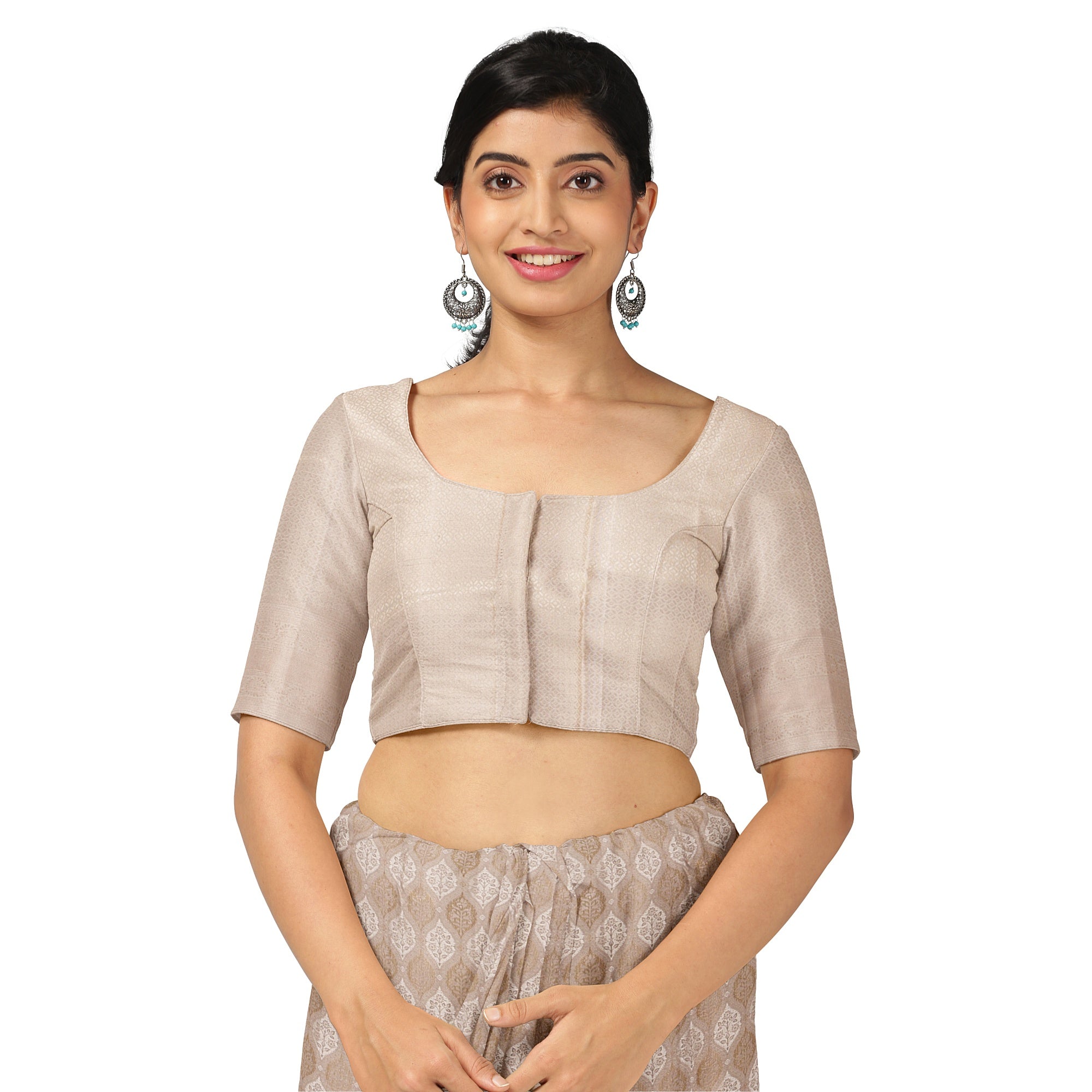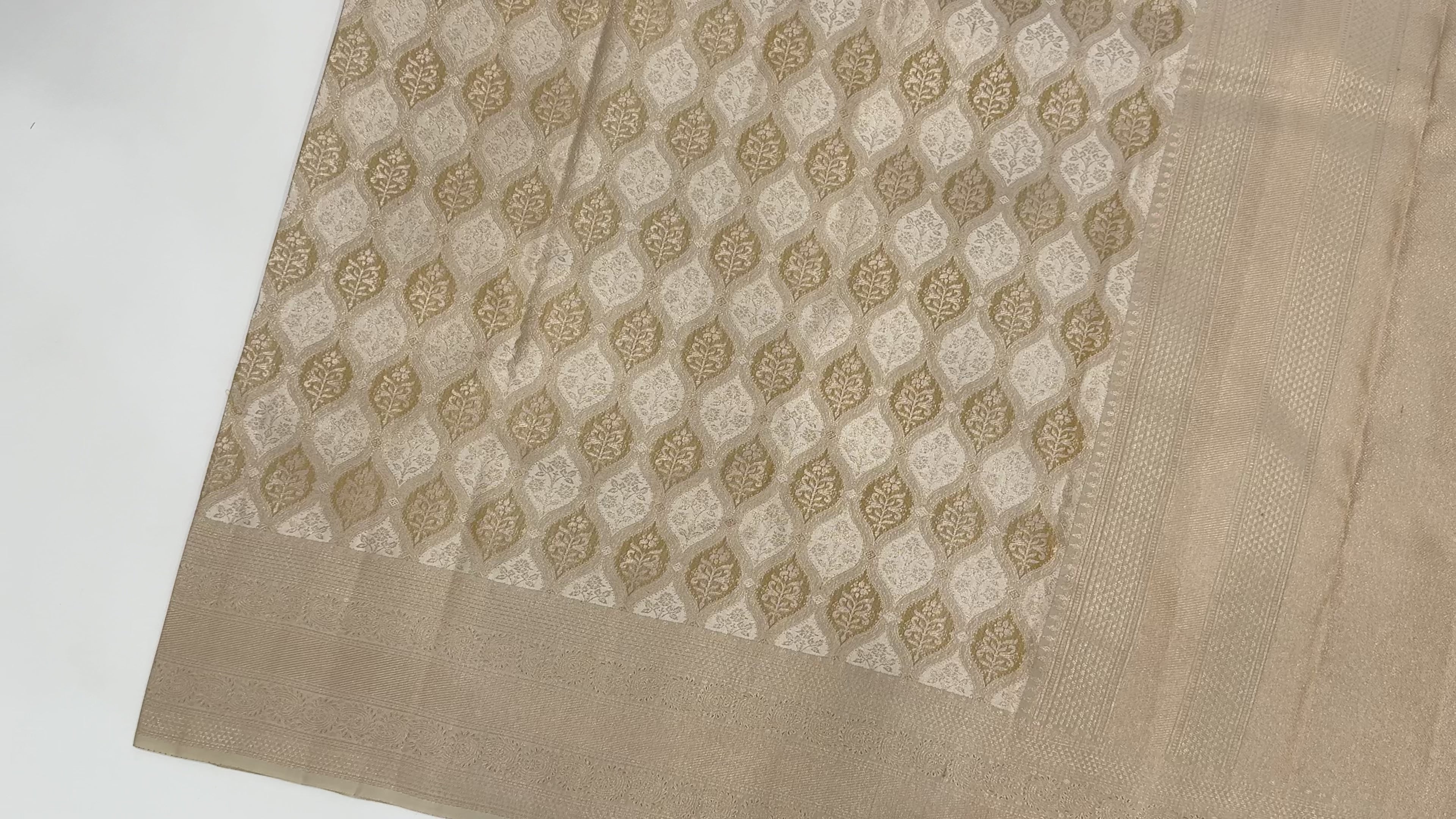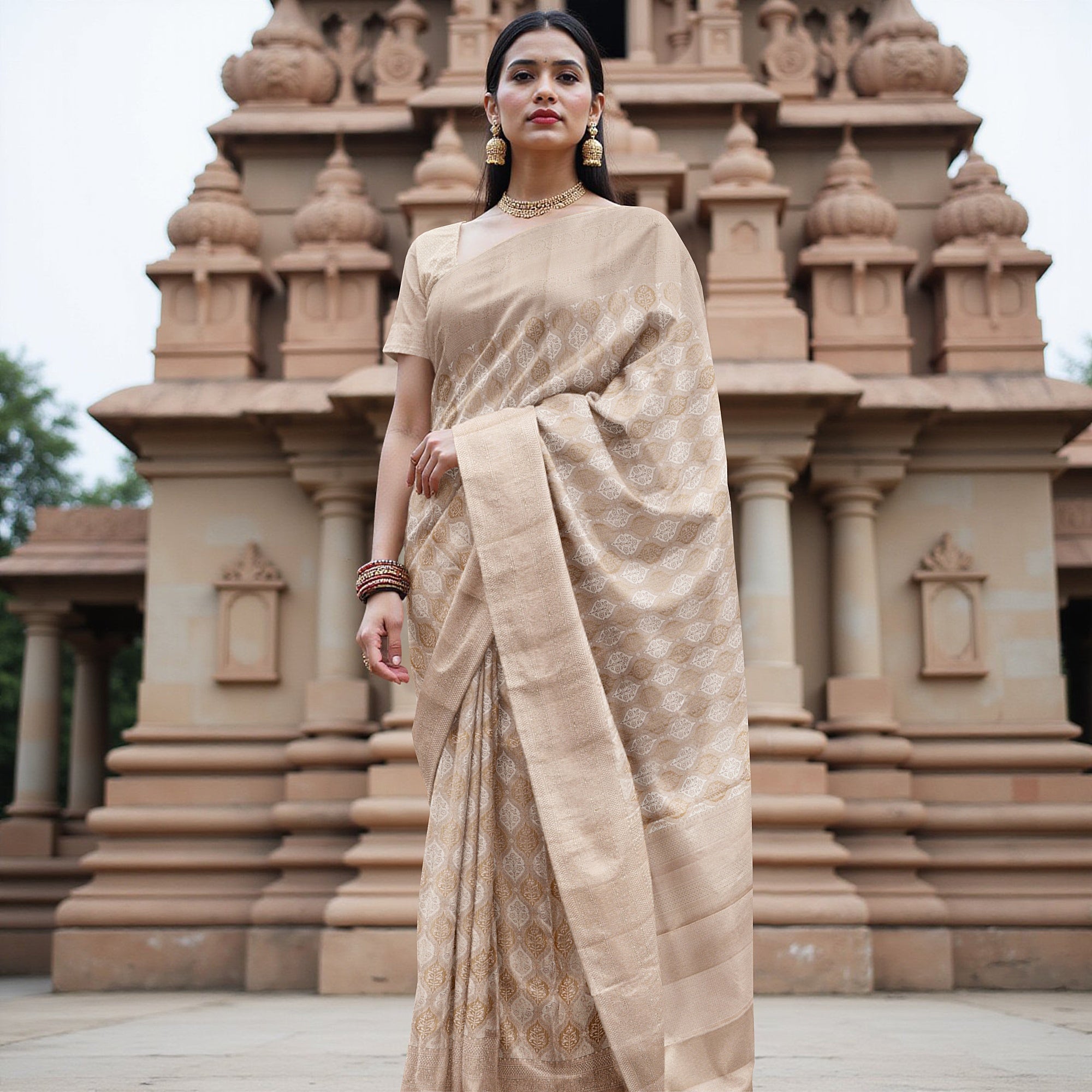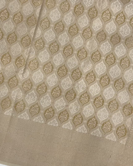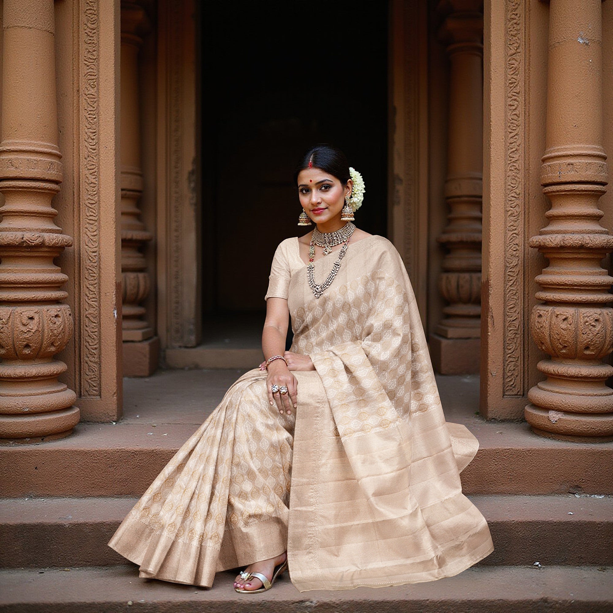 ساري كانجيفارام من الحرير الخالص بلون بني رمادي فاتح، مع لوحة دائرية منسوجة يدويًا وتفاصيل زاري رقيقة، بطول 5.5 متر مع قطعة بلوزة، من أصل هندي - D22703