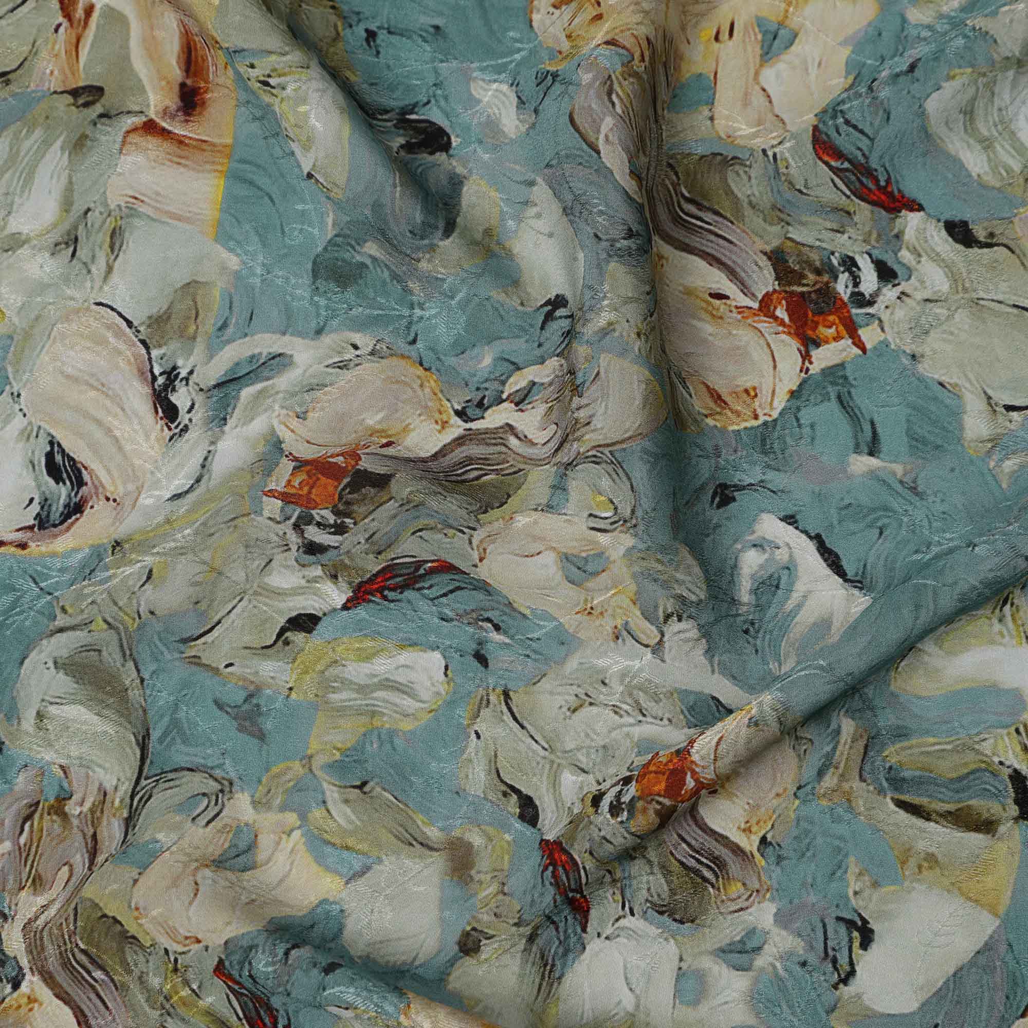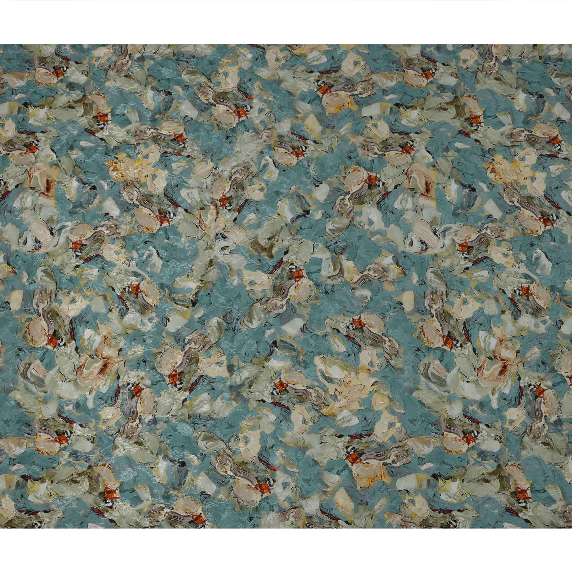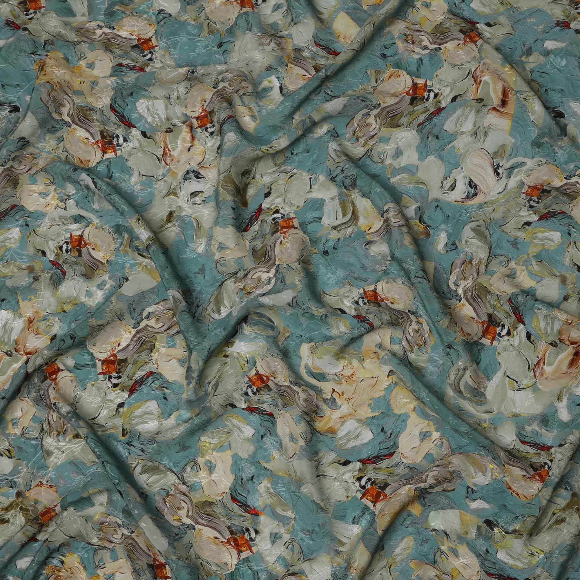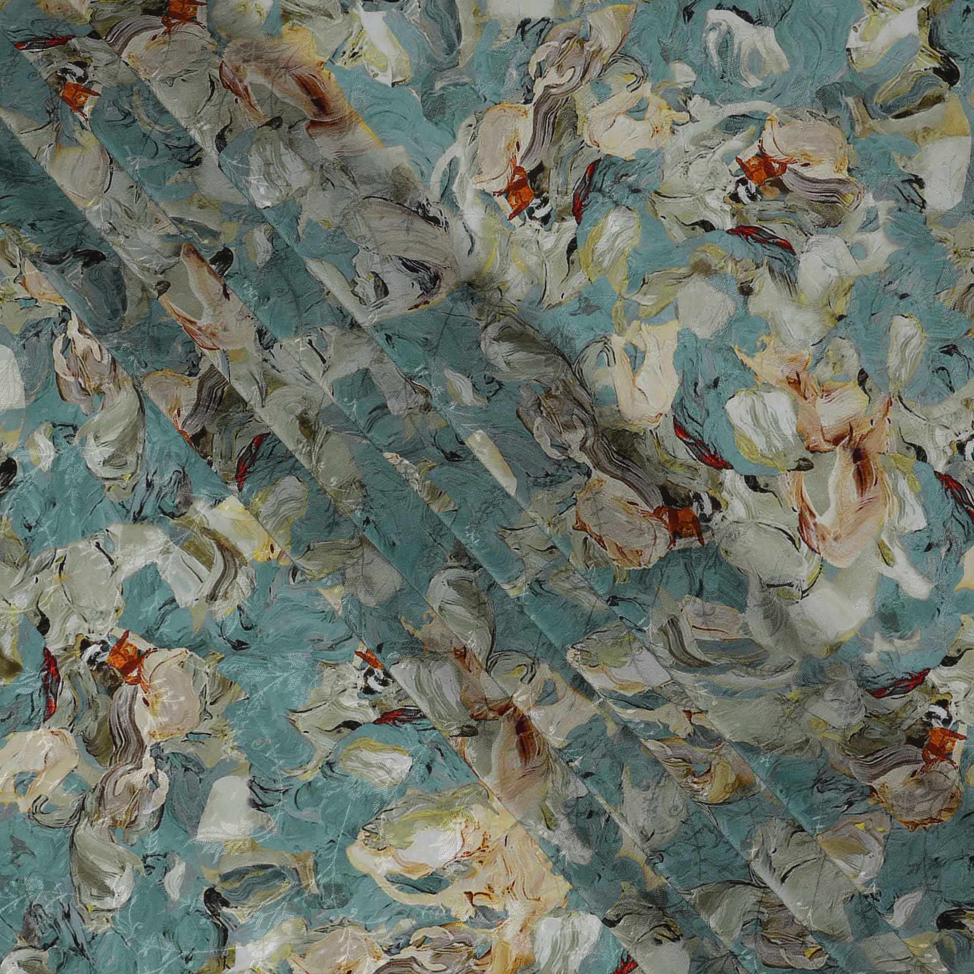 قماش كريب فيسكوز مطبوع بضربات فرشاة تجريدية بلون أزرق مخضر، بتصميم فني فني بلمسات بيج وصدئة، عرض 110 سم، صنع في الهند - D23438