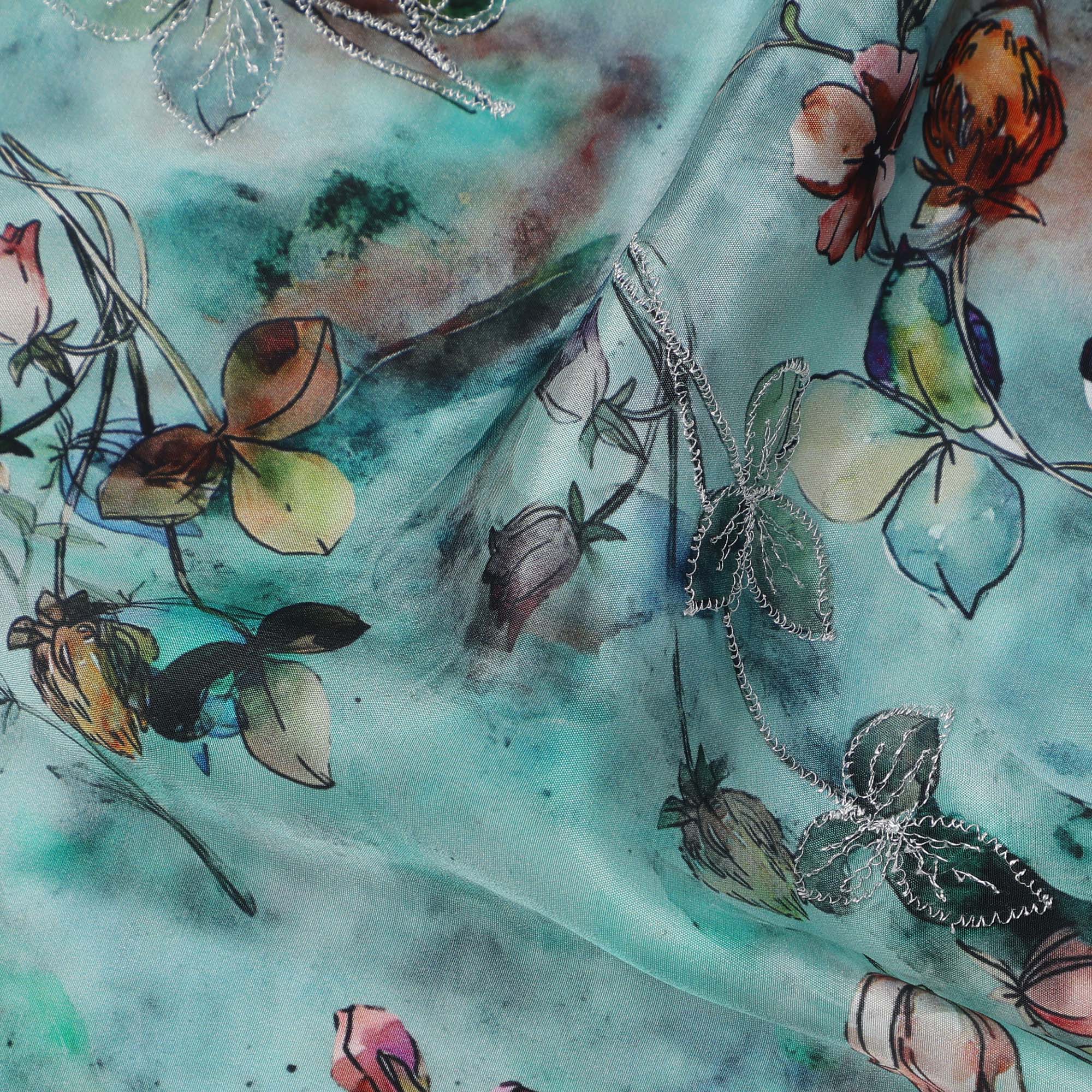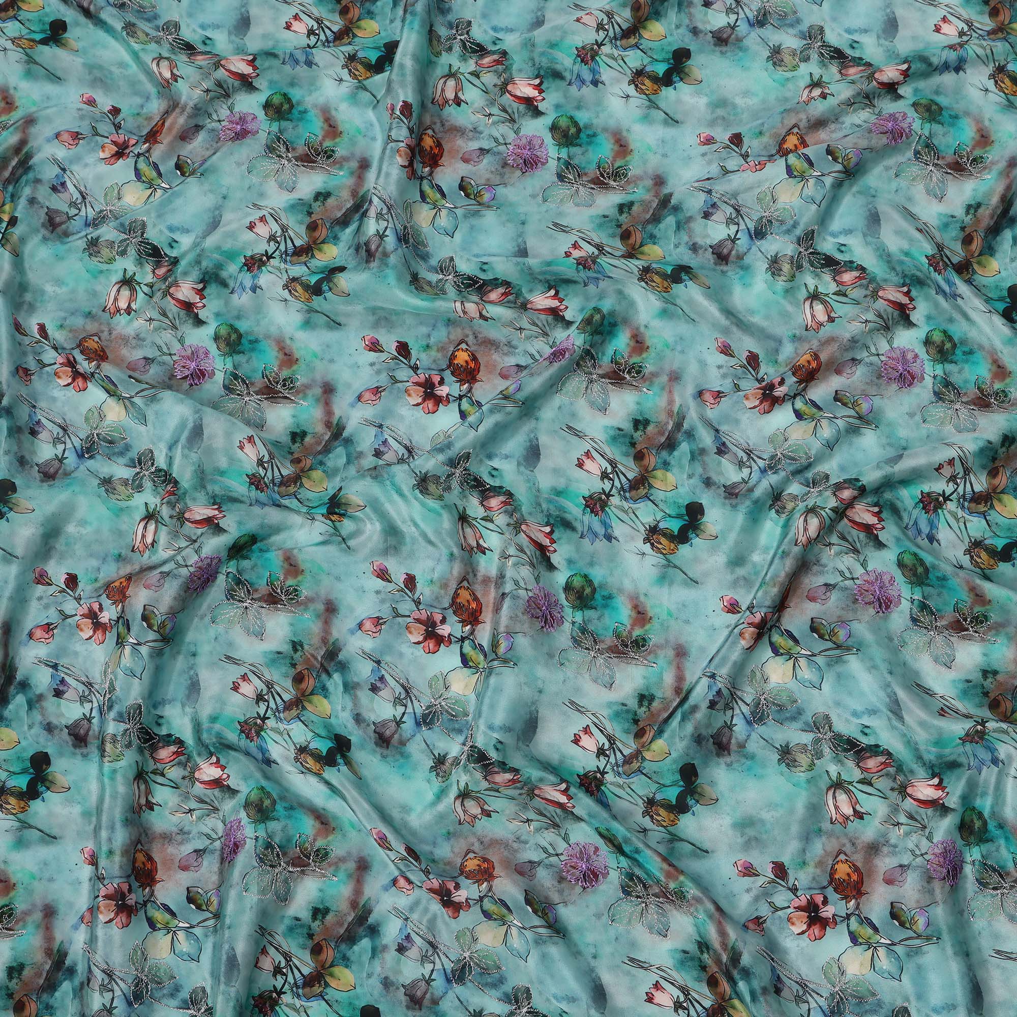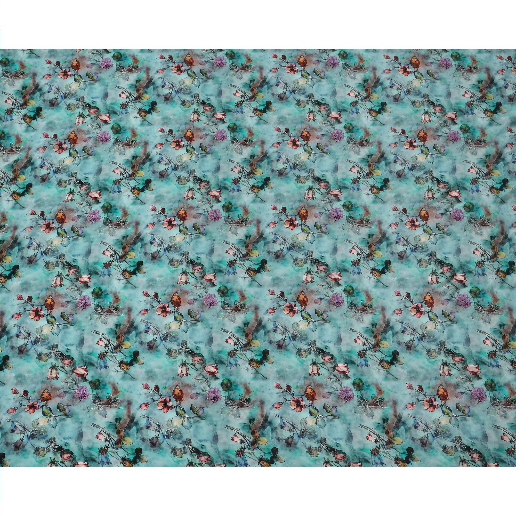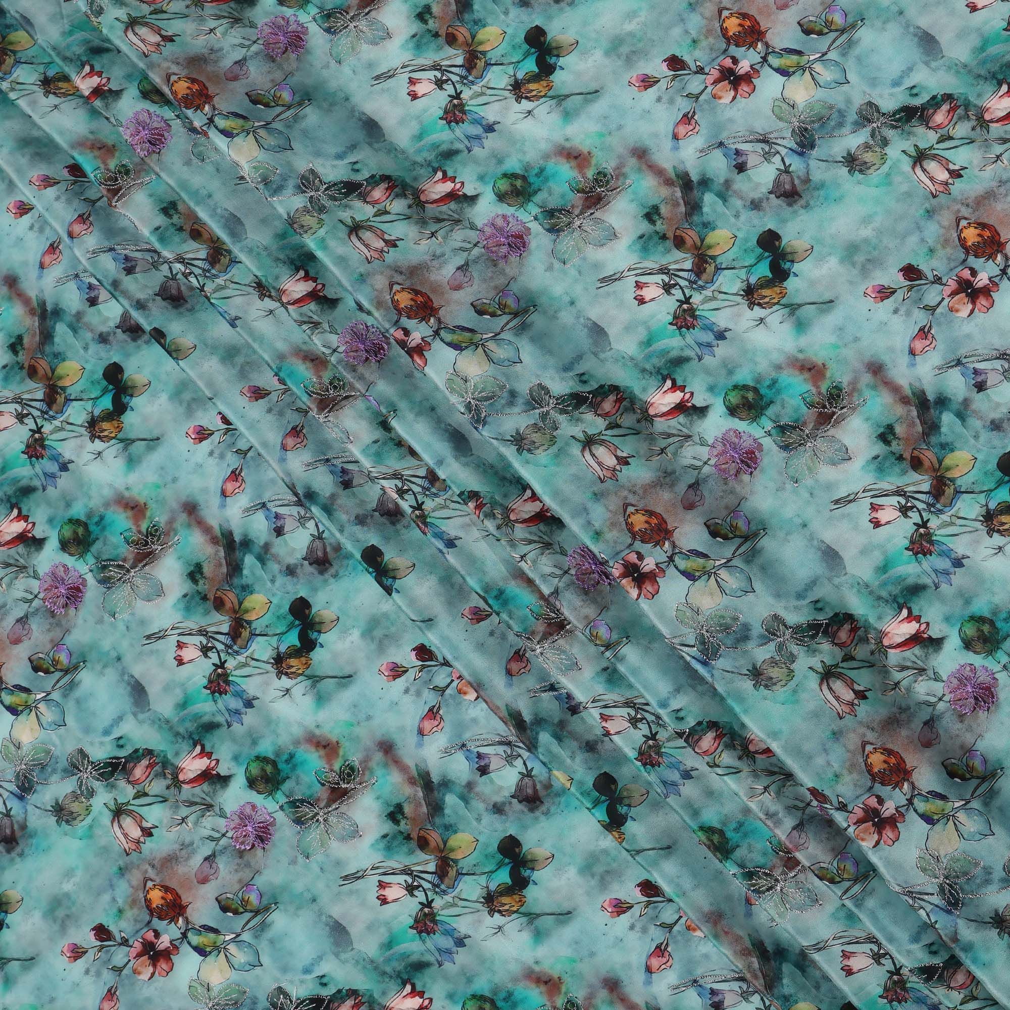 قماش فيسكوز أزرق مخضر بقاعدة بطبعة زهور وأوراق شجر تجريدية متعددة الألوان، 110 سم، الهند - D23850