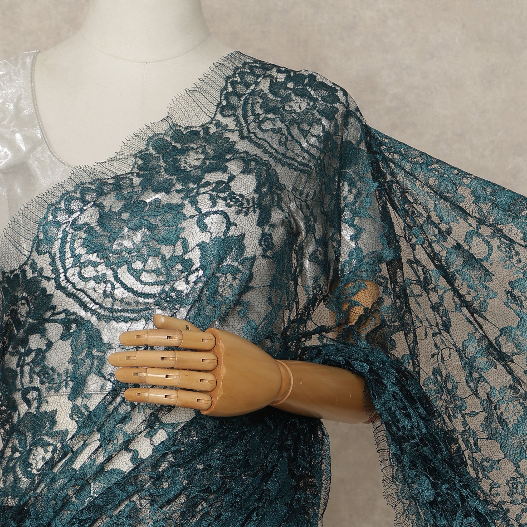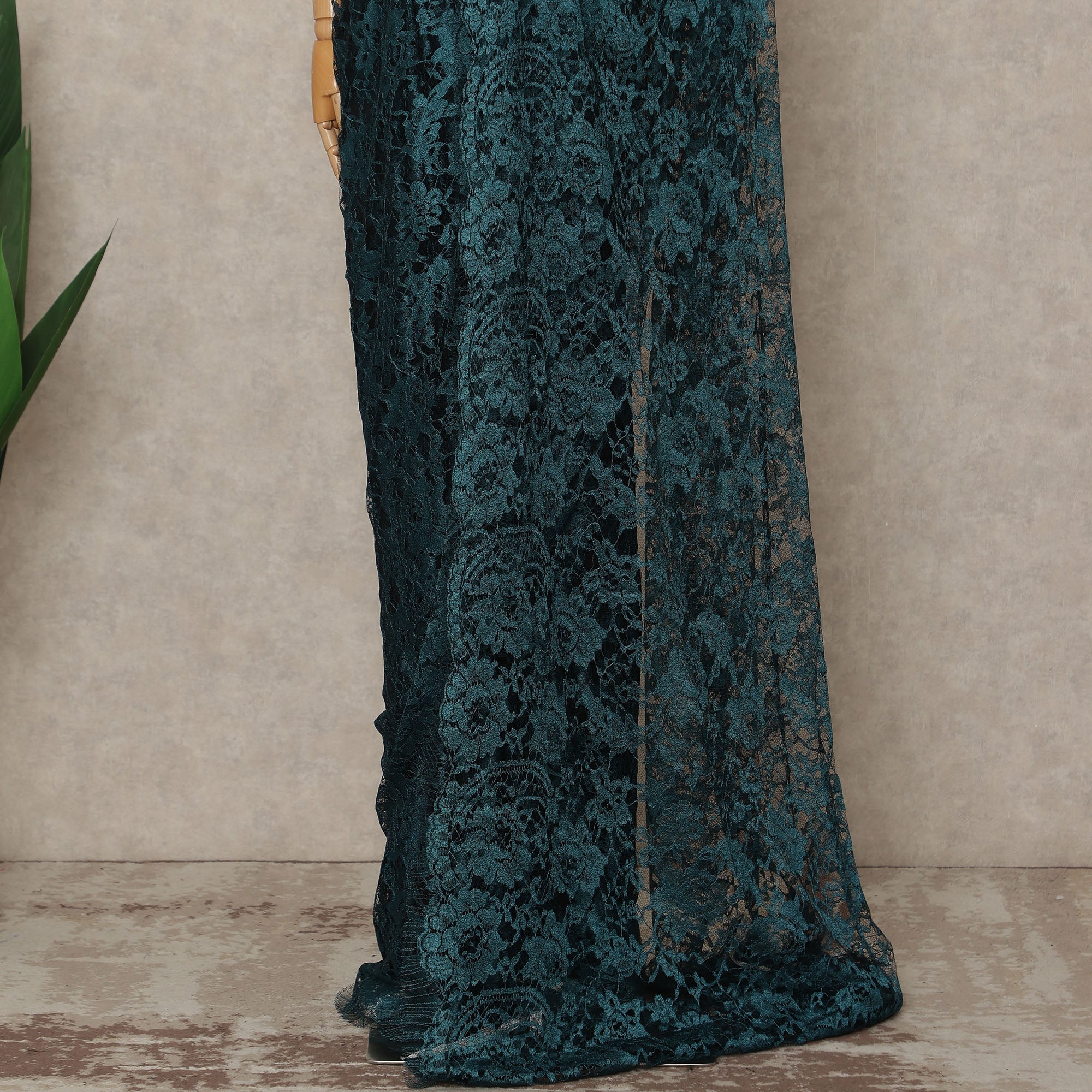 This teal blue and black premium French 2 tone Chantilly saree lace fabric is a luxurious 5.5 meter piece with a generous 110 cms width, designed to create bold and elegant occasion wear. Crafted on a fine sheer net base, it features intricate floral Chantilly patterns enhanced with a rich two tone effect that adds striking depth and dimension. The contrast of deep teal blue with black gives the fabric a refined and contemporary appeal, making it ideal for evening sarees, receptions, festive celebrations, and designer ensembles. This unstitched saree lace fabric allows complete customization to suit your styling preferences, and blouse fabric is not included.