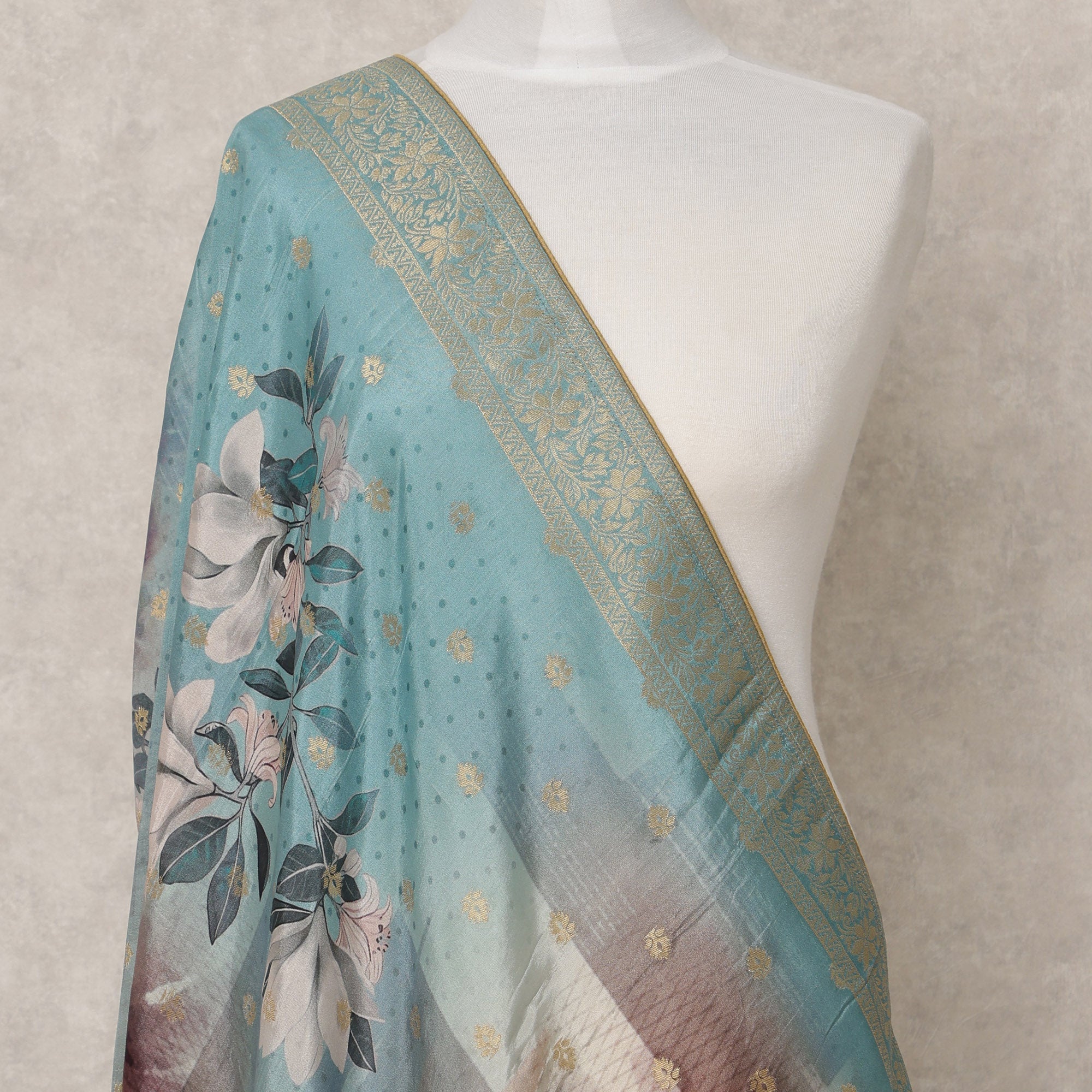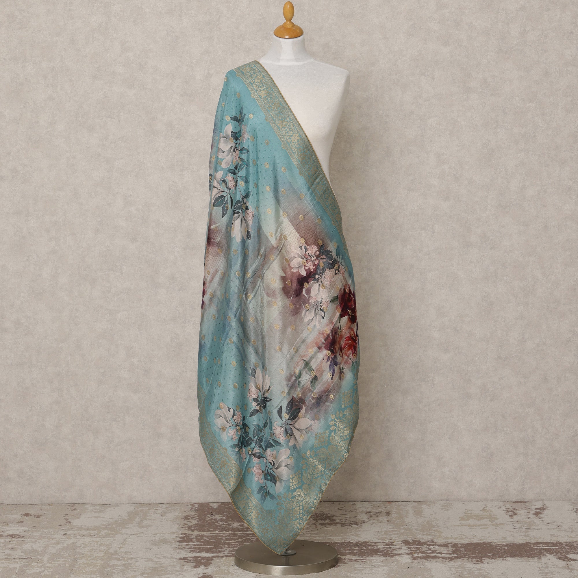 دوباتا من قماش بروكيد صناعي أزرق مخضر بطبعة زهور متعددة الألوان وحواف ذهبية، 210 × 80 سم، صنع في الهند - D24122