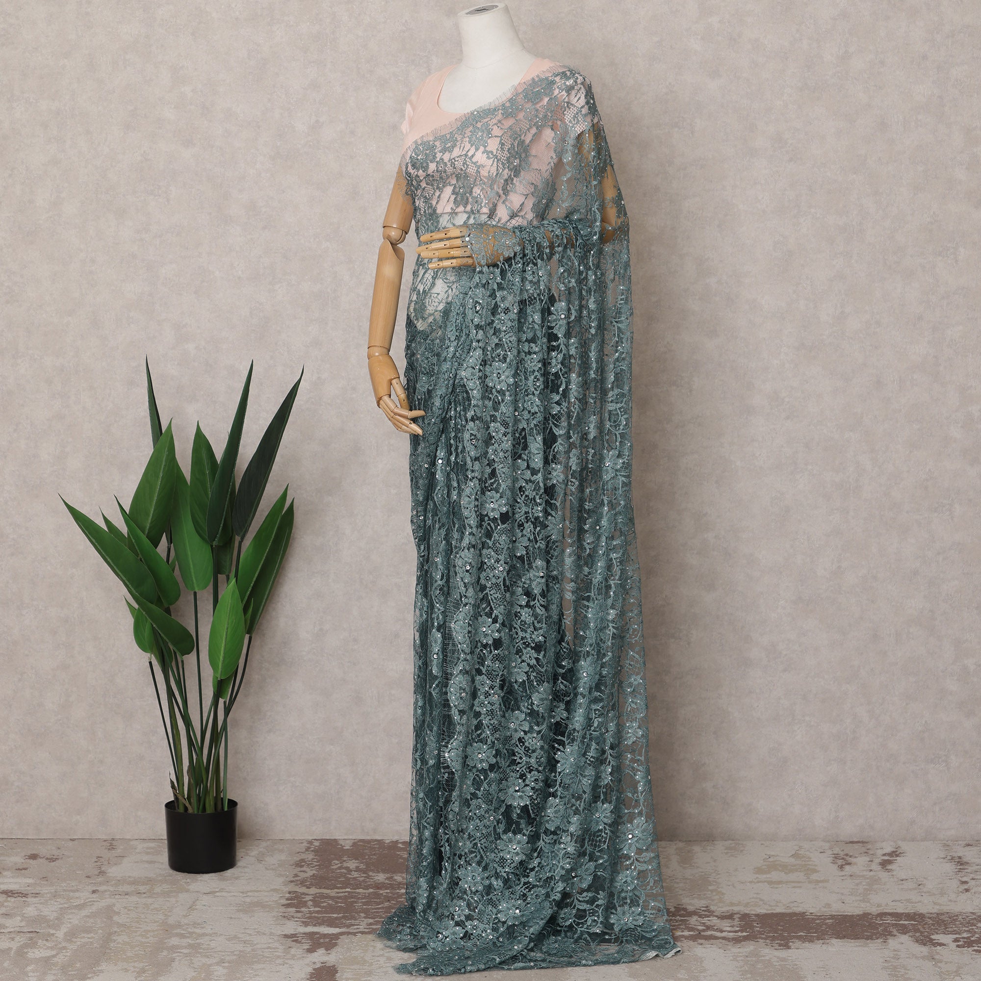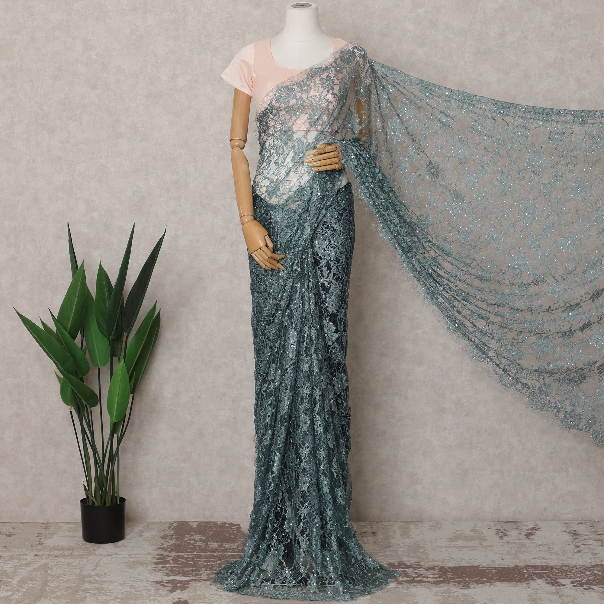 ادخل إلى الأناقة الراقية مع قماش الساري الفرنسي الفاخر ثنائي اللون من الدانتيل الشانتيلي باللون الرمادي المخضر، قطعة فاخرة تجمع بين الألوان العصرية والحرفية الخالدة. يبلغ طول هذا القماش حوالي 5.5 متر وعرضه 110 سم، وهو مصنوع بخبرة في فرنسا ويتميز بقاعدة ثنائية اللون رمادية مخضرة هادئة فوق دانتيل شفاف رقيق. تكتمل الزخارف الزهرية المعقدة بأحجار شفافة مزخرفة يدويًا تتلألأ برقة عبر القماش، مما يجعله خيارًا مثاليًا للملابس الاحتفالية الأنيقة أو حفلات الاستقبال أو الأزياء العرقية الراقية. تعزز الحواف الصدفية من لمسته الراقية بينما يضمن الملمس خفيف الوزن ثنية ناعمة وأنيقة. يمنحك هذا القماش غير مخيط للتخصيص الكامل حرية الإبداع في تصميمه على طريقتك. قطعة البلوزة غير متضمنة. التنظيف الجاف فقط للحفاظ على اللمعان والتفاصيل الدقيقة والسلامة الهيكلية للدانتيل. تسوق عبر الإنترنت الآن وقم بترقية خزانة ملابسك العرقية مع الأناقة الرائعة للدانتيل الفرنسي باللون الرمادي الفيروزي.