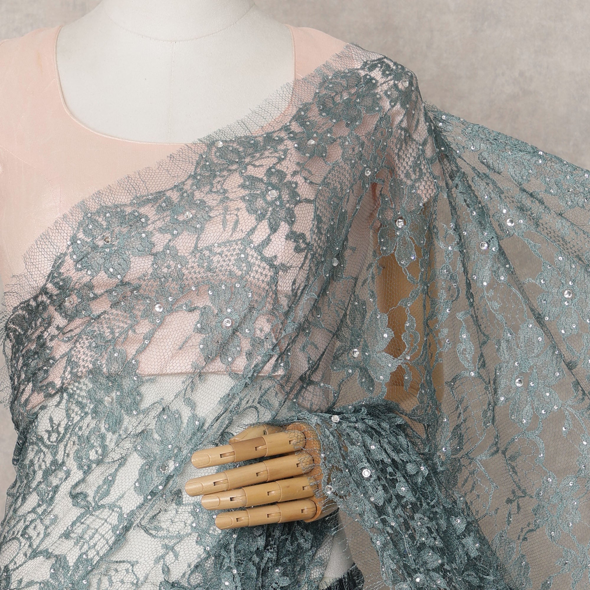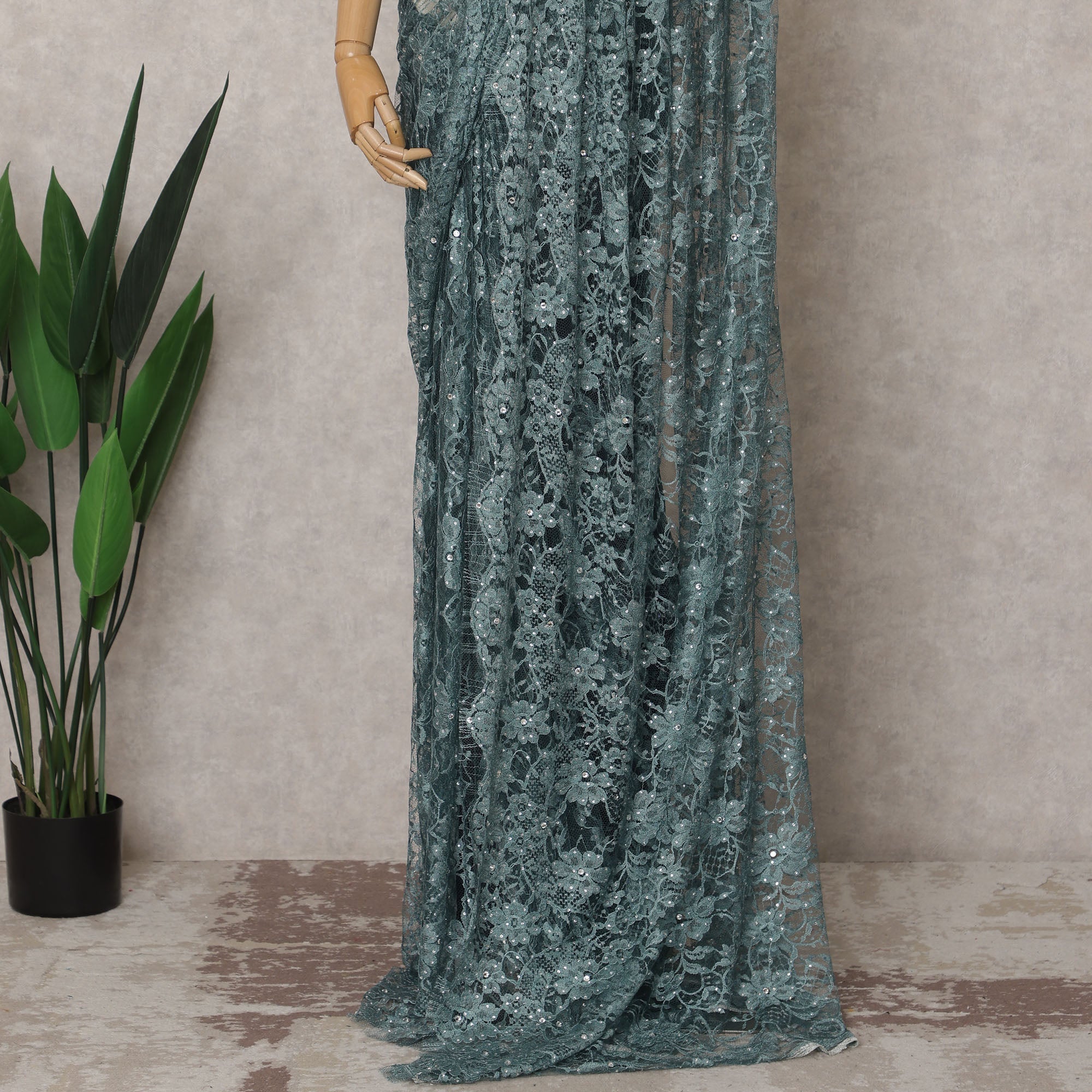 ادخل إلى الأناقة الراقية مع قماش الساري الفرنسي الفاخر ثنائي اللون من الدانتيل الشانتيلي باللون الرمادي المخضر، قطعة فاخرة تجمع... اقرأ أكثر اقرأ أكثر