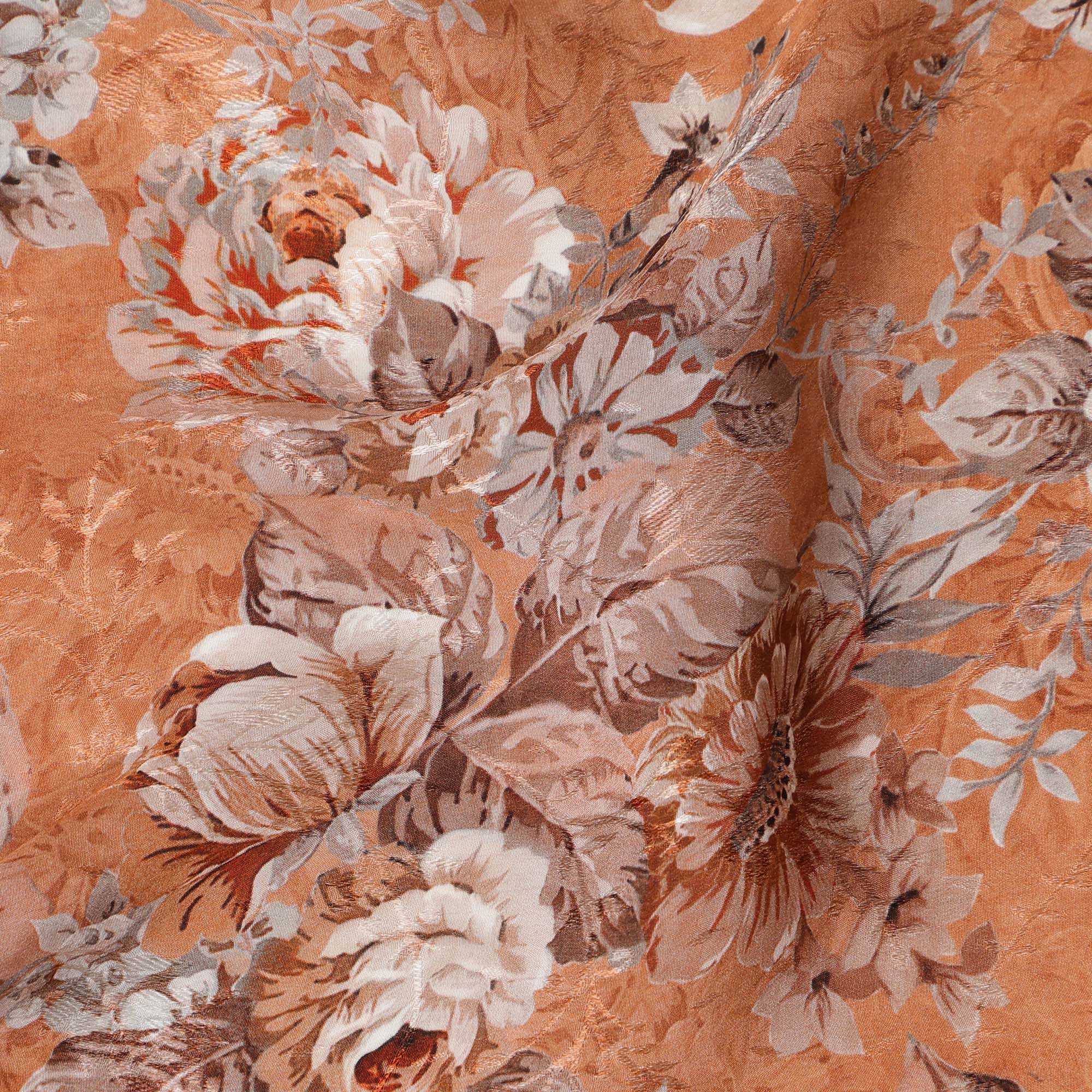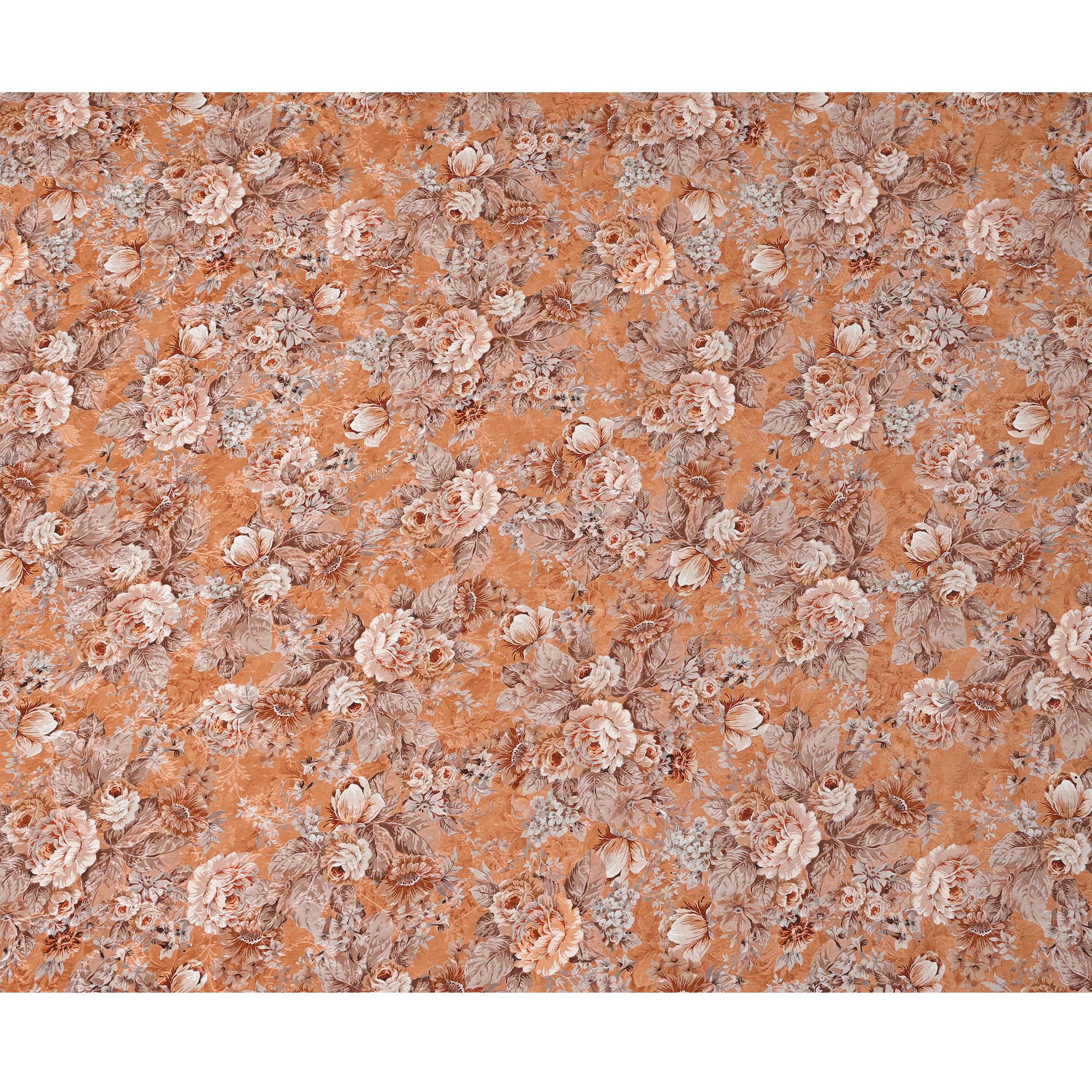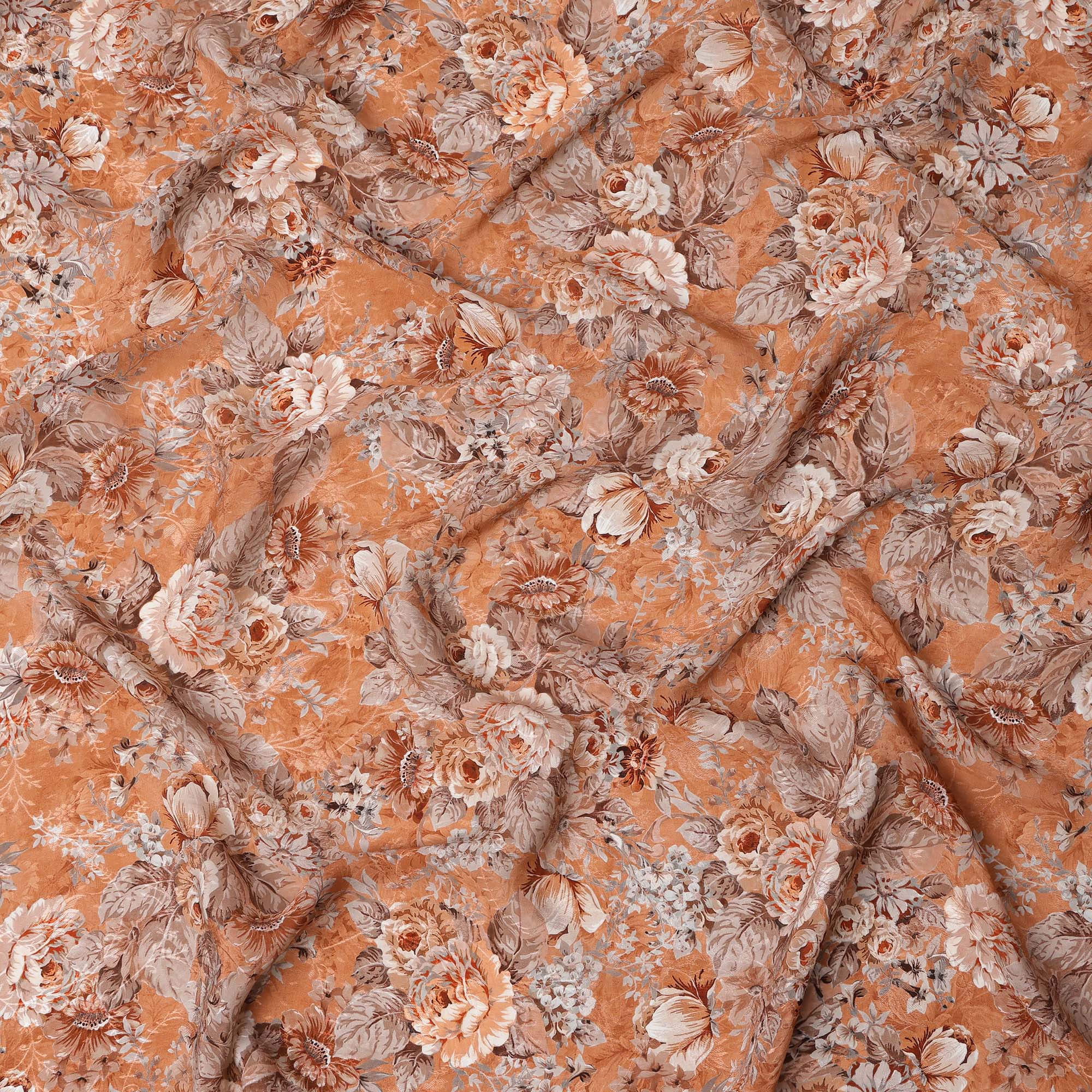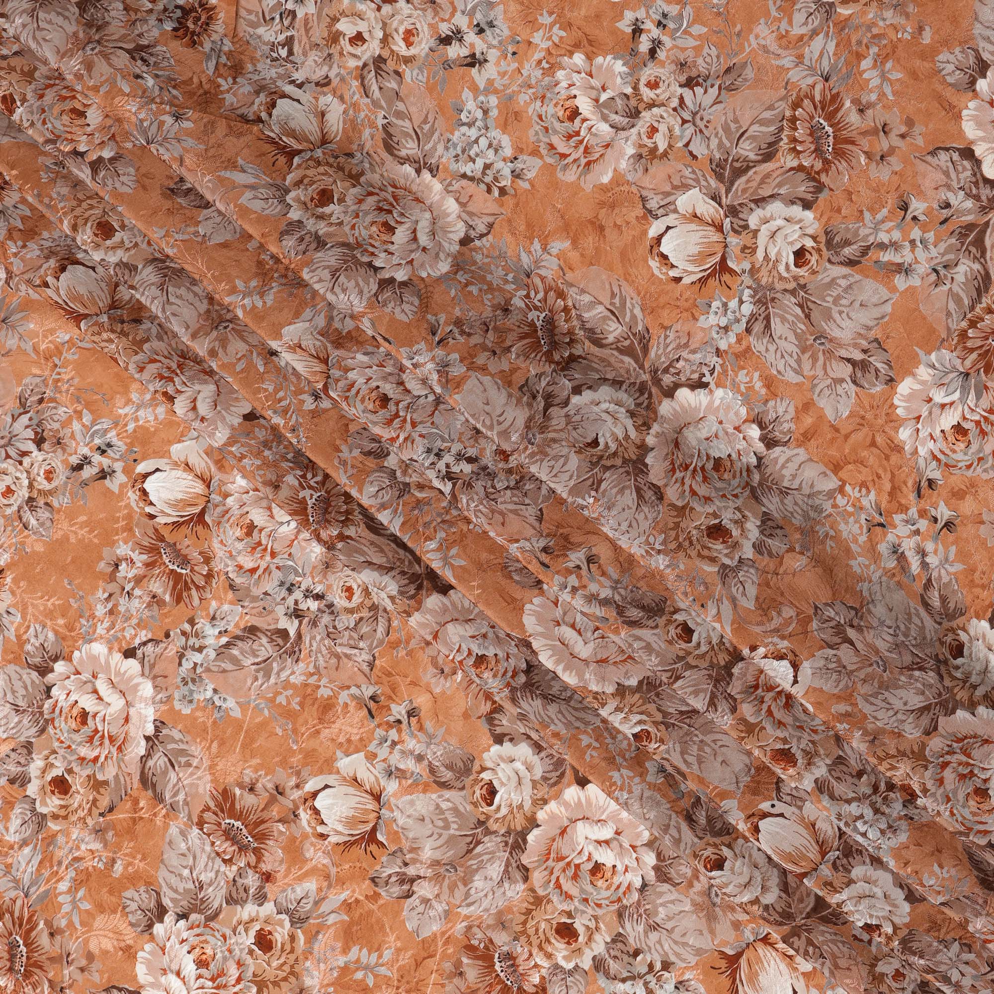 قماش كريب فيسكوز مطبوع عليه زهور وردية بنية اللون، قاعدة من الطين، عرض 110 سم، الهند - D23423
