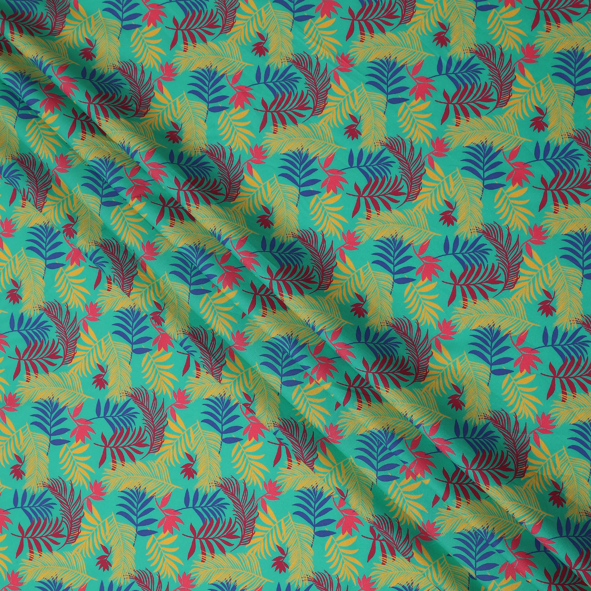 Turquoise Green Tropical Leaf Printed Premium Spanish 100% Cotton Voile Fabric Soft Lightweight Breathable Apparel Craft Textile 150 Cms Wide, Made in Spain-D27502
