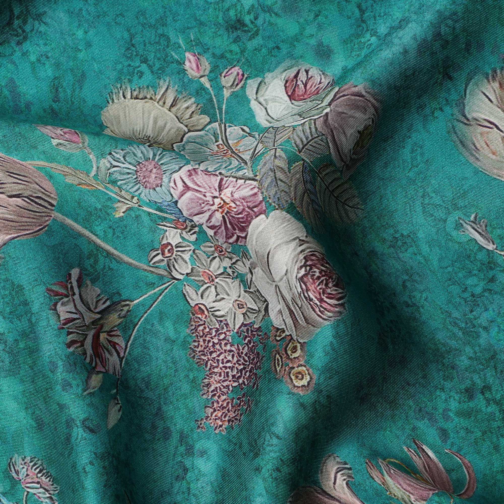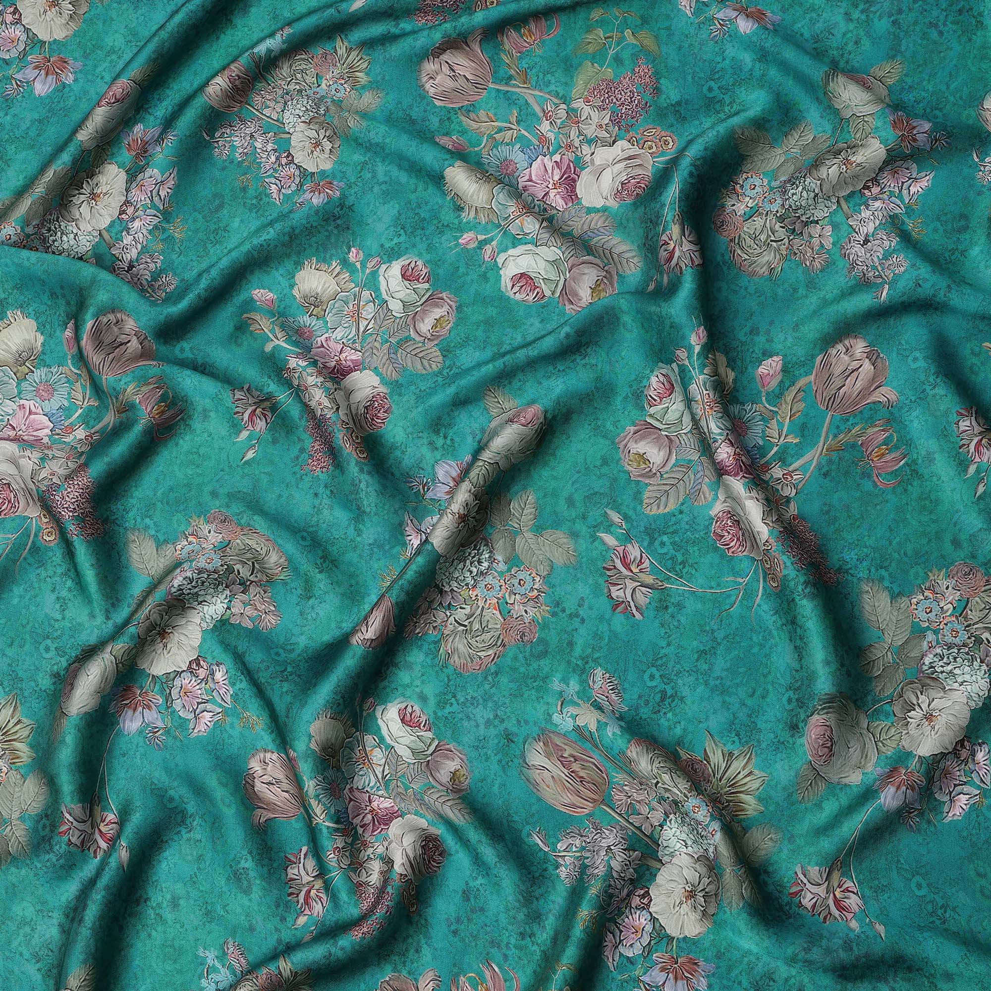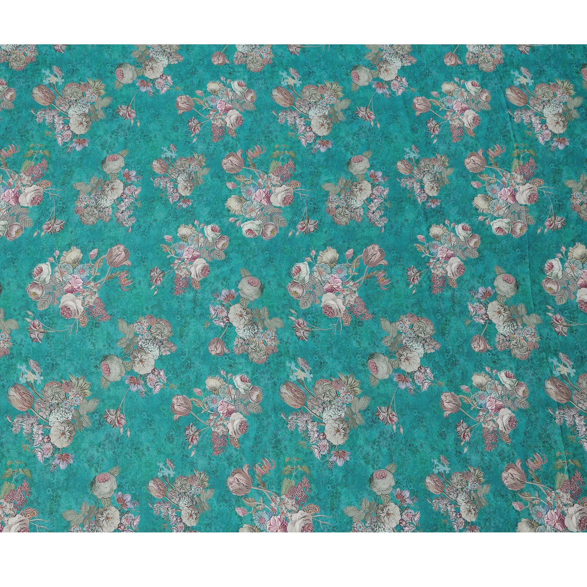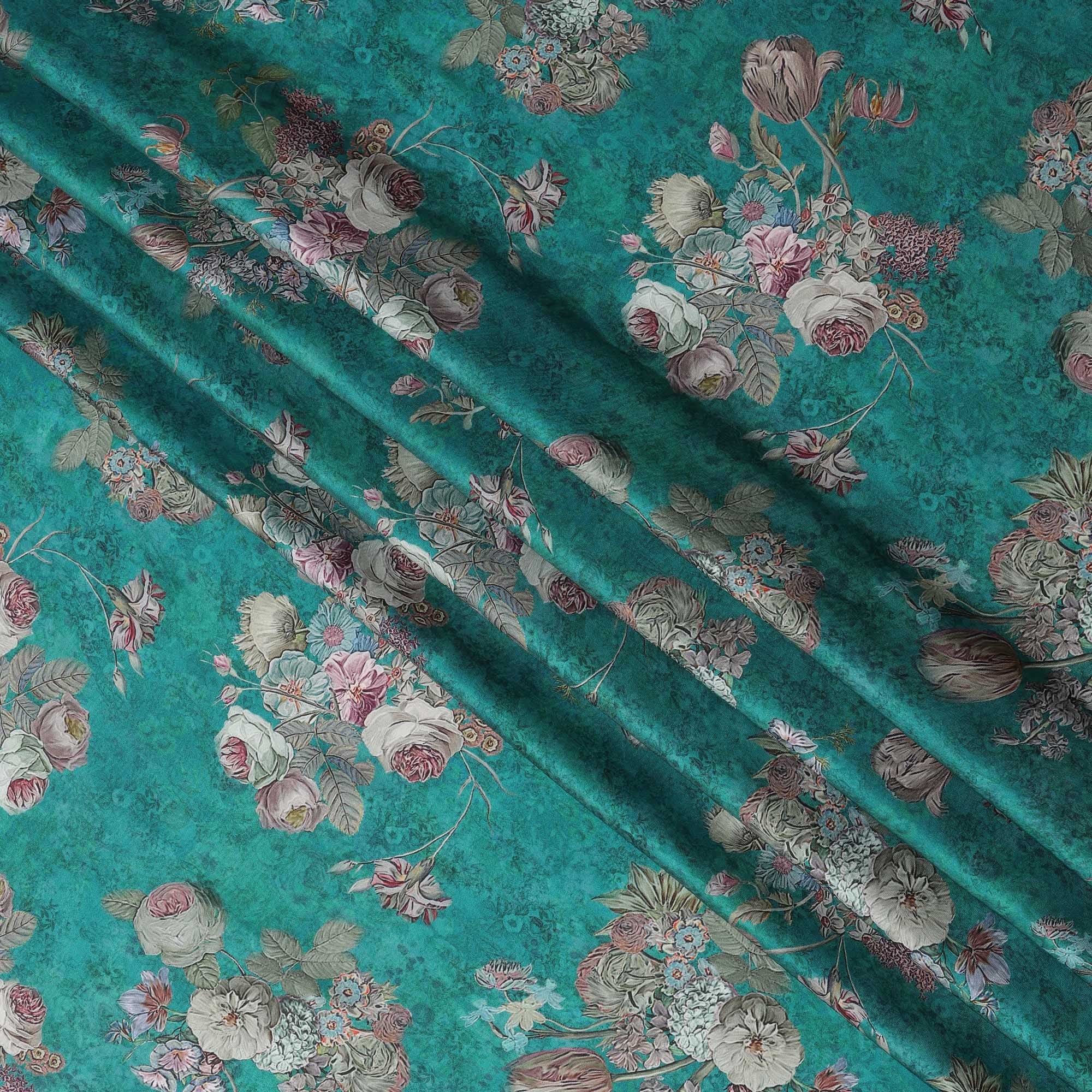 قماش فيسكوز مودال ساتان بطبعة باقة ورود عتيقة باللون الأخضر الفيروزي، عرض 110 سم، صنع في الهند - D23297