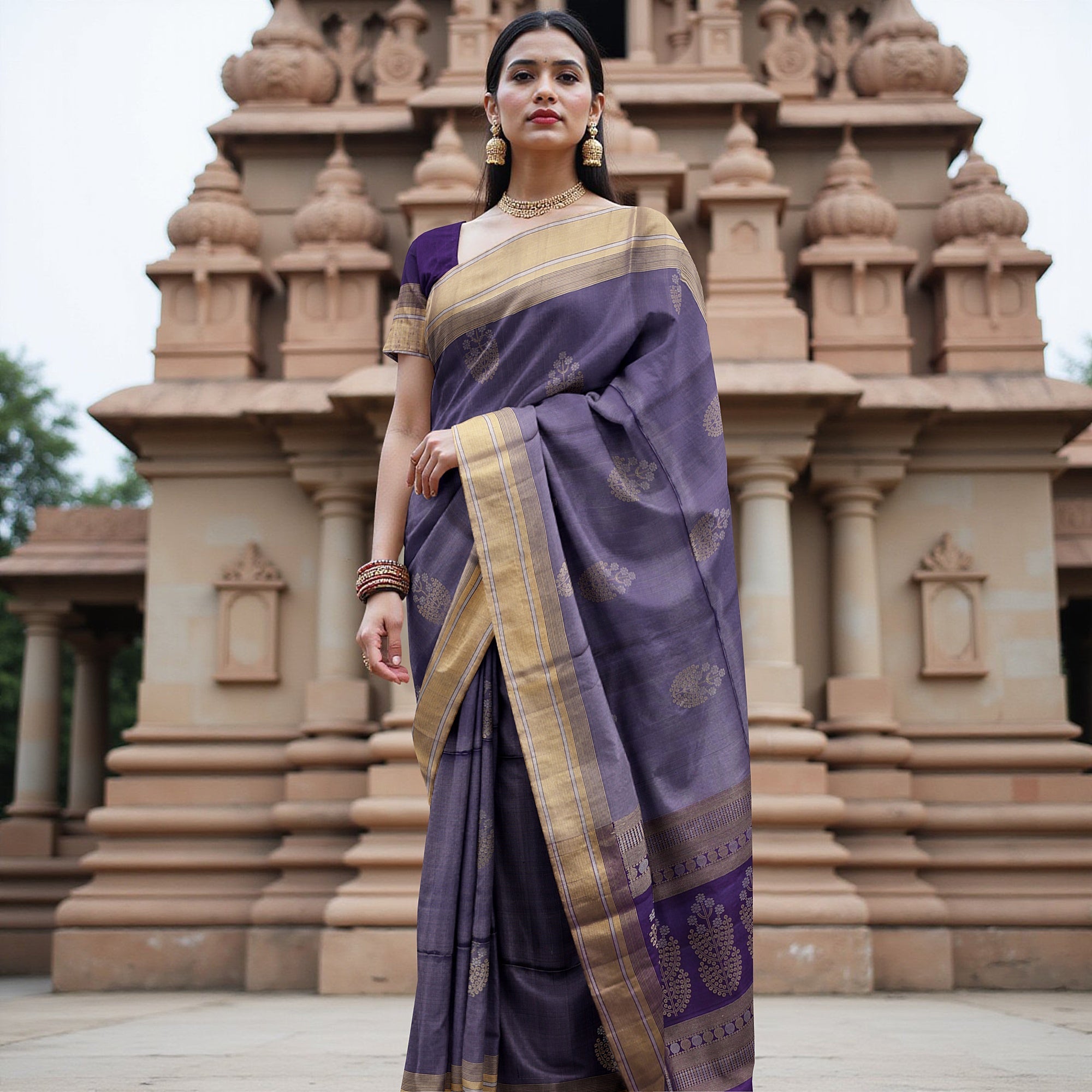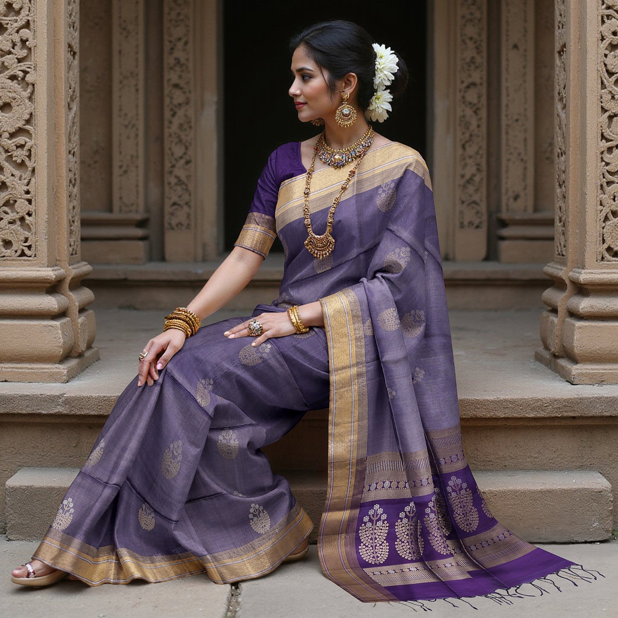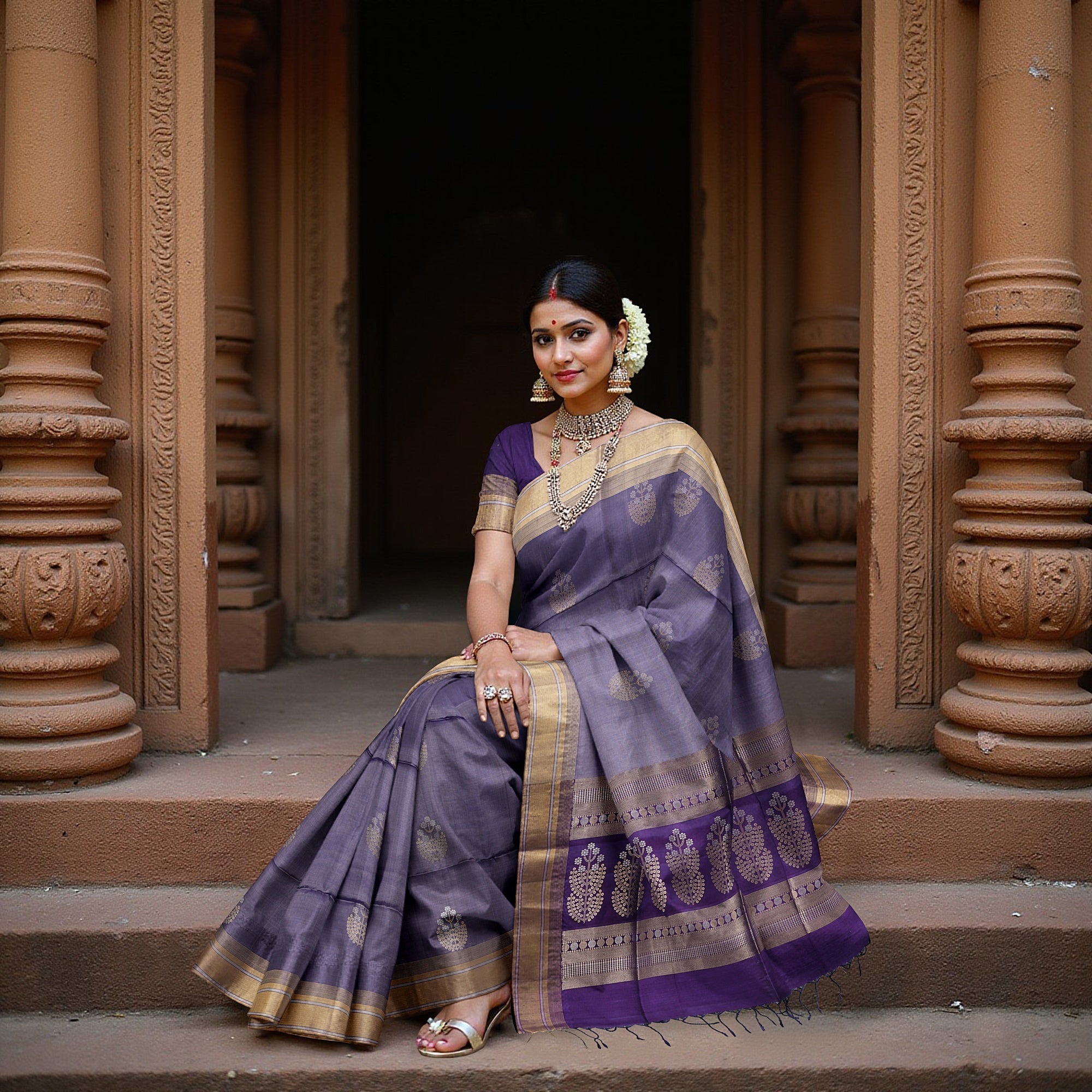 نزهة في ممرات المعابد، حيث تُحاكي المنحوتات الإلهية حكايات التراث، تُلهم ساري زاري الذهبي البنفسجي الناعم من الحرير الخالص. مُزين... اقرأ أكثر اقرأ أكثر