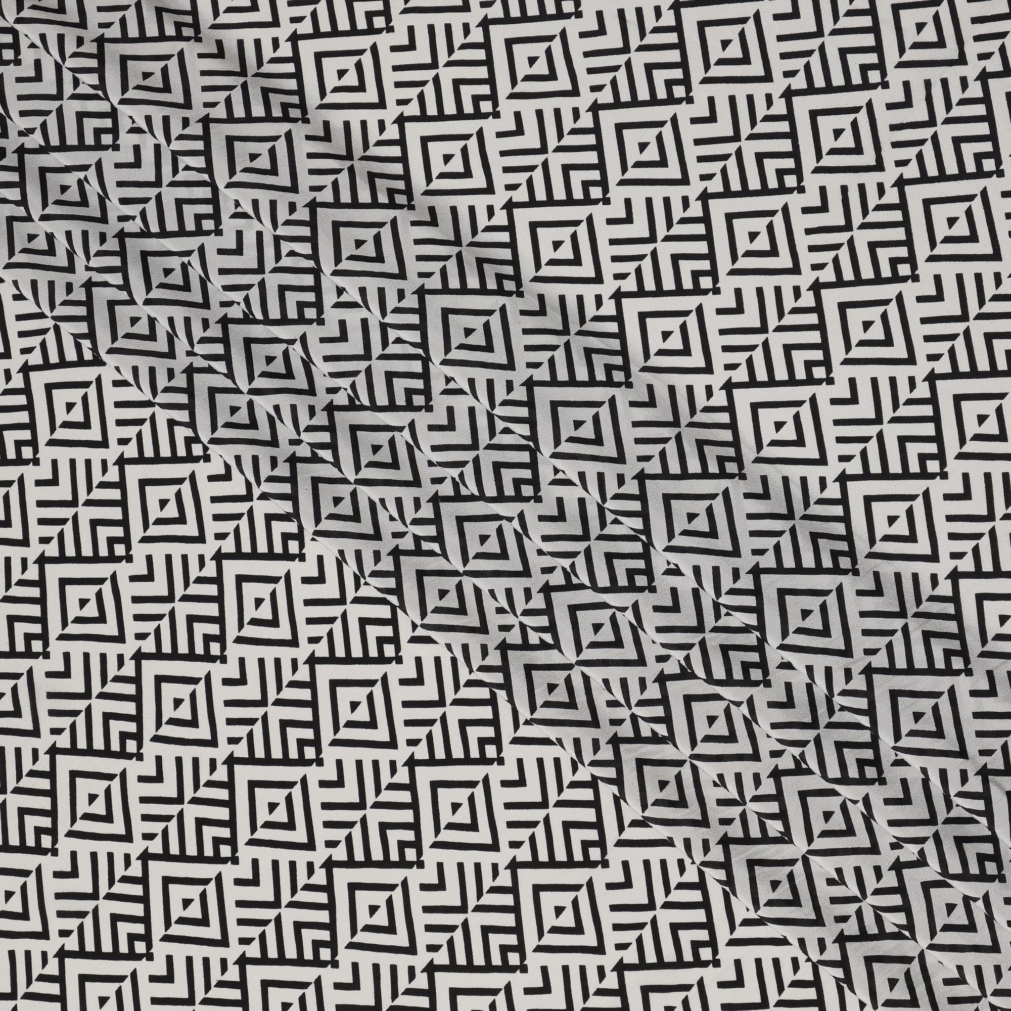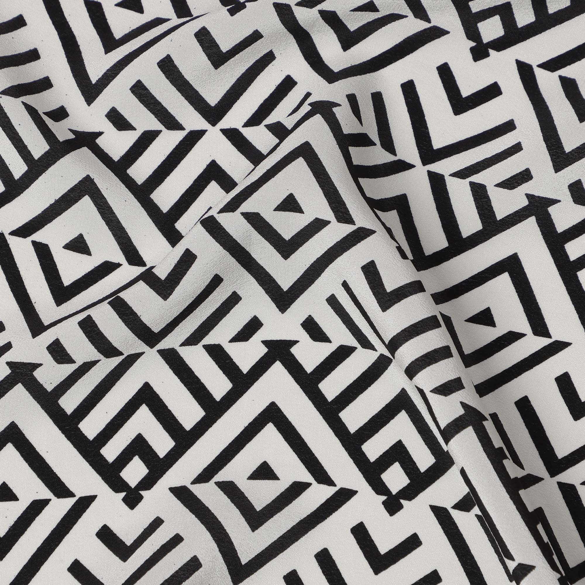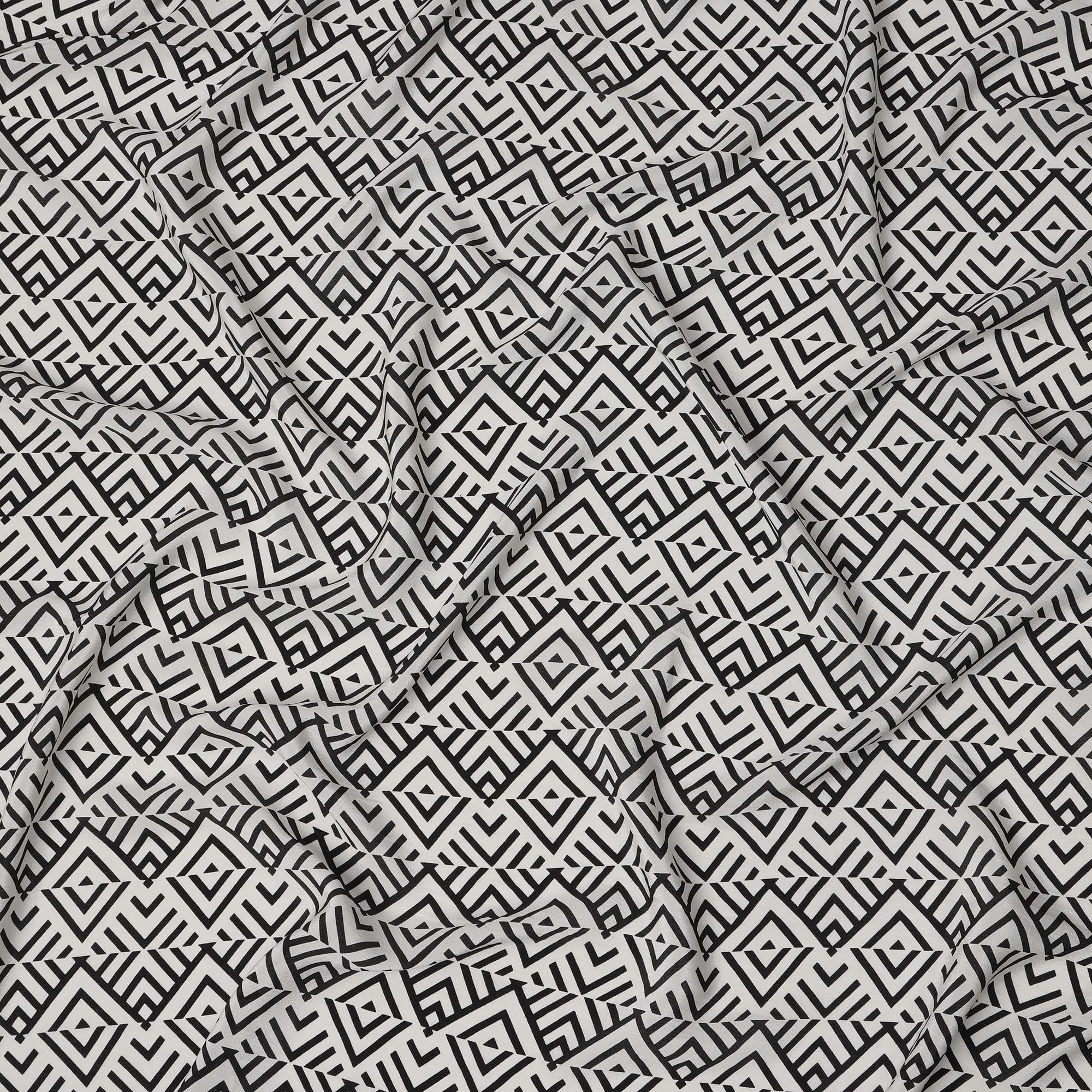 قماش كريب حريري خالص بطبعة خطوط ماسية قبلية باللونين الأبيض والأسود، عرض 110 سم، صنع في الهند - D23170