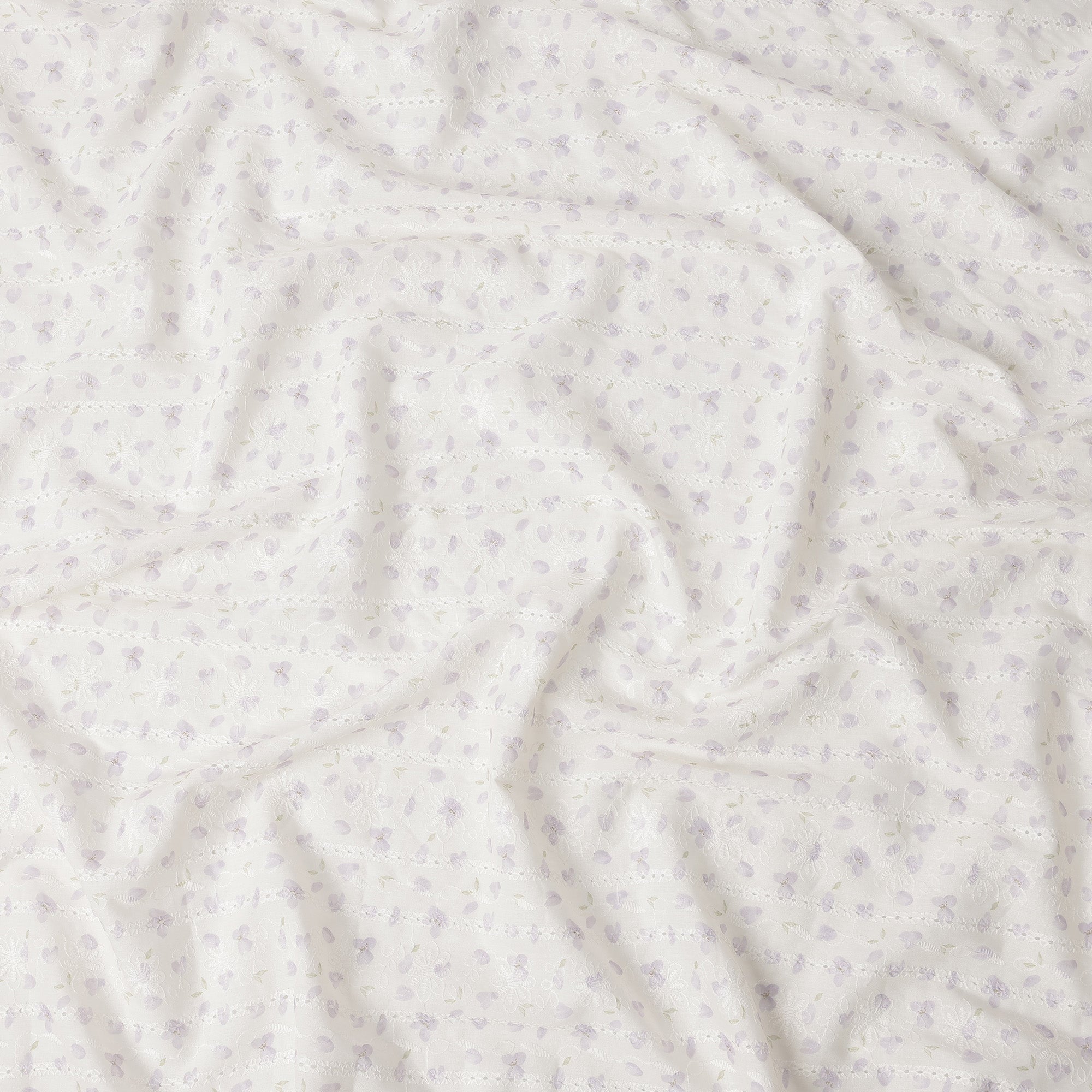 White and Lilac Floral Embroidered Cotton Viscose Fabric, 140 Cms Width, Made in China-D26231