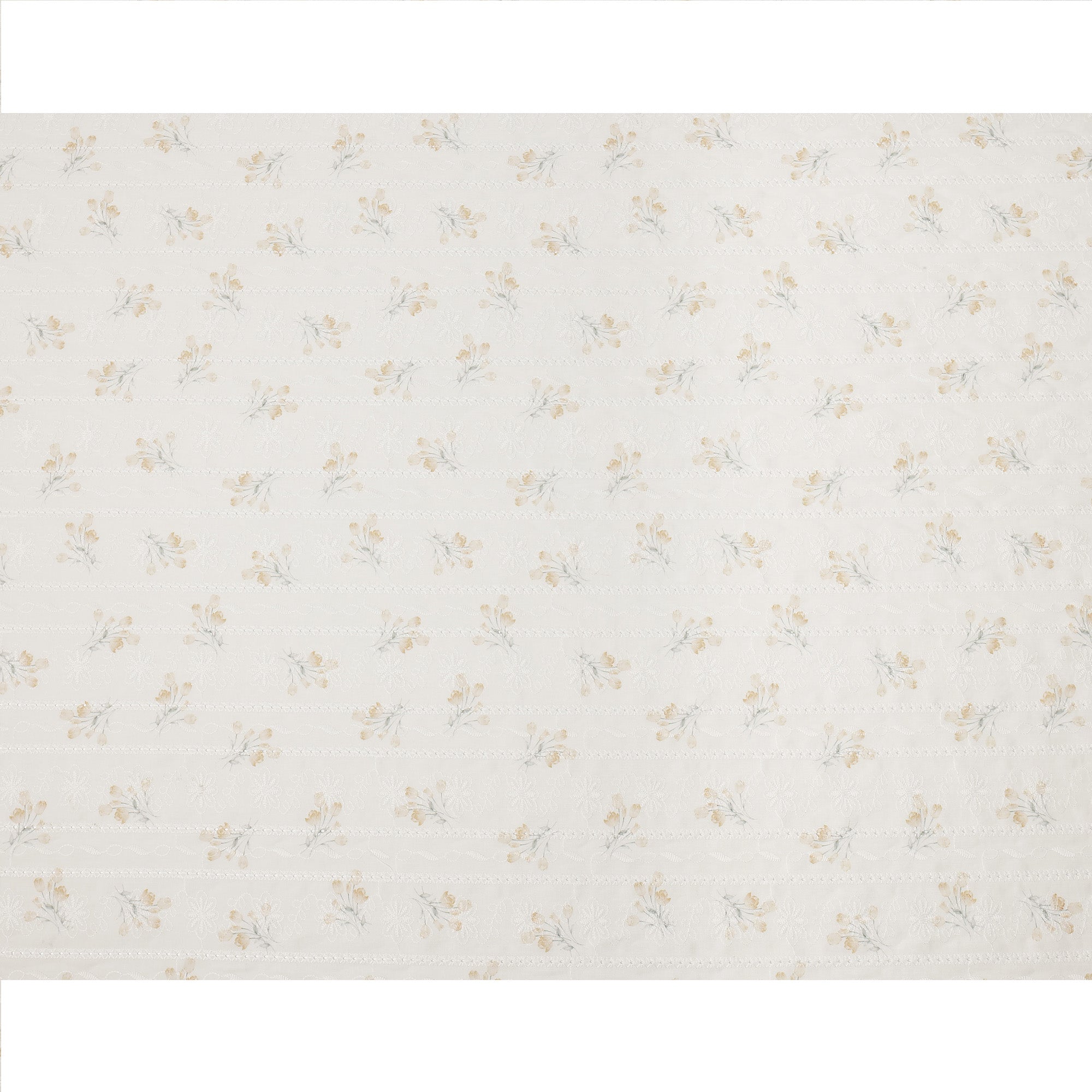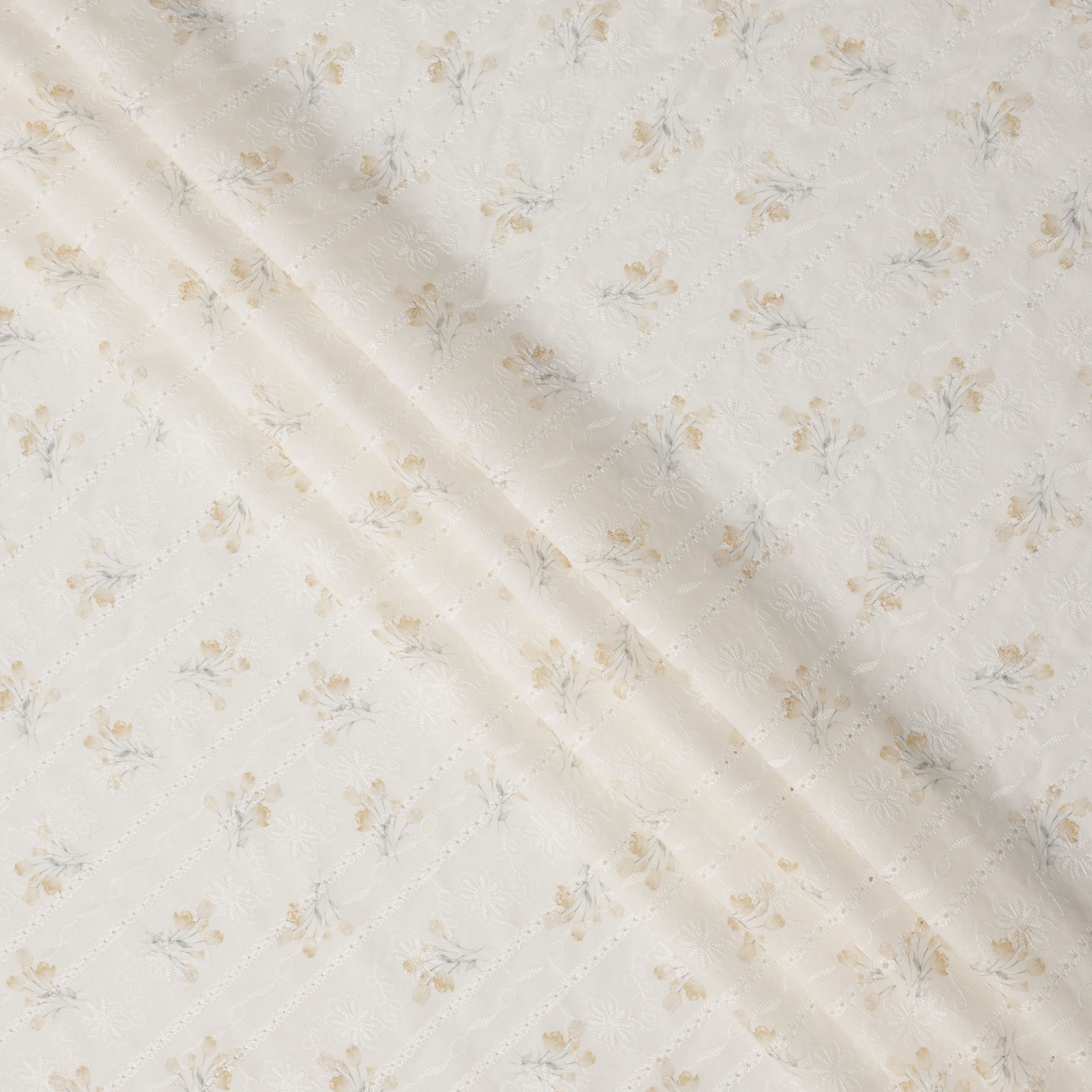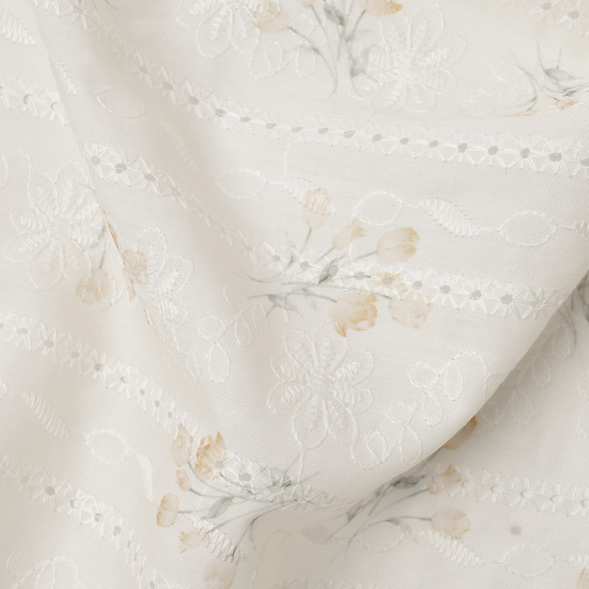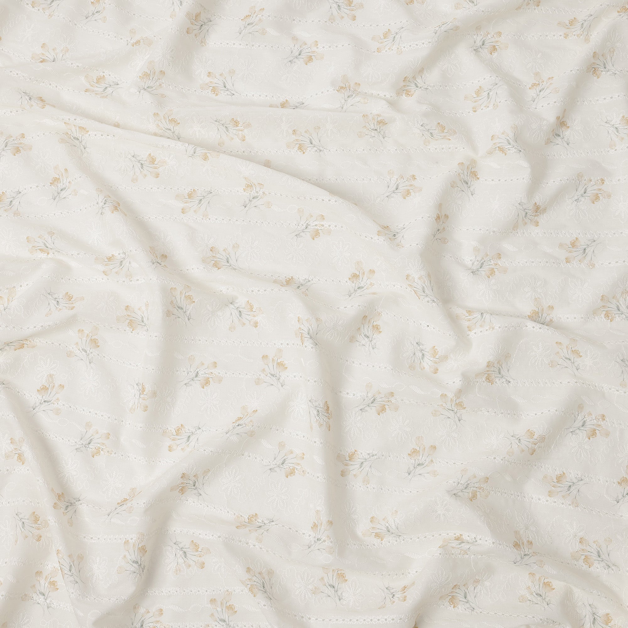 White and Mustard Floral Embroidered Cotton Viscose Fabric, 140 Cms Width, Made in China-D26238
