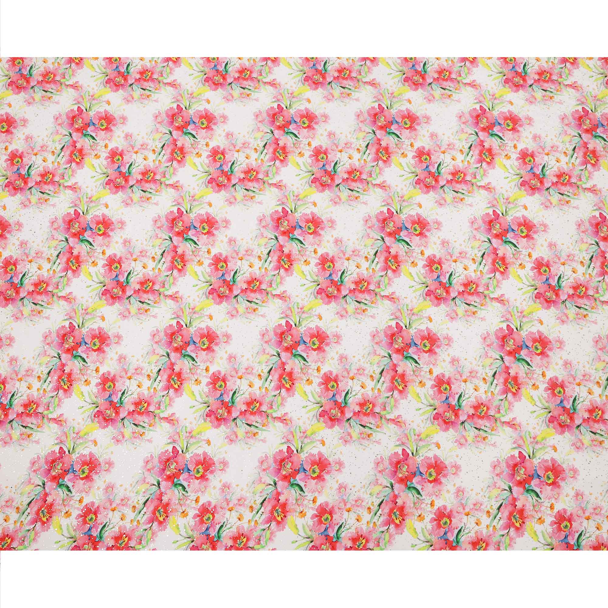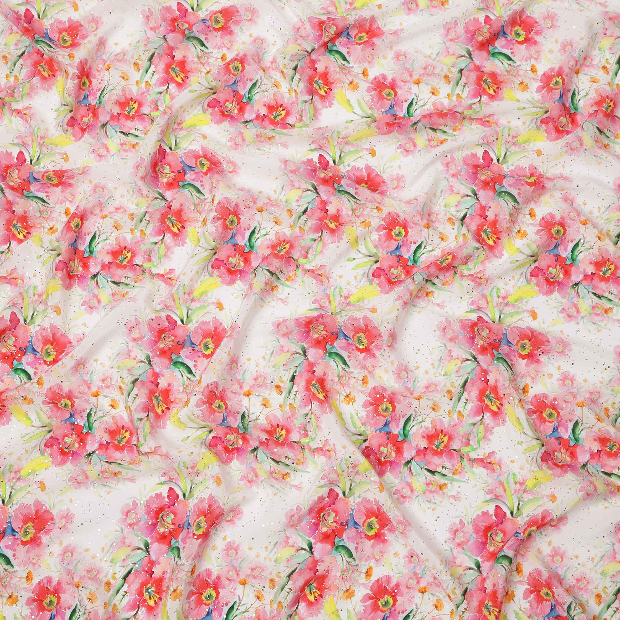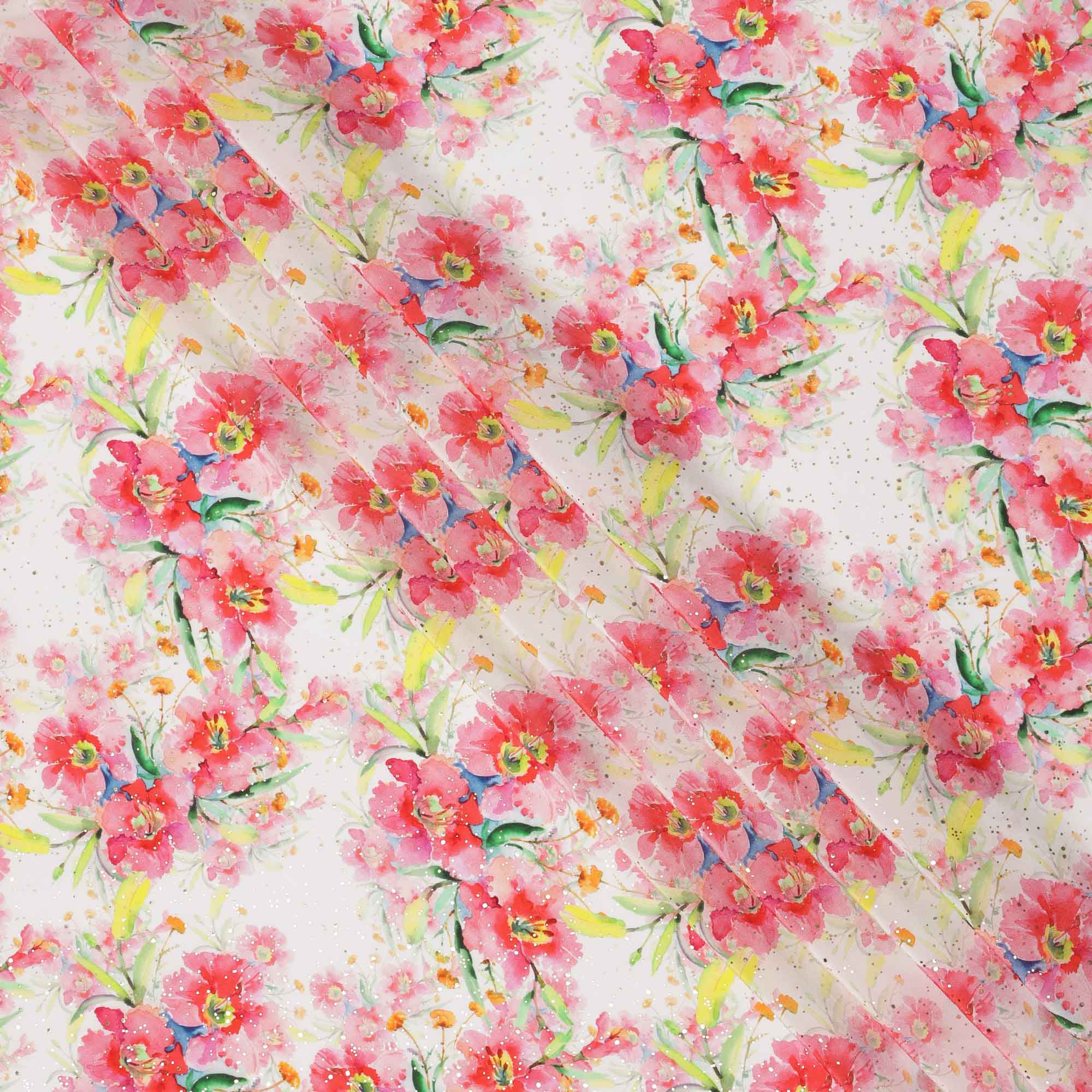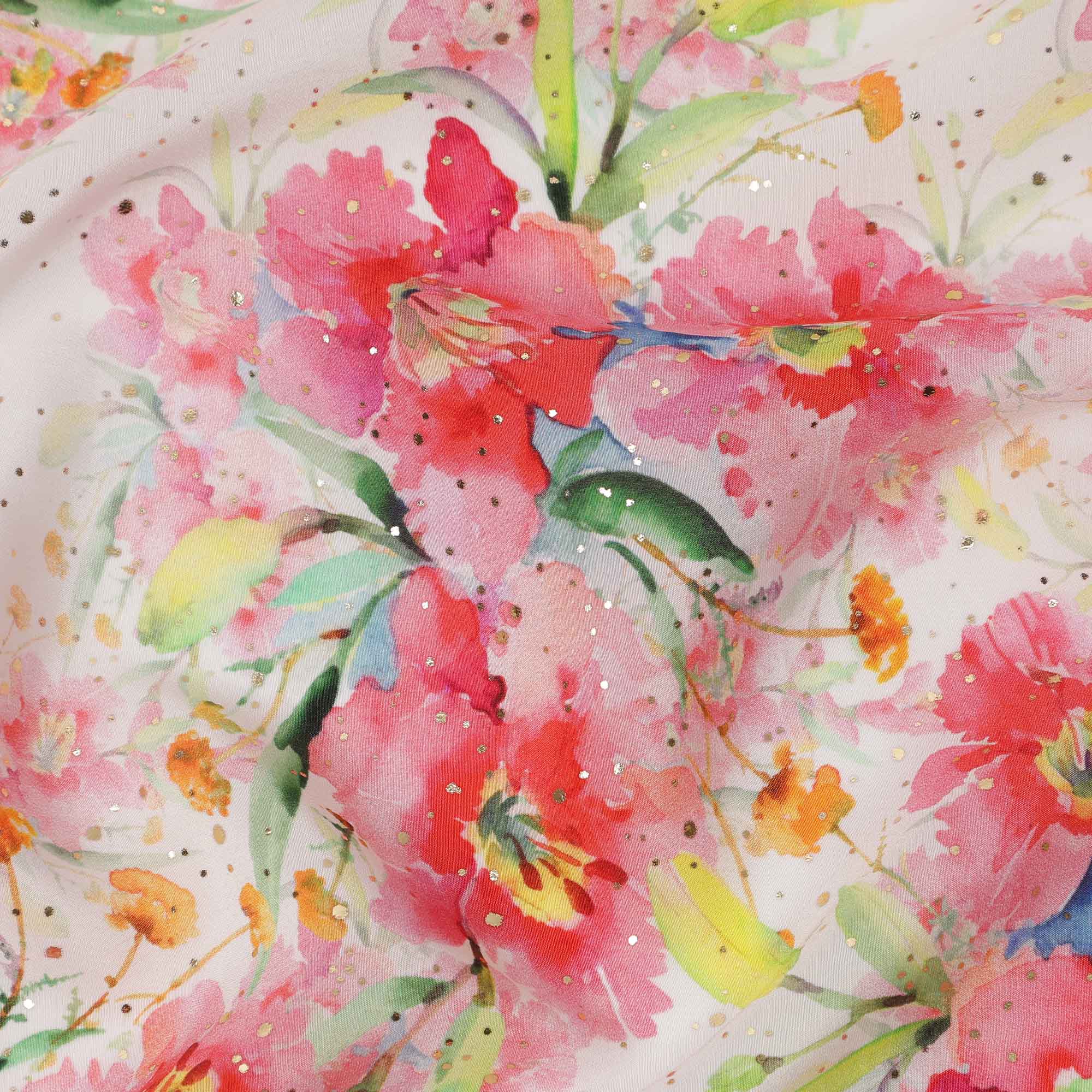 قماش كريب فيسكوز بطباعة رقمية بألوان مائية وزهور وردية بقاعدة بيضاء، عرض 110 سم، صنع في الهند - D23633