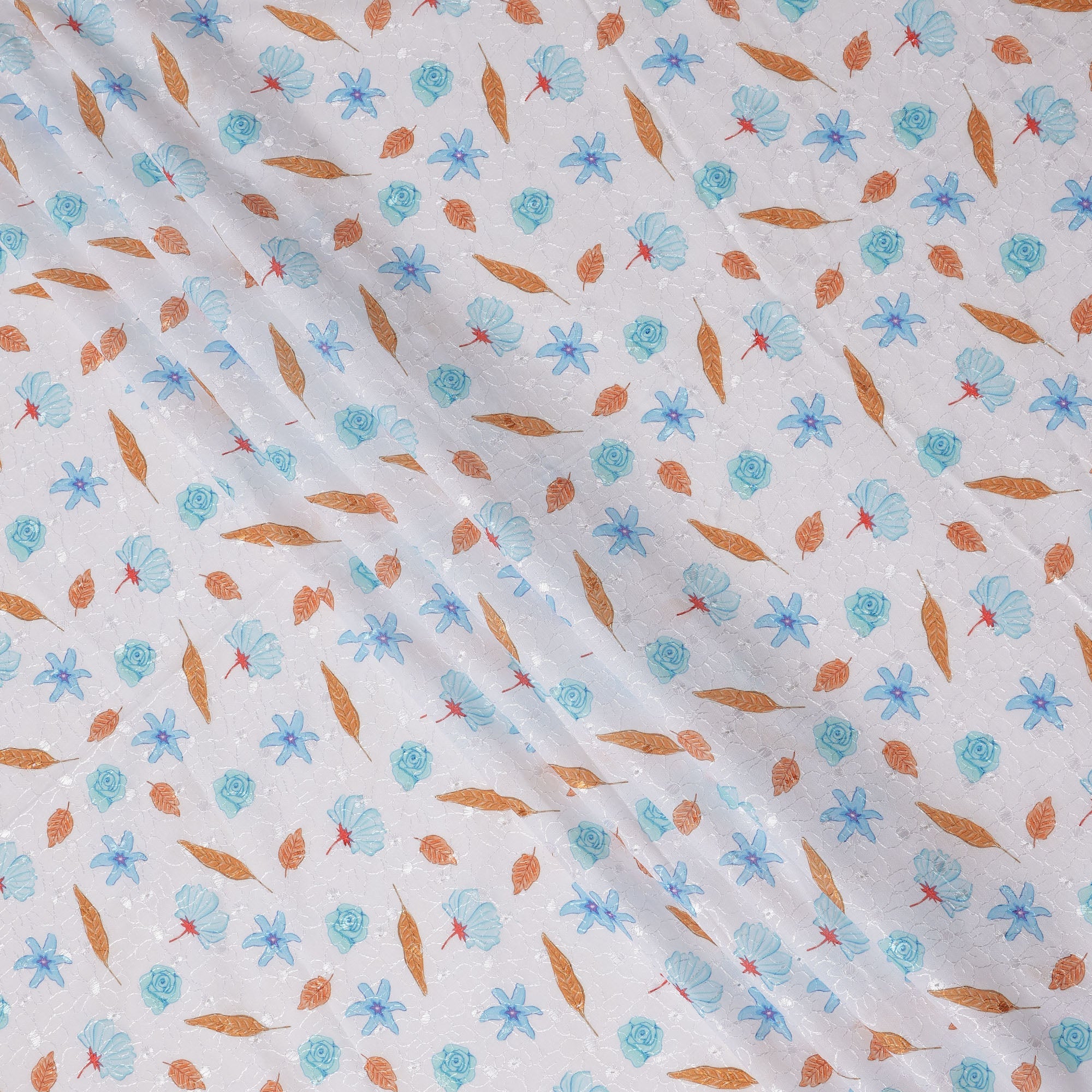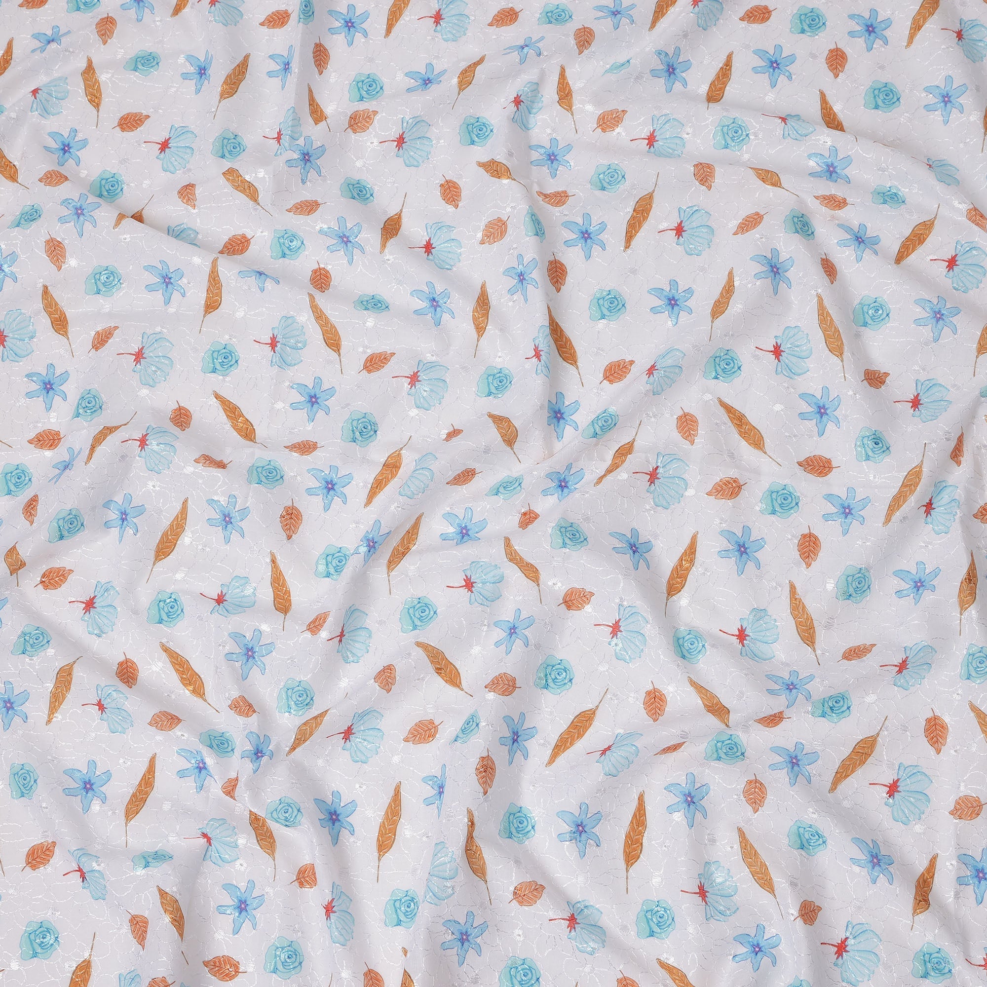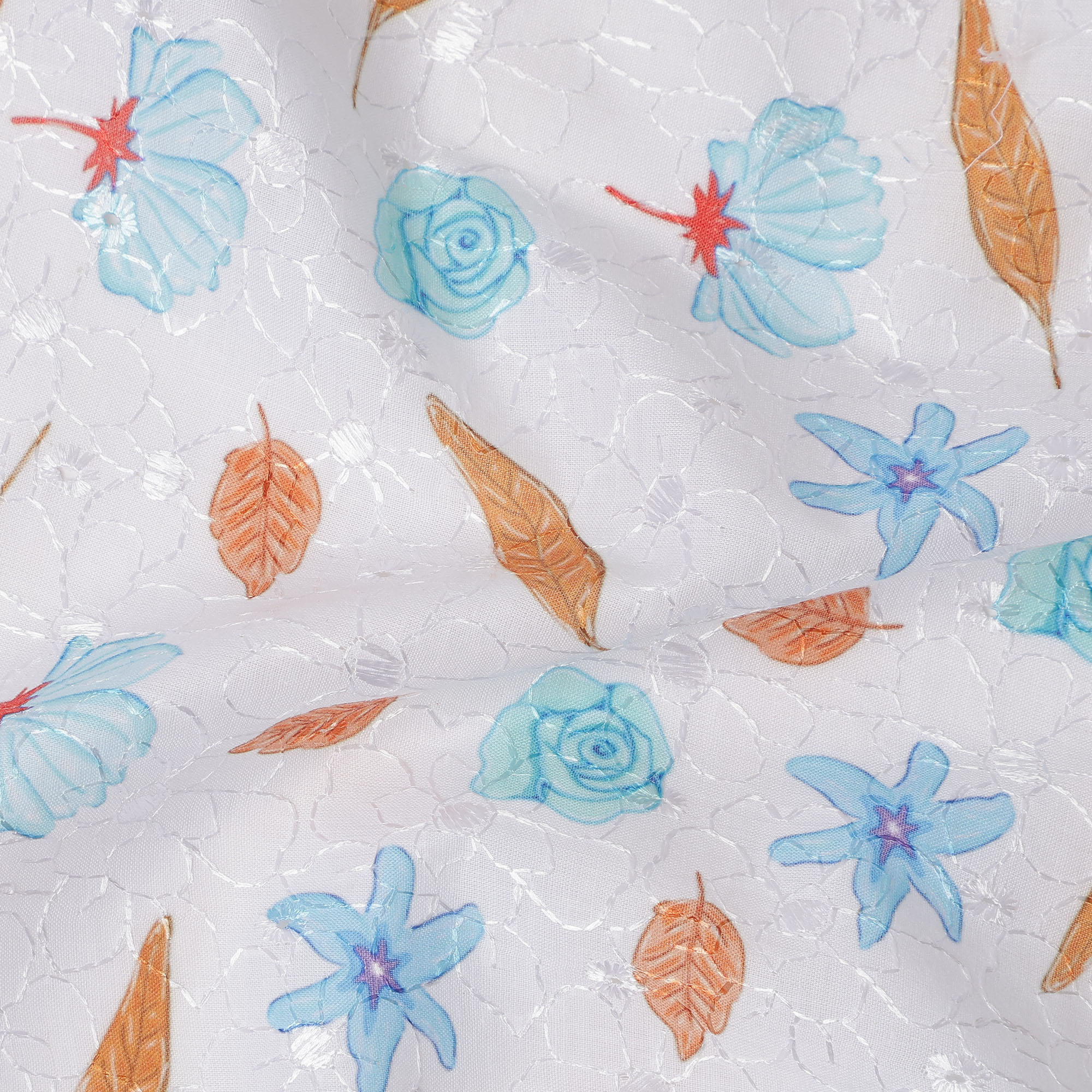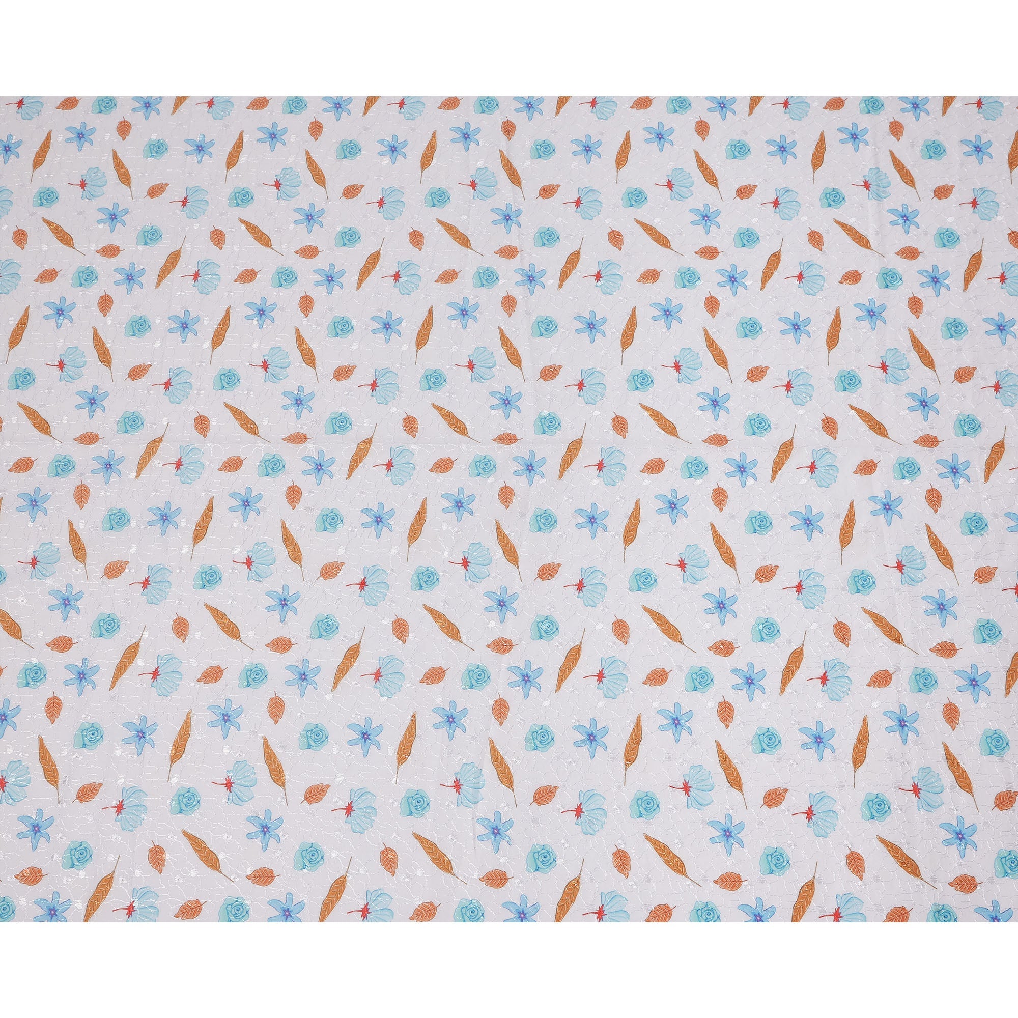 قماش تطريز من القطن الأبيض بطبعة زهور زرقاء وأوراق ذهبية، عرض 110 سم، الهند - D25297