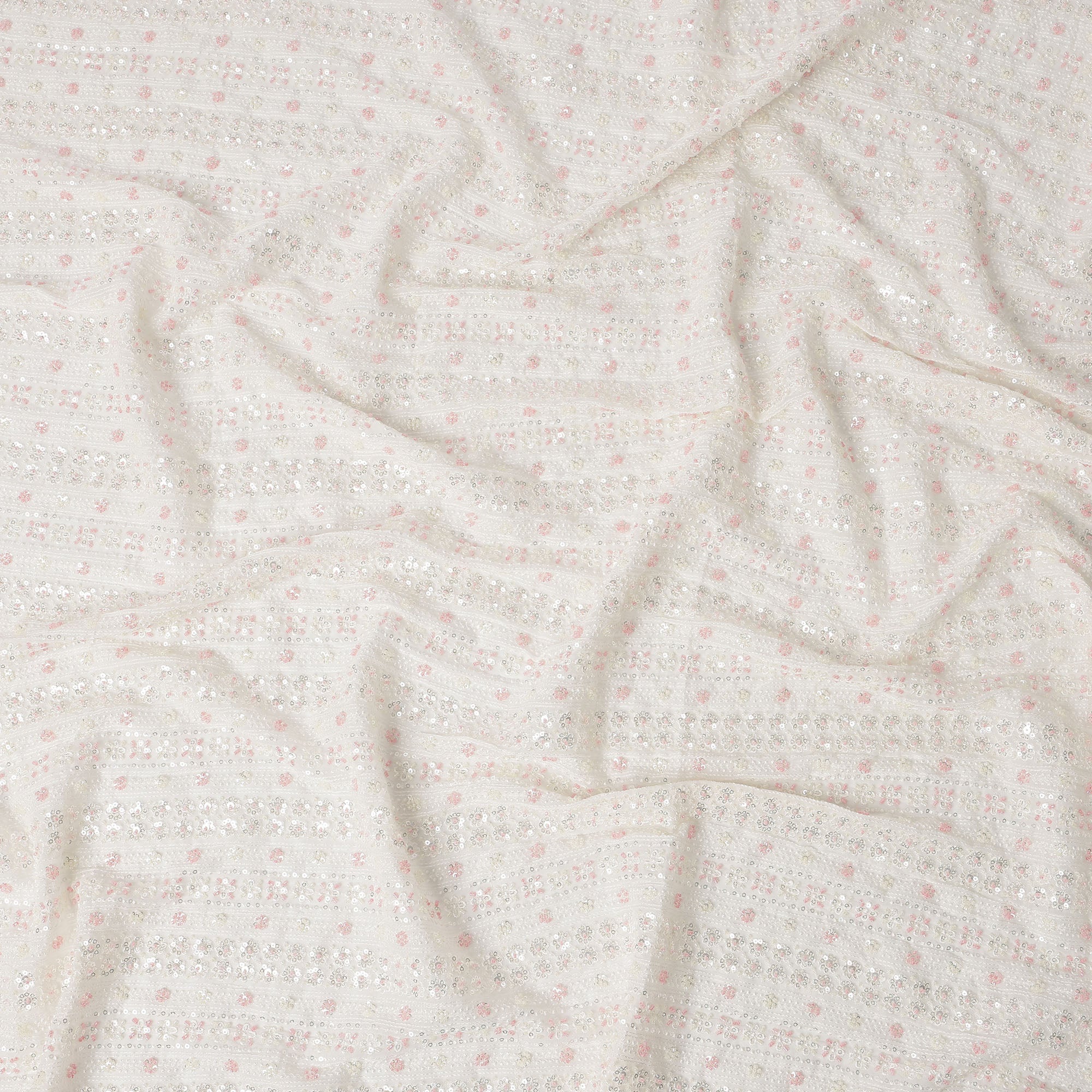 White Floral Sequin and Textured Stripe Synthetic Blended Georgette Fabric, 110 cm Width, Made in India-D26649