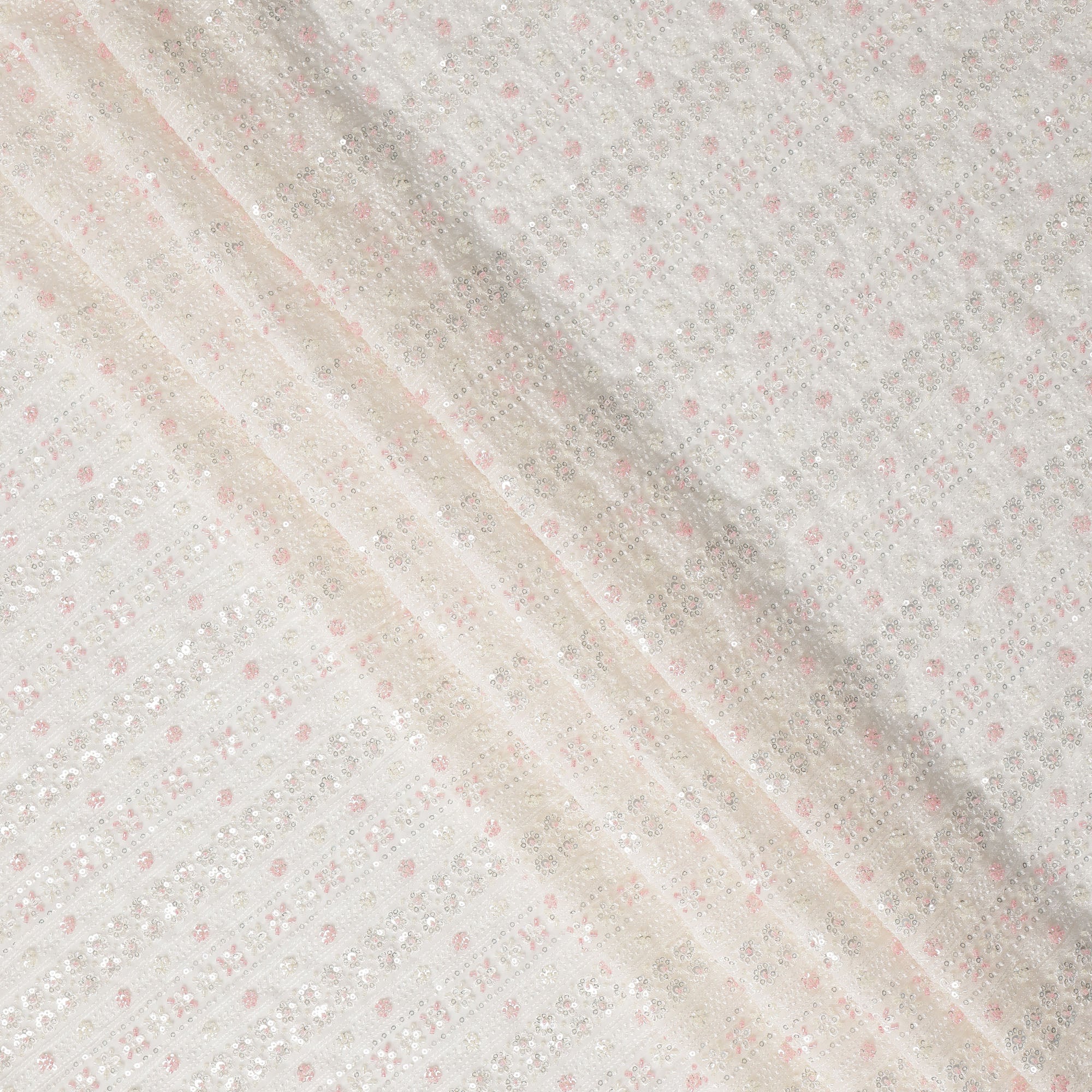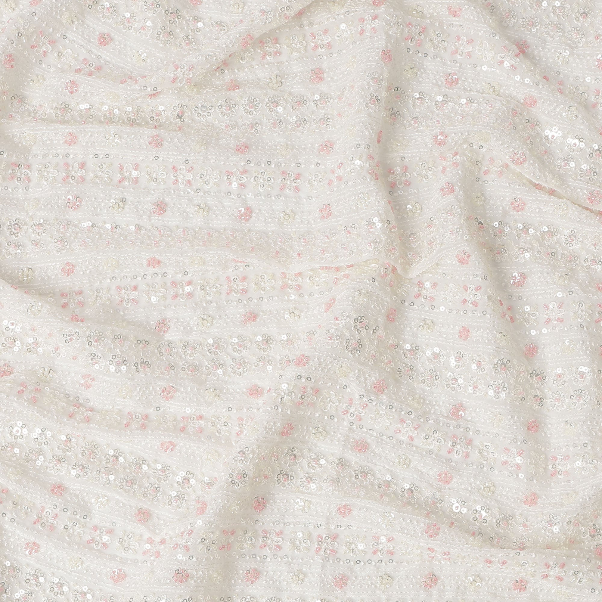 This elegant white synthetic blended georgette fabric features delicate floral sequin motifs arranged in soft linear stripes, enhanced with subtle hints of pastel pink and shimmering embellishments. The lightweight, semi-sheer georgette base provides graceful movement, making it ideal for sarees, festive gowns, anarkalis, kurtis, dupattas, and contemporary designer wear. Its intricate detailing adds a refined sparkle without overpowering the garment, offering the perfect blend of sophistication and charm. Designed to drape beautifully while ensuring comfort, this fabric is an excellent choice for those wishing to buy online or shop online premium embellished georgette materials. Durable, versatile, and visually appealing, it elevates any ensemble with its gentle sheen and feminine elegance.