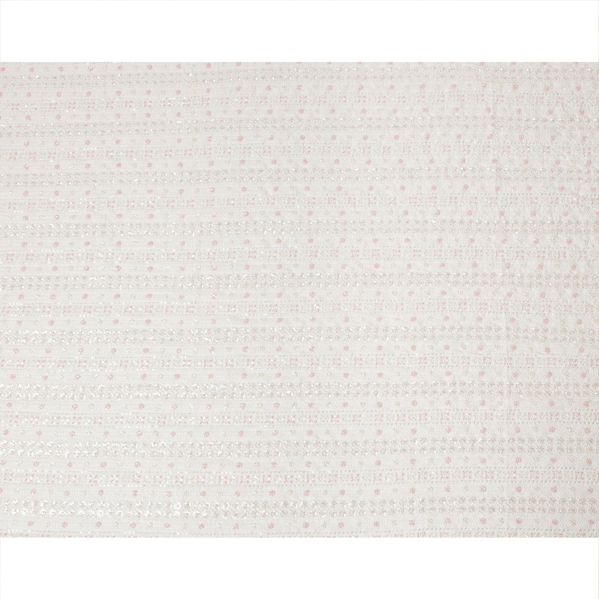 This elegant white synthetic blended georgette fabric features delicate floral sequin motifs arranged in soft linear stripes, enhanced with subtle... اقرأ أكثر اقرأ أكثر