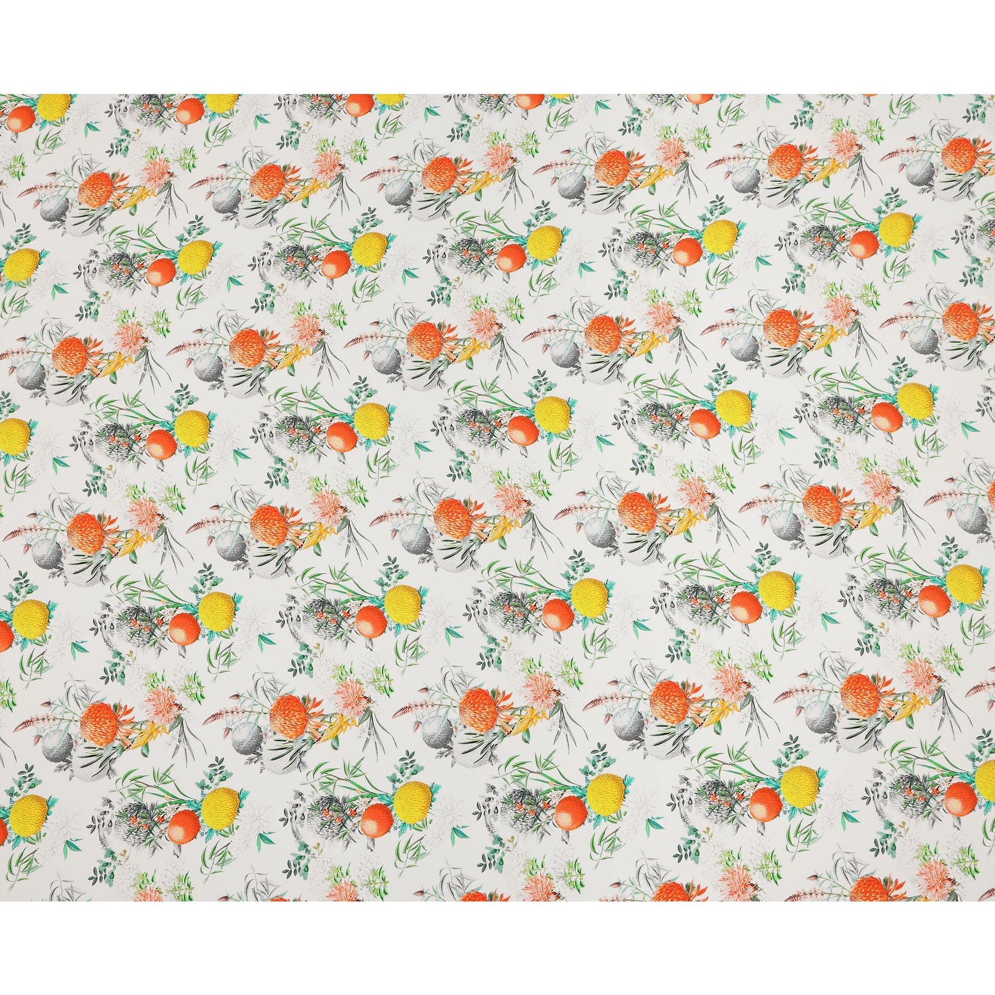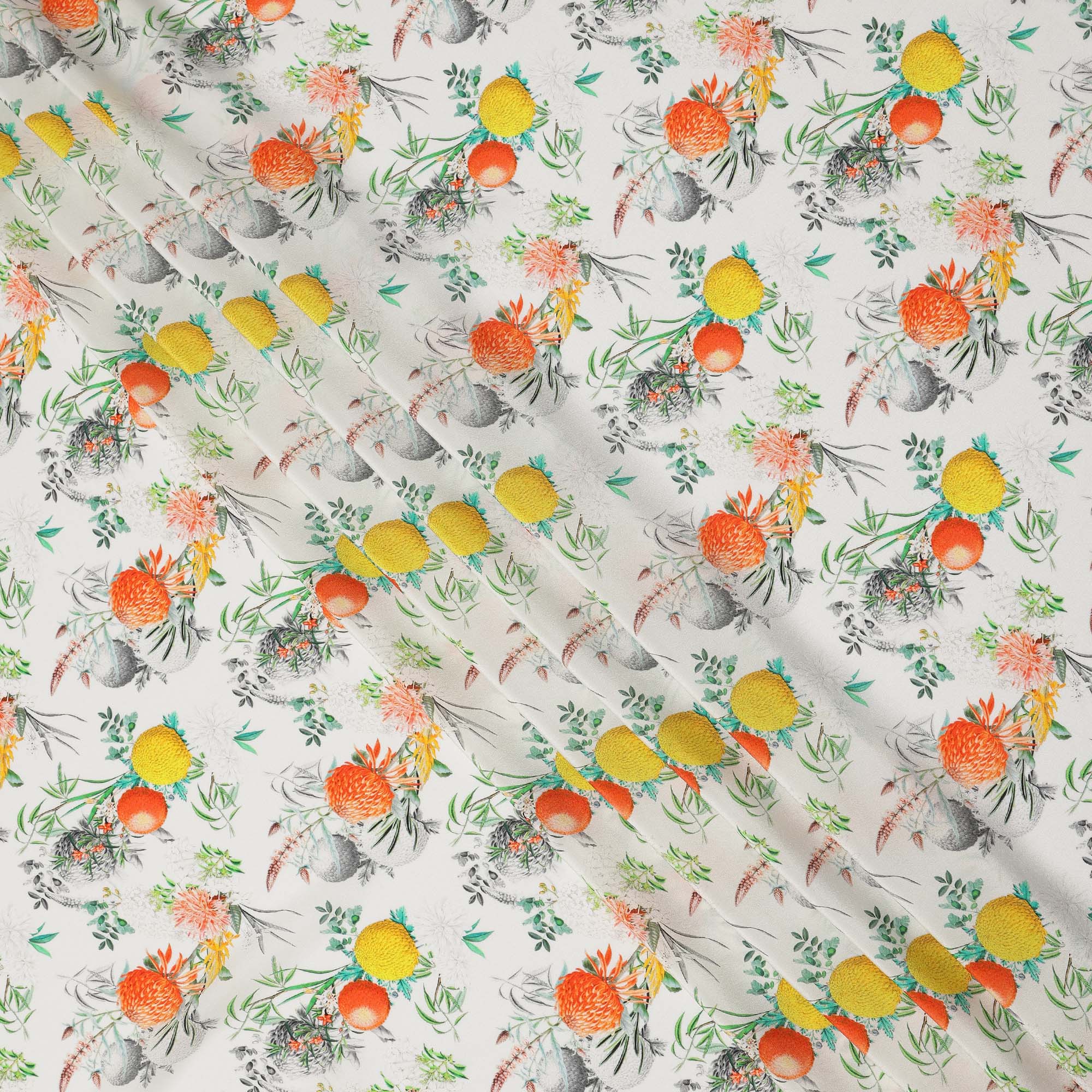 Features vibrant floral motifs in orange, yellow, green, and grey on a white base