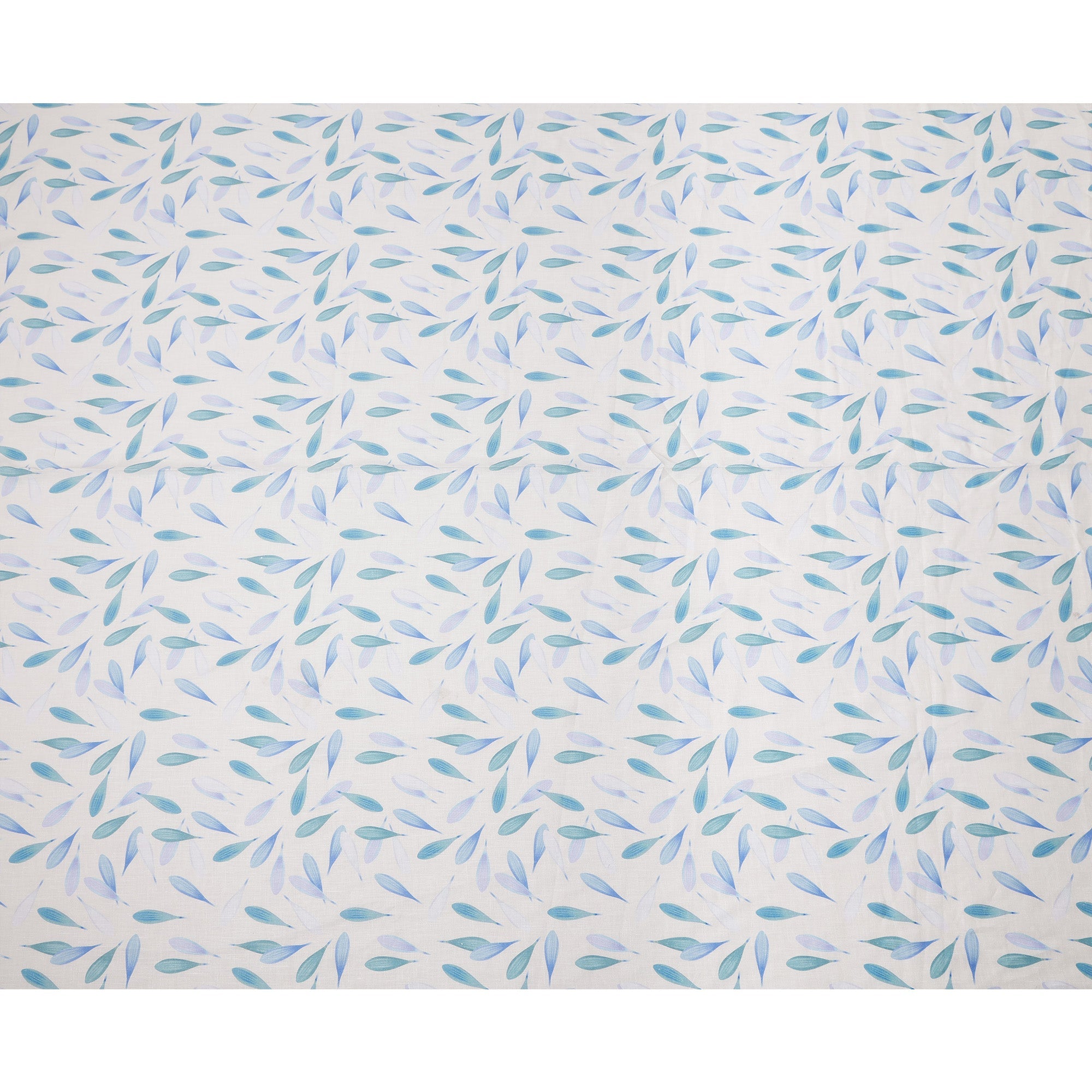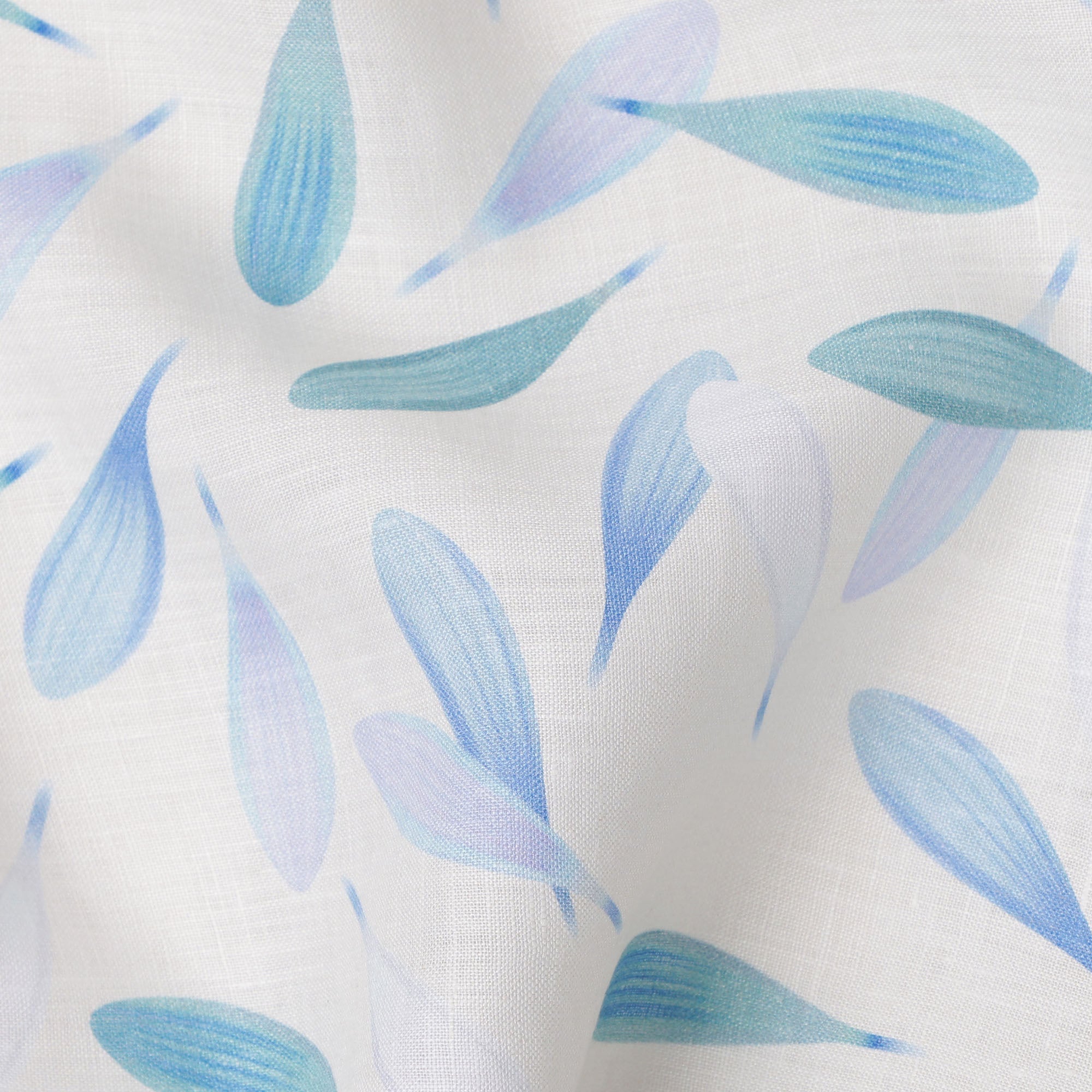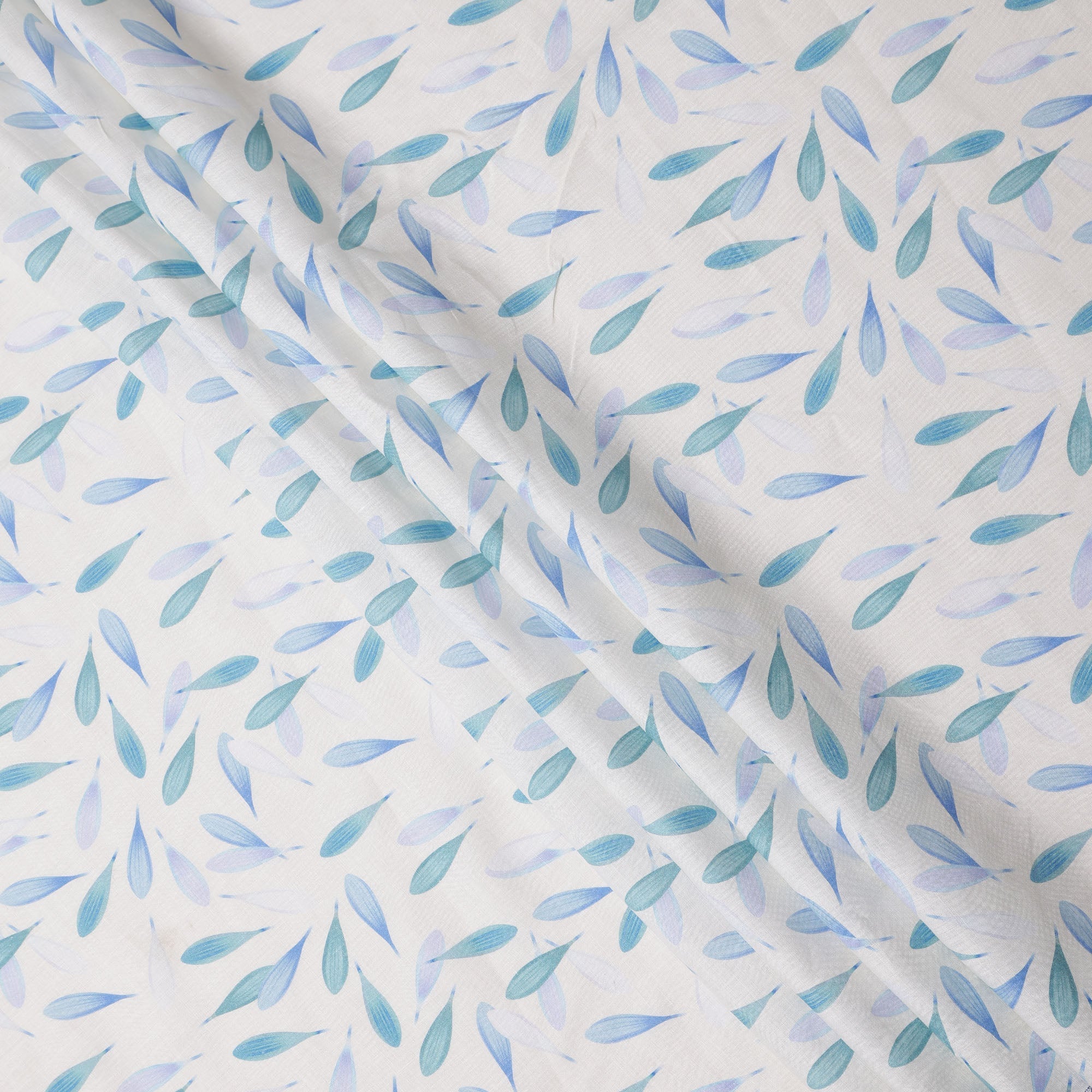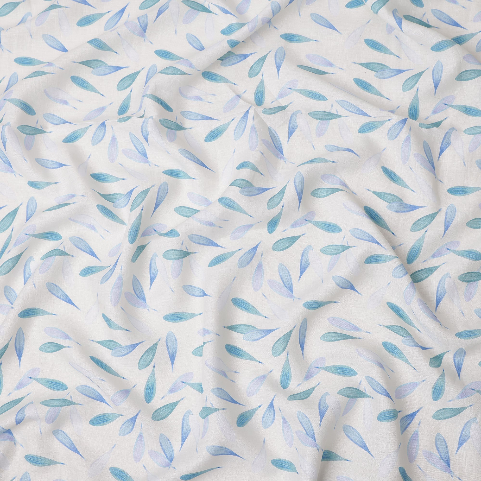 قماش كتان أبيض نقي مطبوع عليه أوراق الشجر بتصميم تجريدي باللونين الأزرق والأزرق المخضر، عرض 140 سم، صنع في الهند - D25074