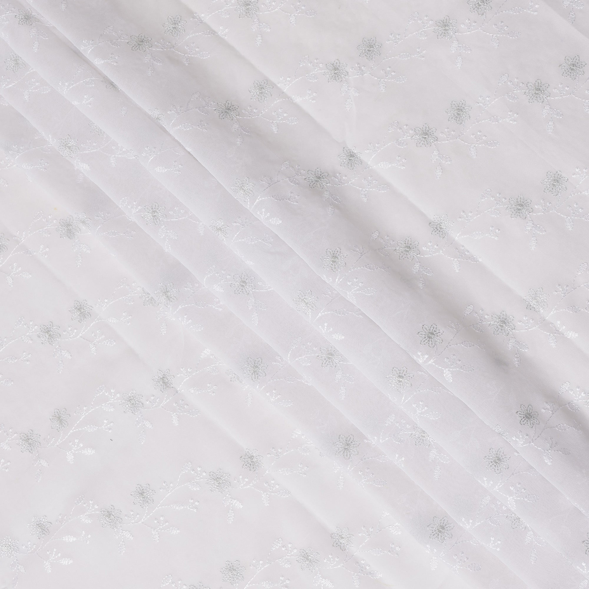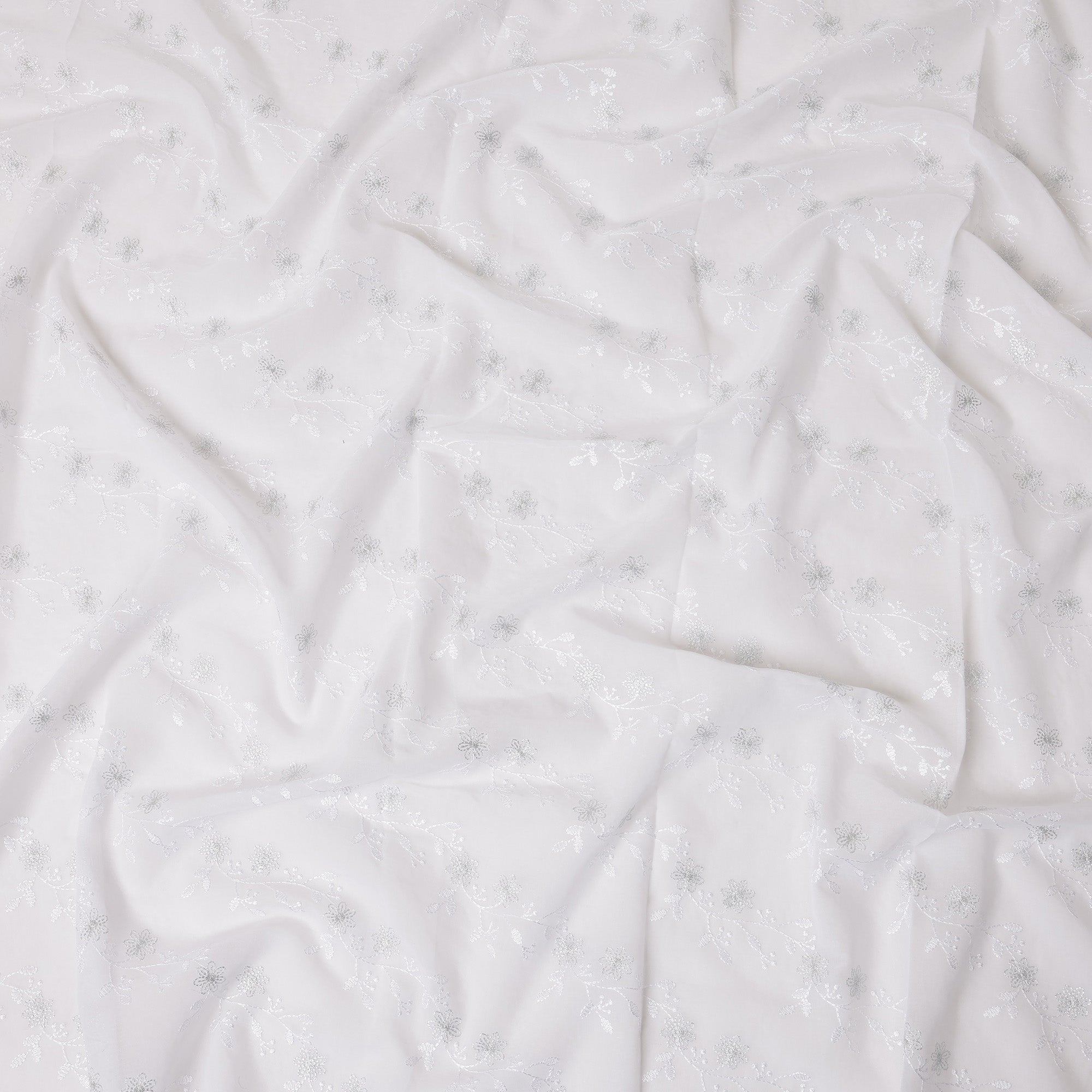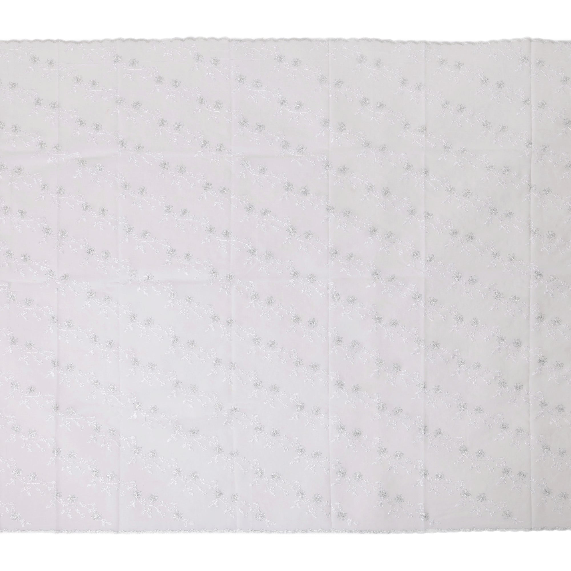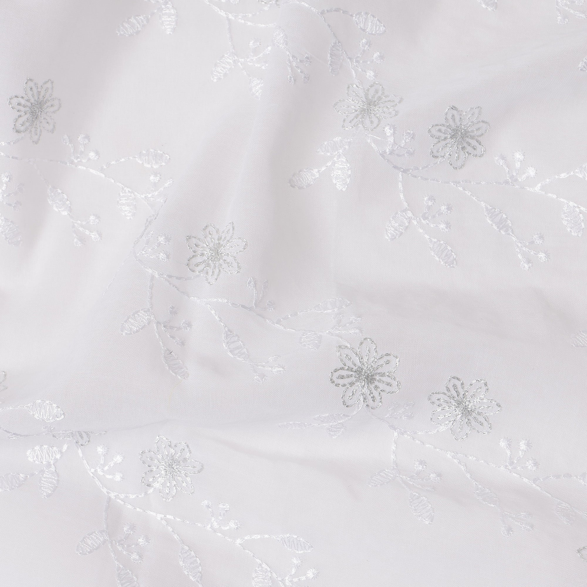 White Traditional Sudanese Thobe Fabric with Silver Floral Embroidery, Pure Cotton Voile, 4.5 Mtrs Length, 140 Cms Width, Made in India-D26397
