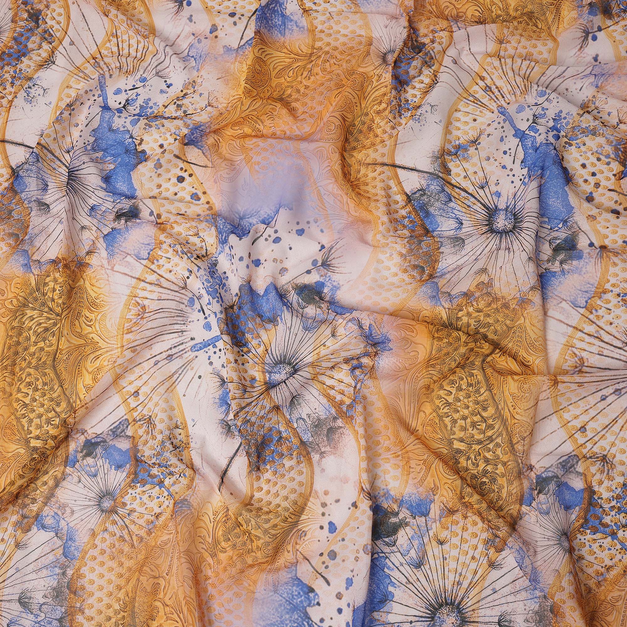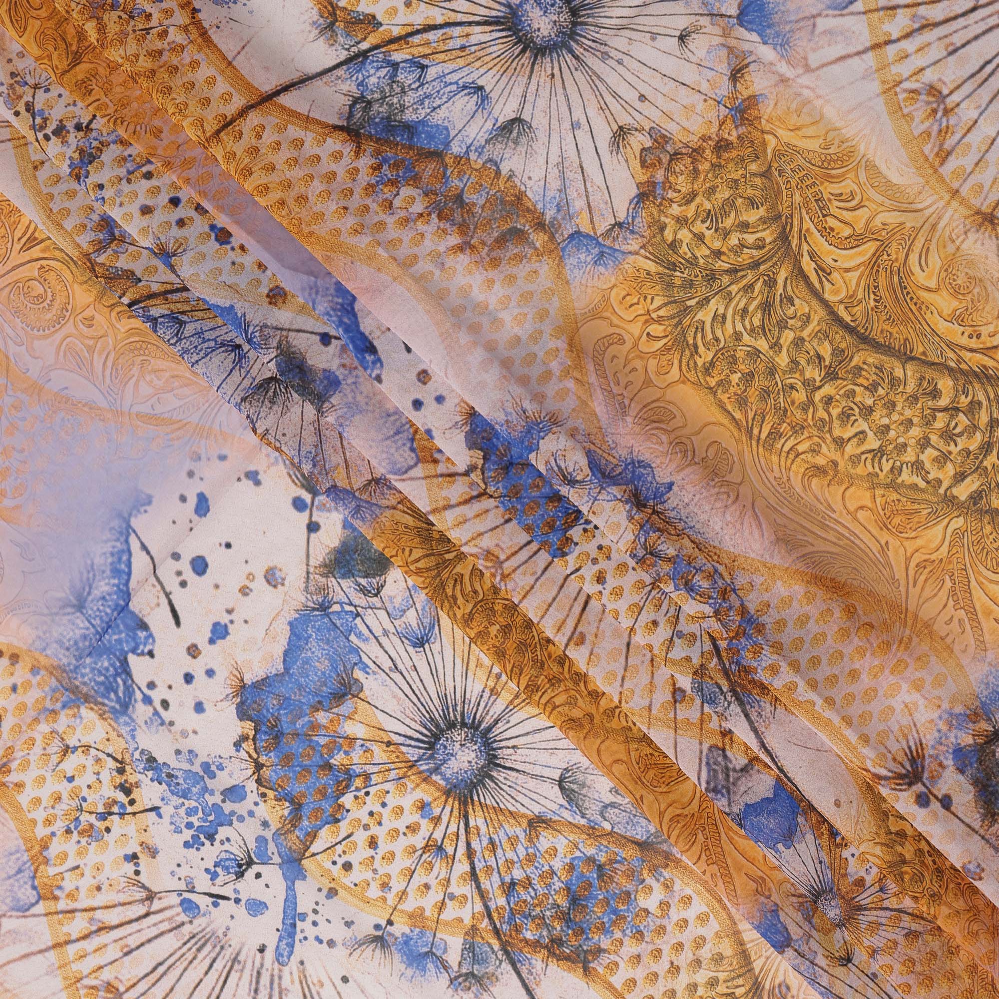 White Yellow-Blue Cotton Voile Traditional Sudanese Thobe with Abstract Artistic Print, 4.5 Mtrs Piece, Width 140 Cms, Made in India-D26475