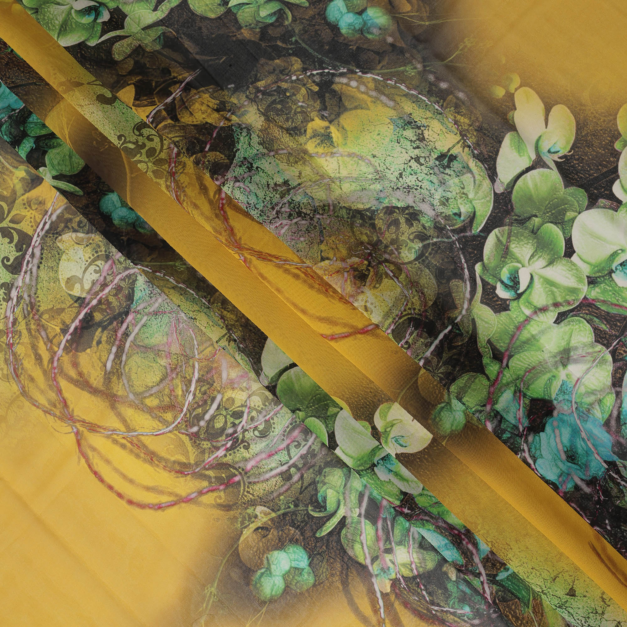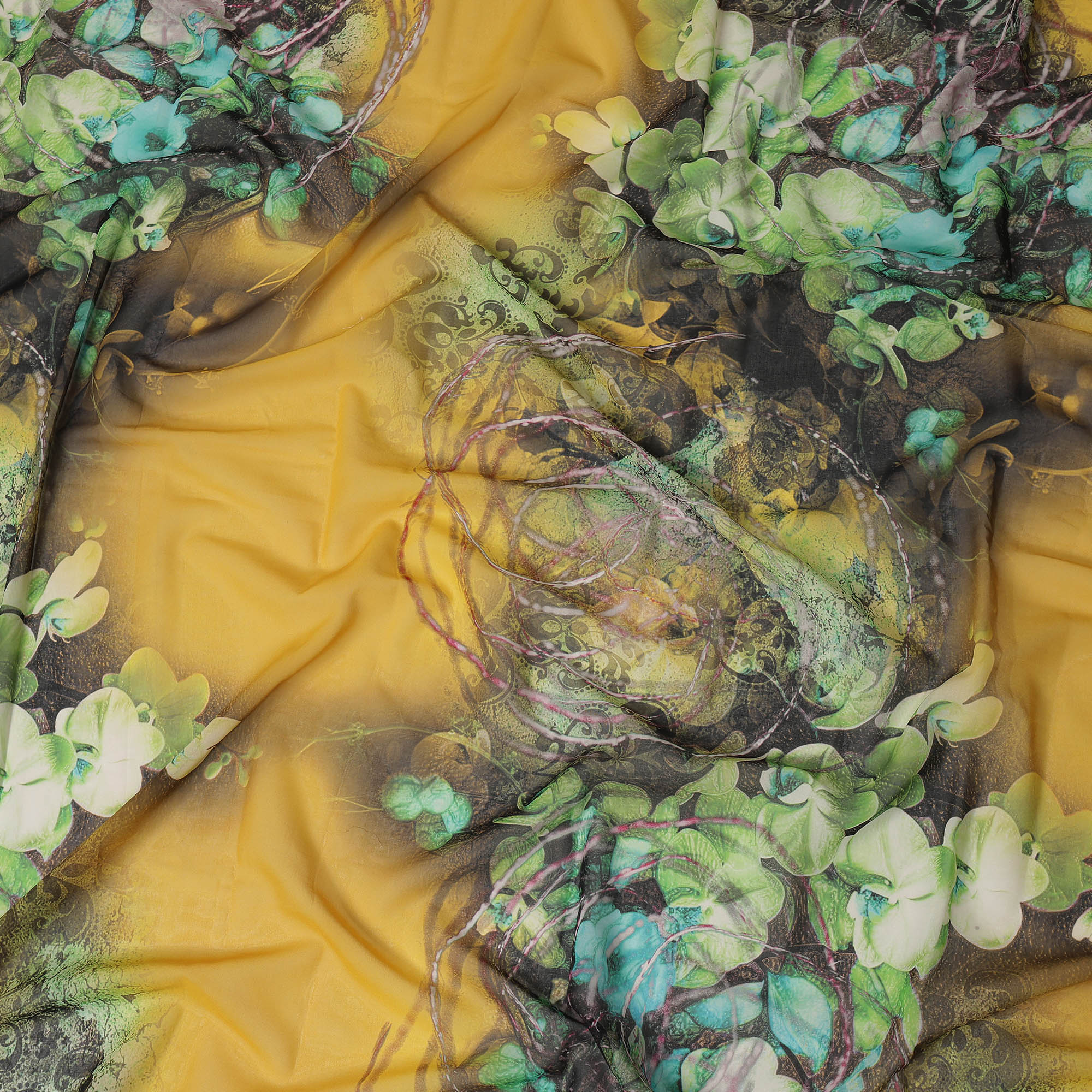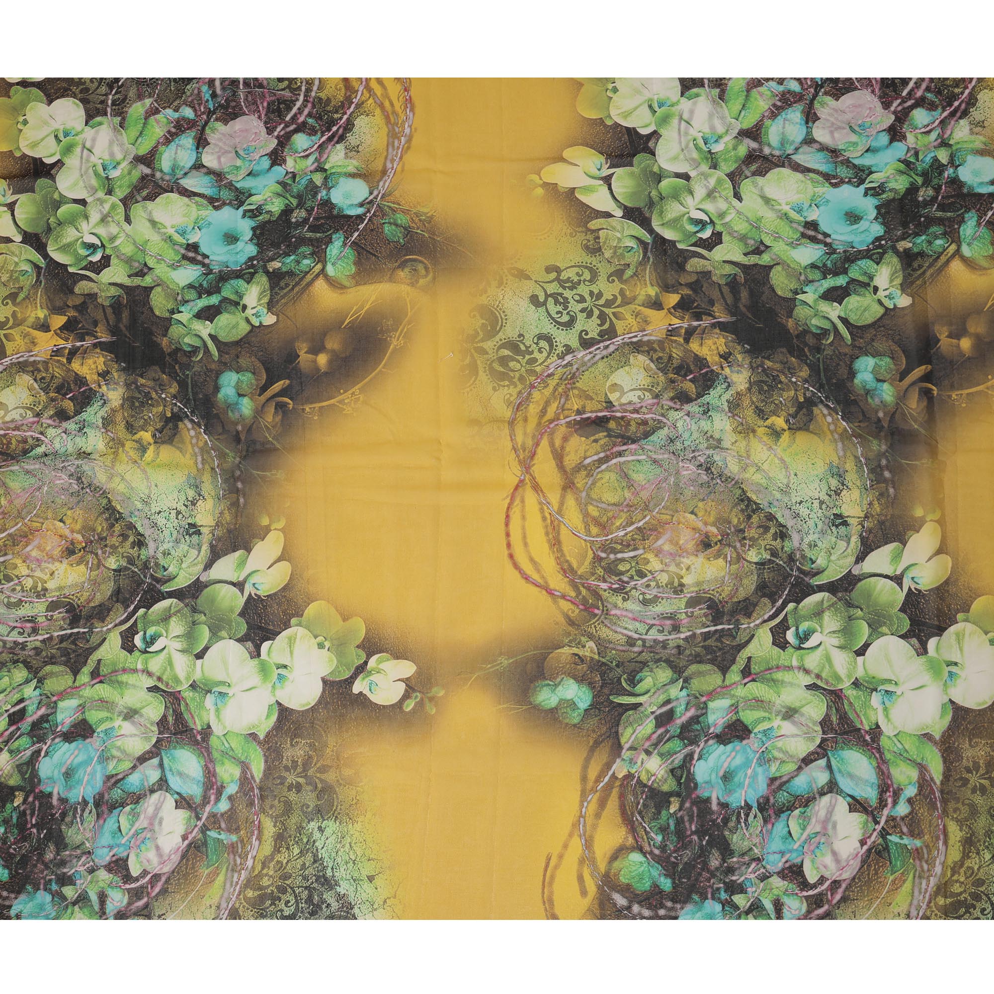 Yellow Green-Black Cotton Voile Traditional Sudanese Thobe with Floral Artistic Print, 4.5 Mtrs Piece, Width 140 Cms, Made in India-D26476