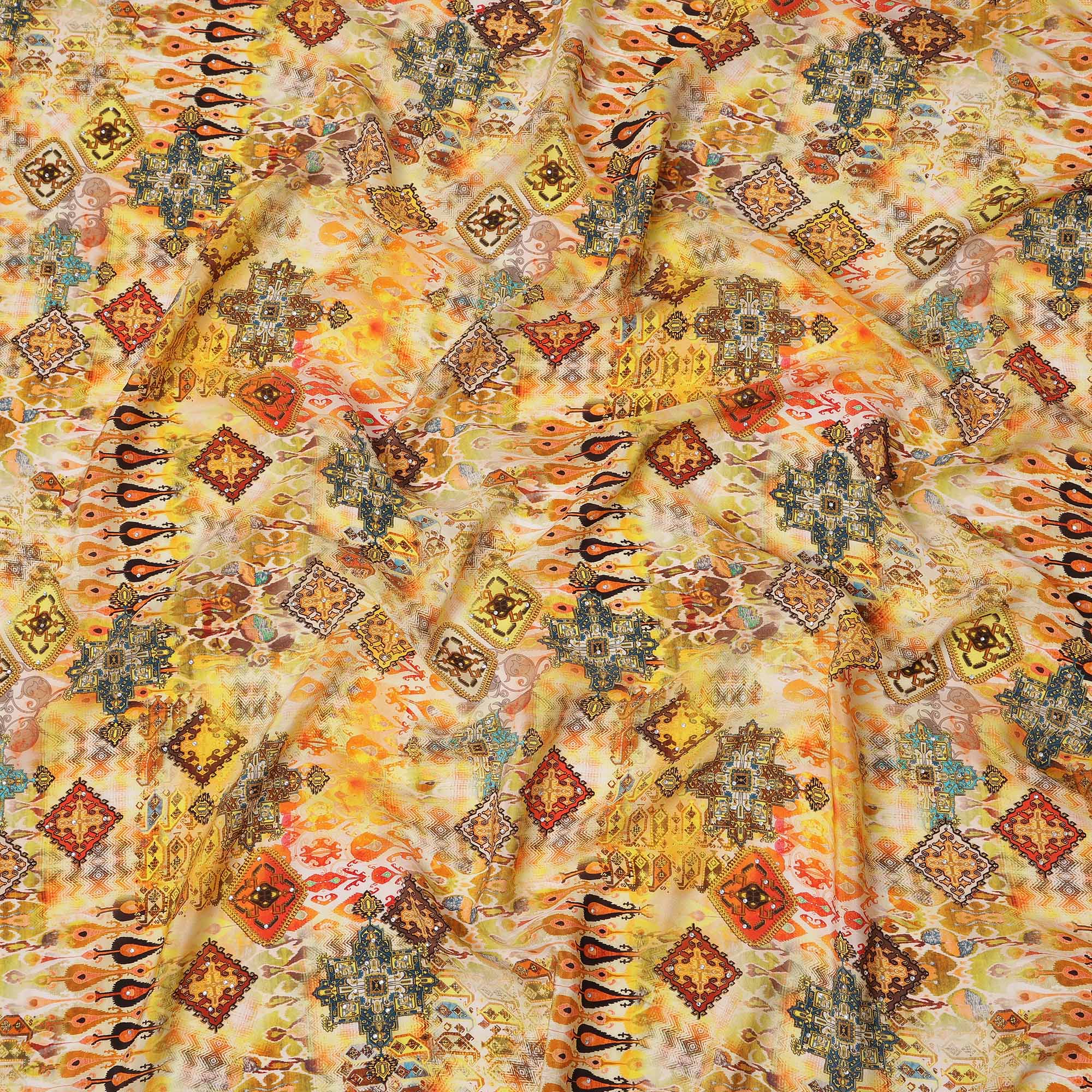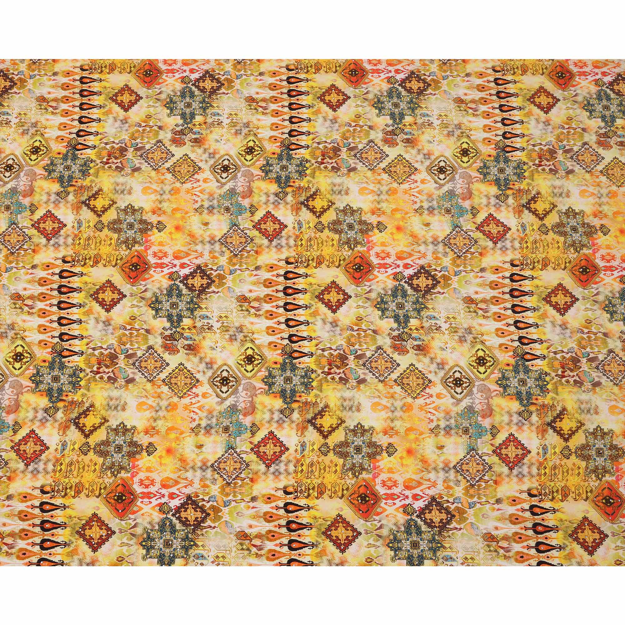 Premium Yellow Multicolor Abstract Pattern Pure Silk Crepe Fabric with Stone Work made in India