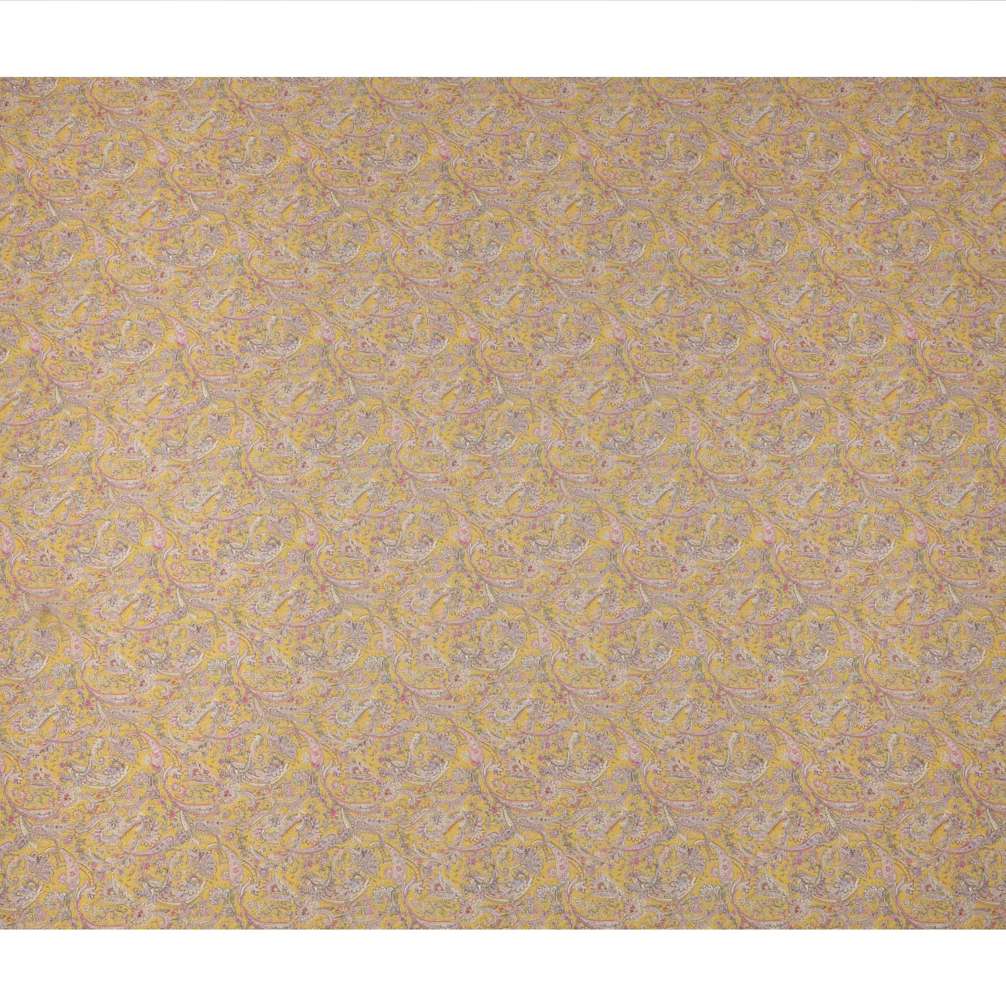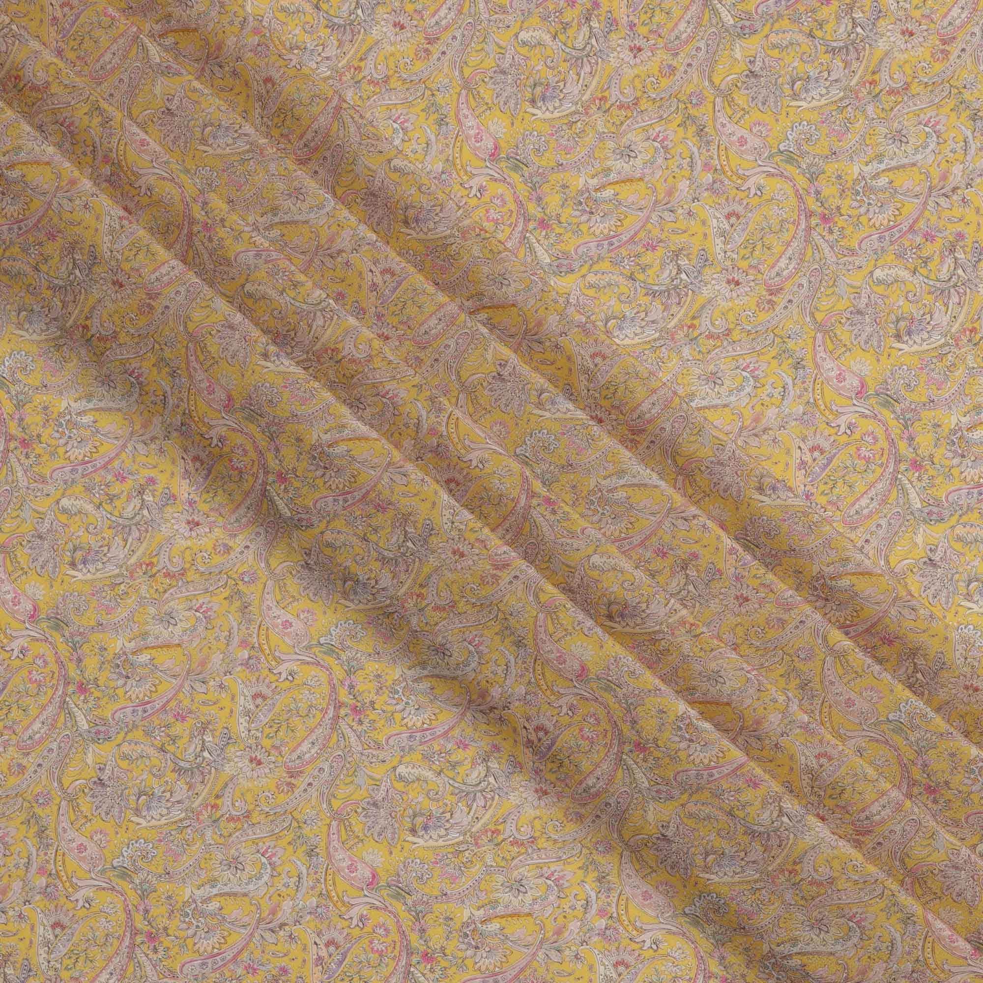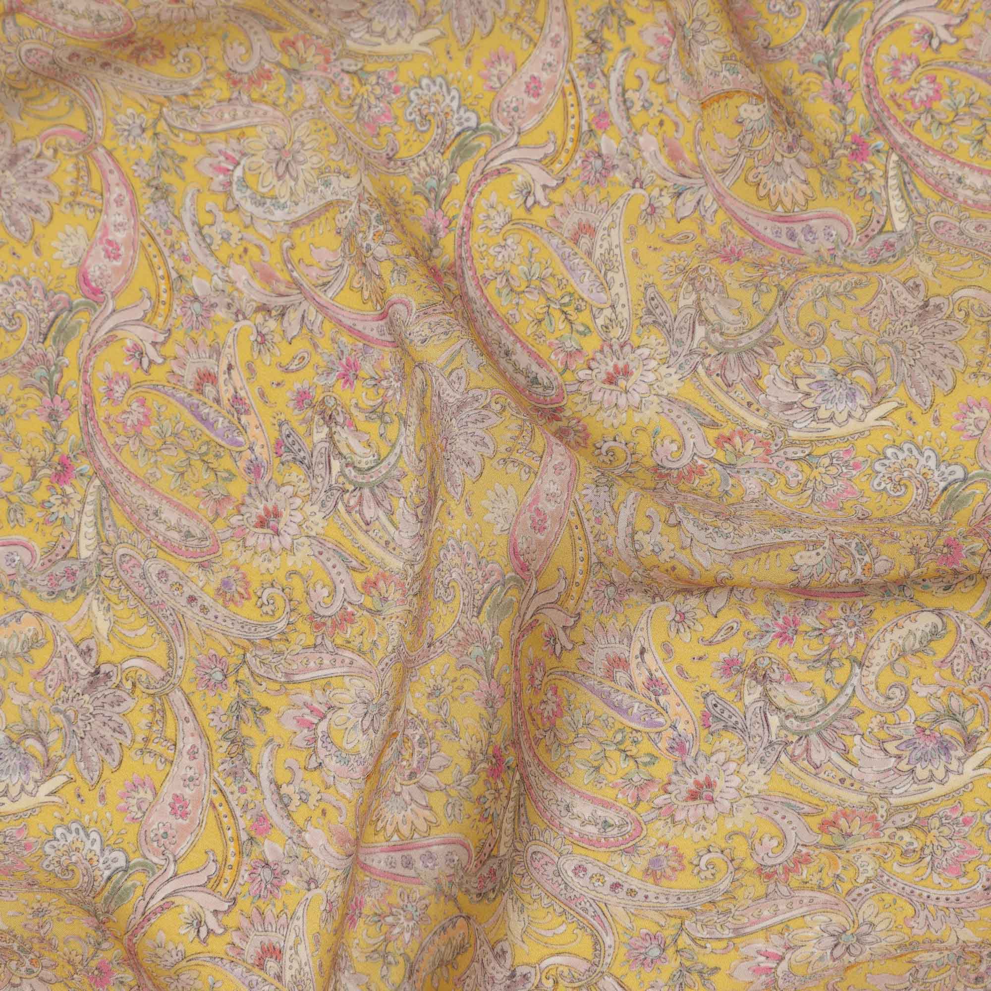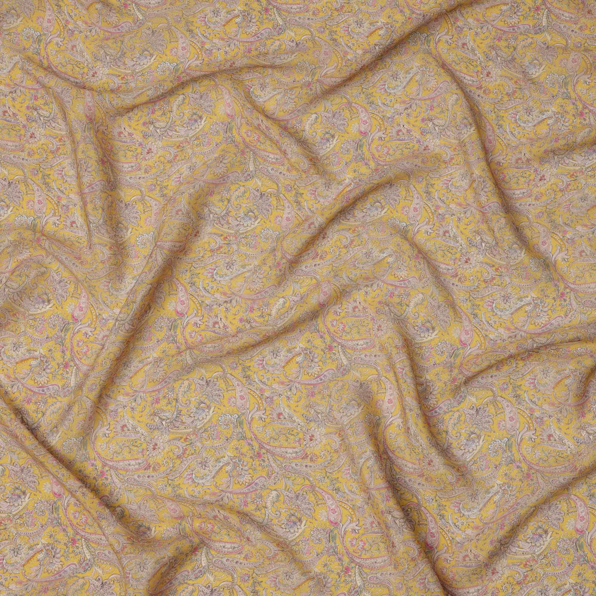 قماش كريب فيسكوز أصفر مطبوع بنقوش بيزلي، بزخارف عرقية رقيقة بألوان الوردي والبيج والأزرق، عرض 110 سم، صنع في الهند - D23452