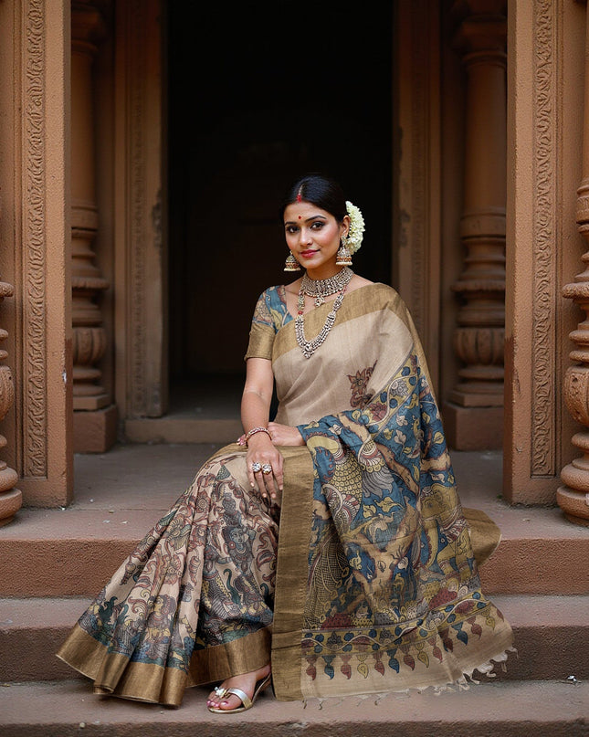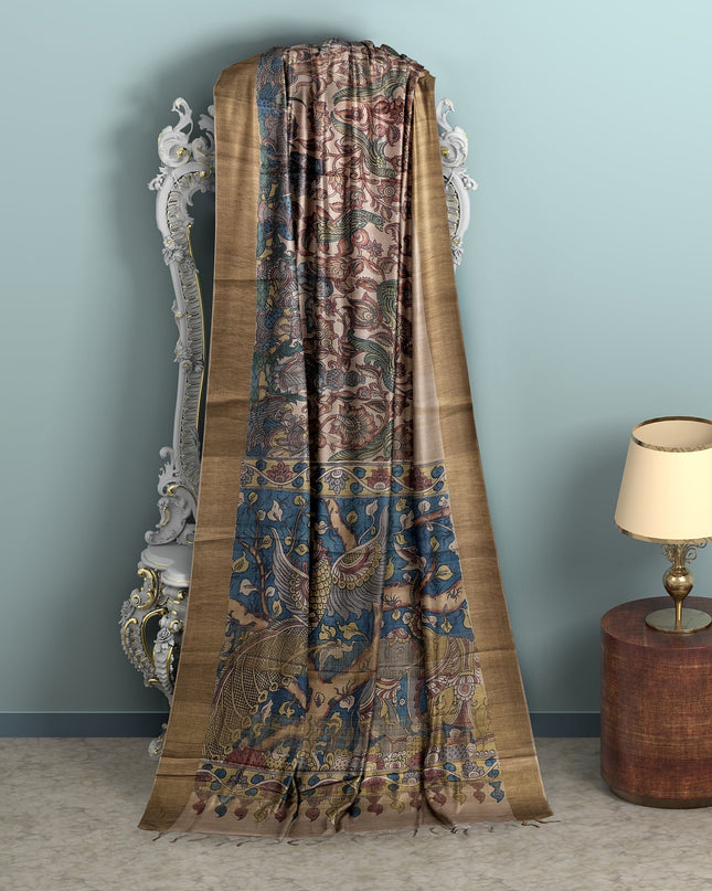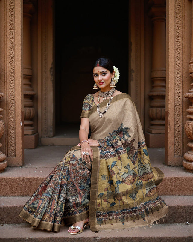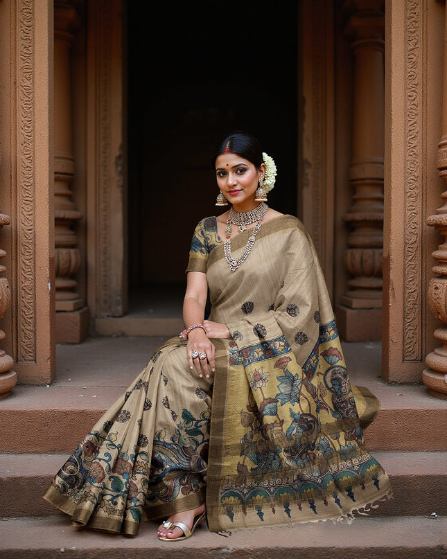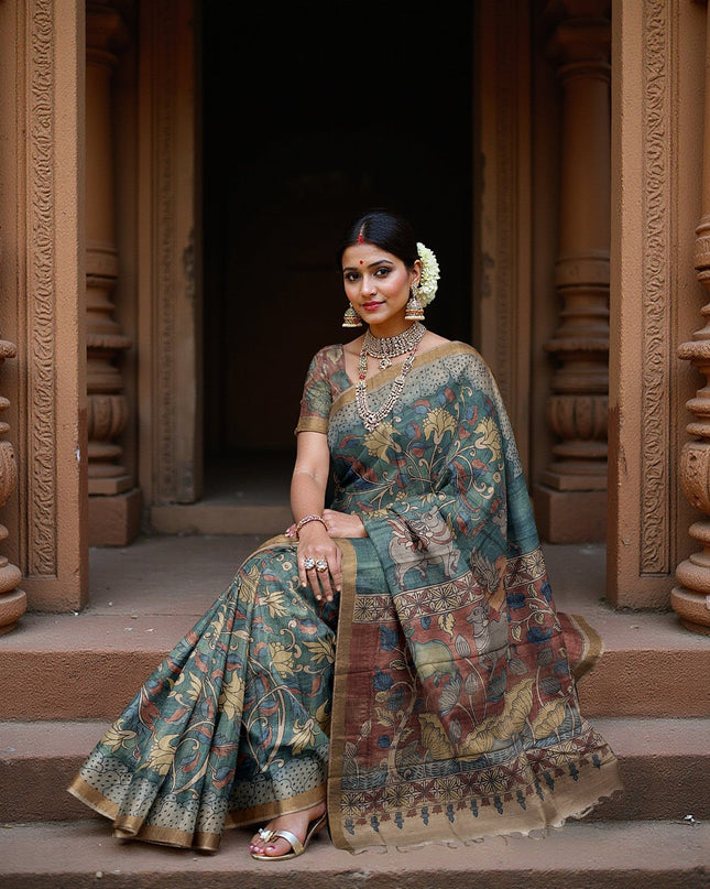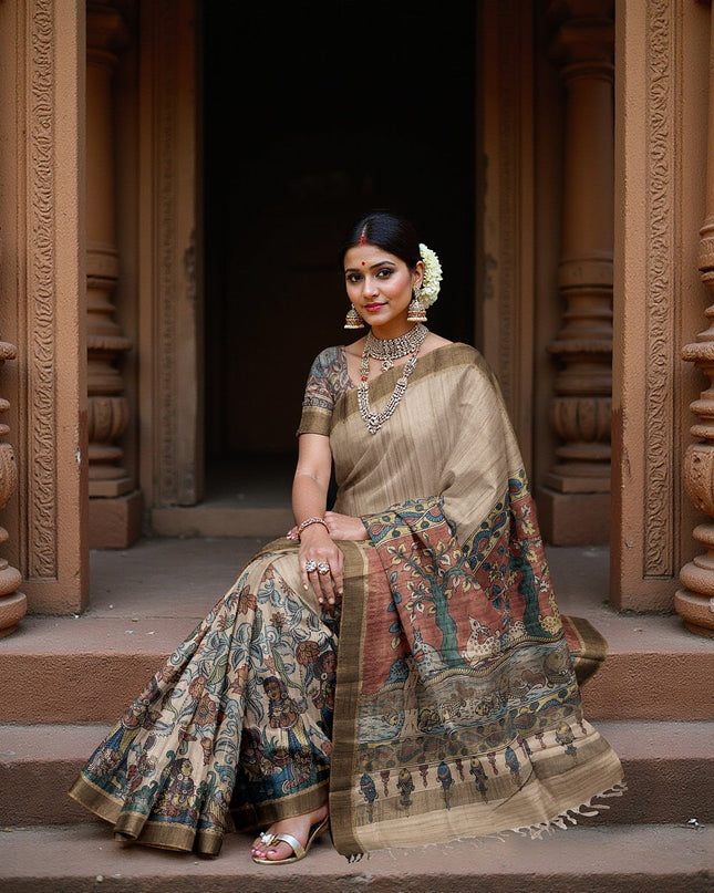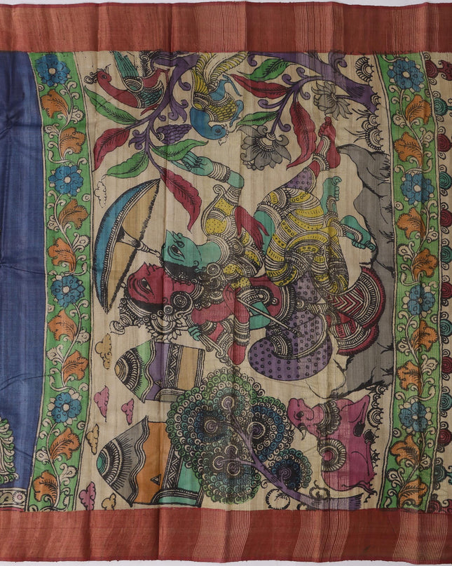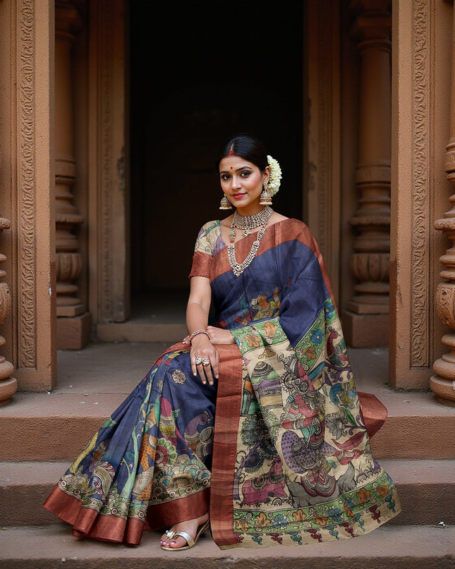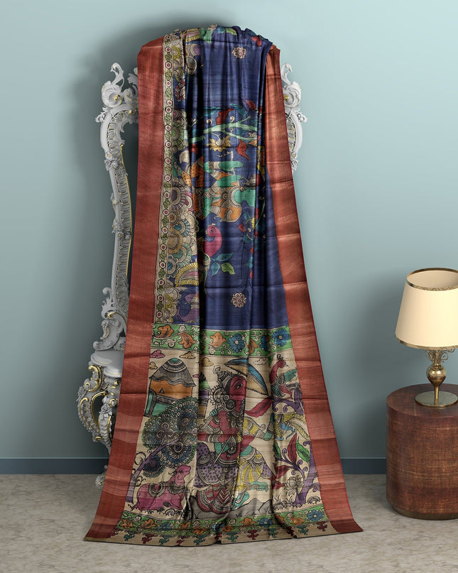 Celebrate the timeless charm of Indian heritage with our Kalamkari Silk Saree collection. Each saree is a masterpiece, hand-painted or block-printed by skilled artisans using natural dyes and traditional techniques passed down through generations. Woven on luxurious silk, these sarees showcase intricate motifs inspired by mythology, nature, and folklore.