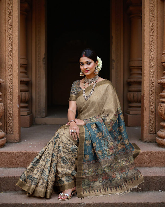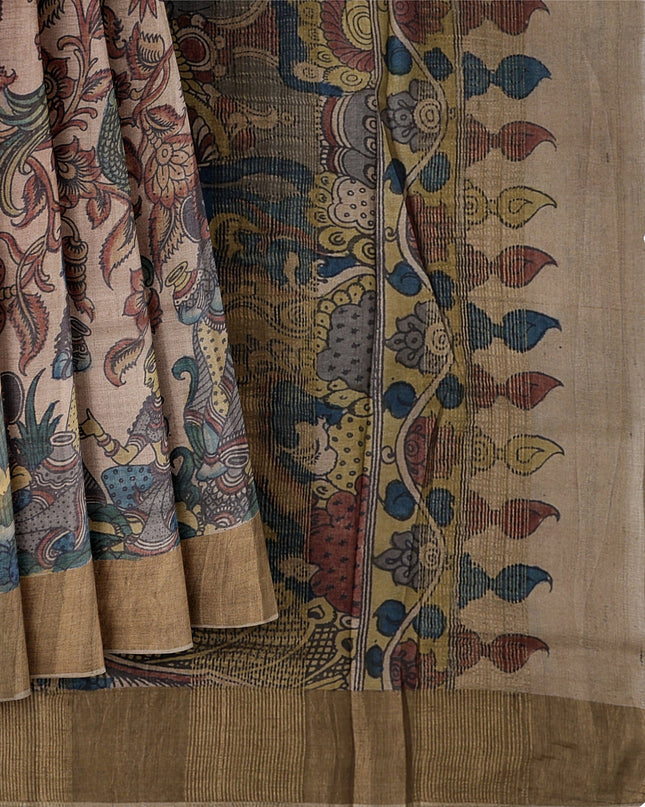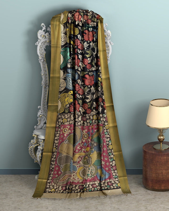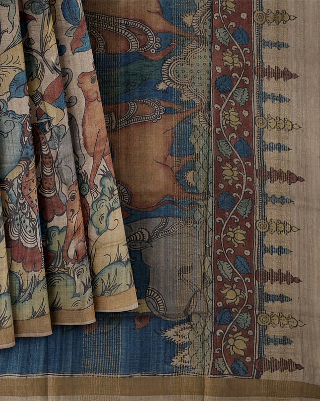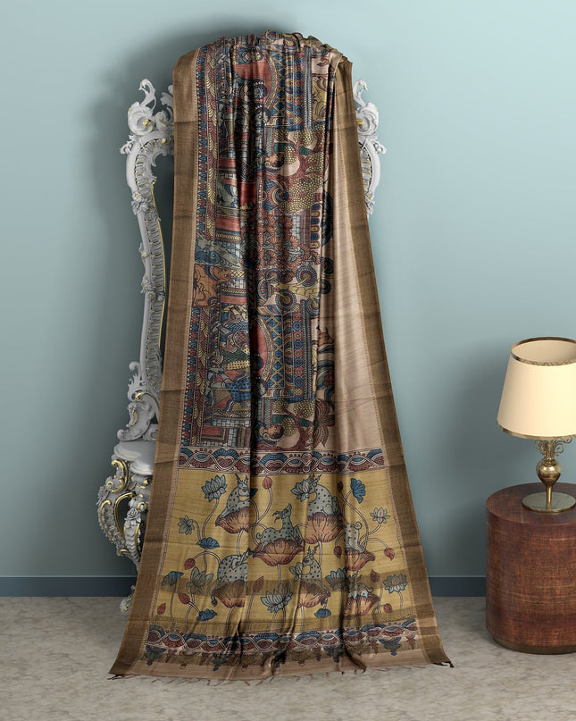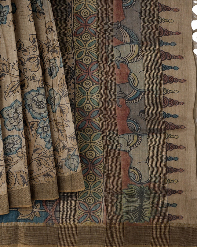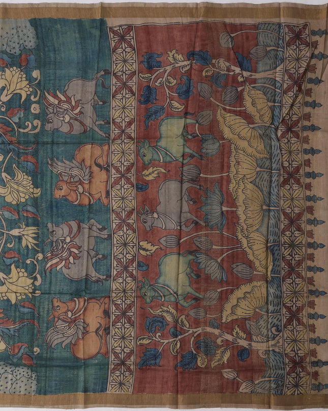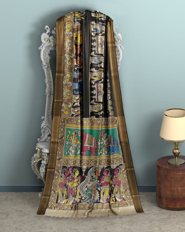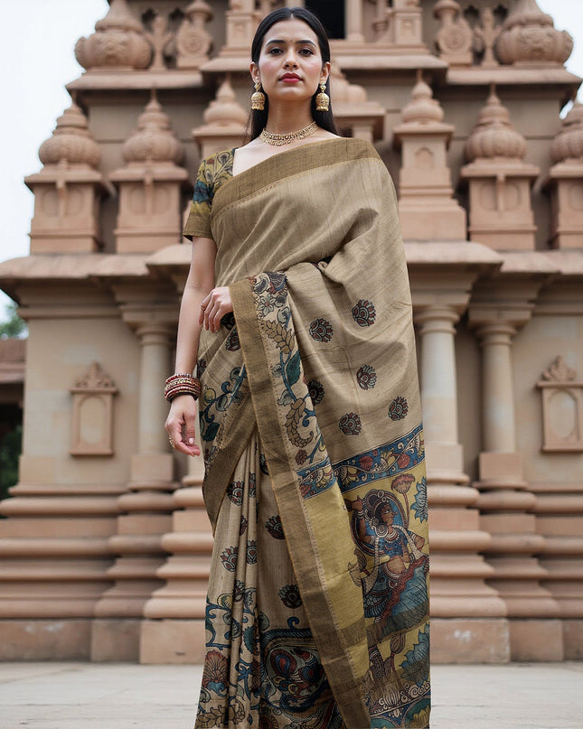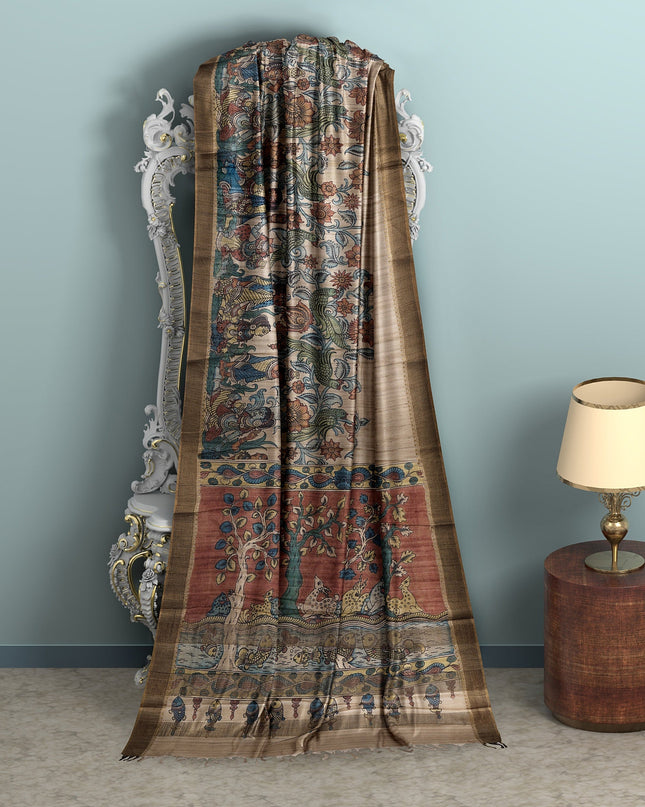 Celebrate the timeless charm of Indian heritage with our Kalamkari Silk Saree collection. Each saree is a masterpiece, hand-painted or block-printed by skilled artisans using natural dyes and traditional techniques passed down through generations. Woven on luxurious silk, these sarees showcase intricate motifs inspired by mythology, nature, and folklore.