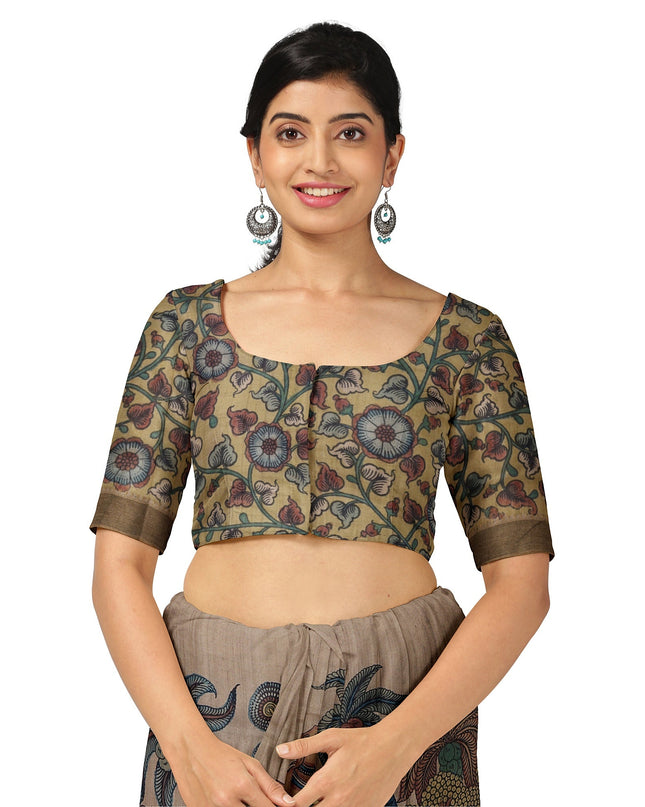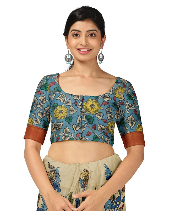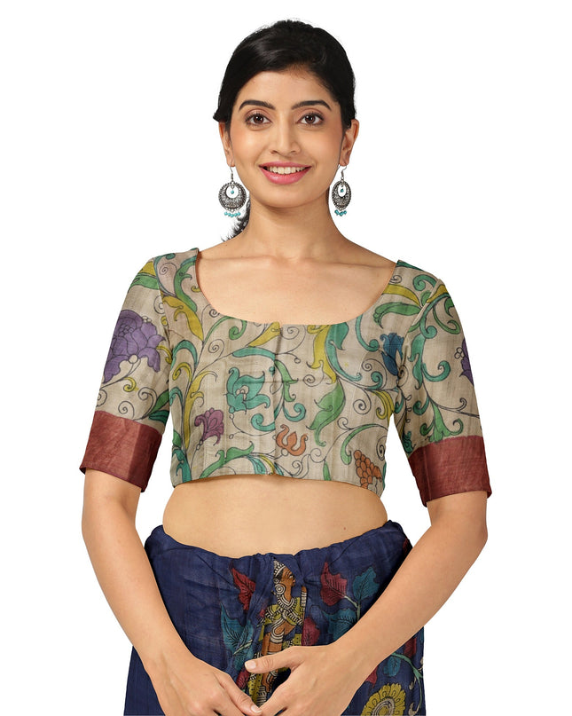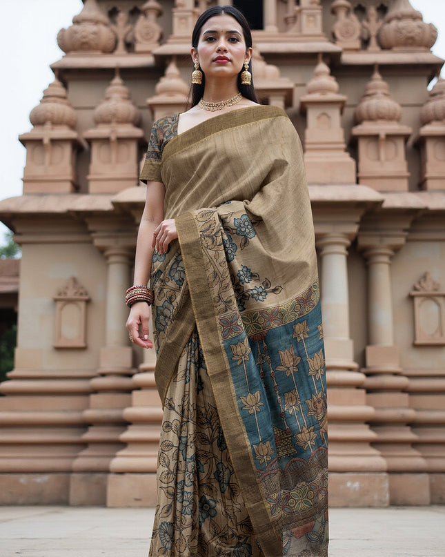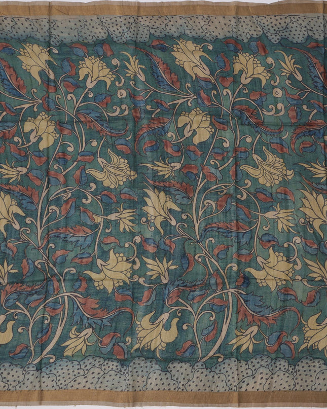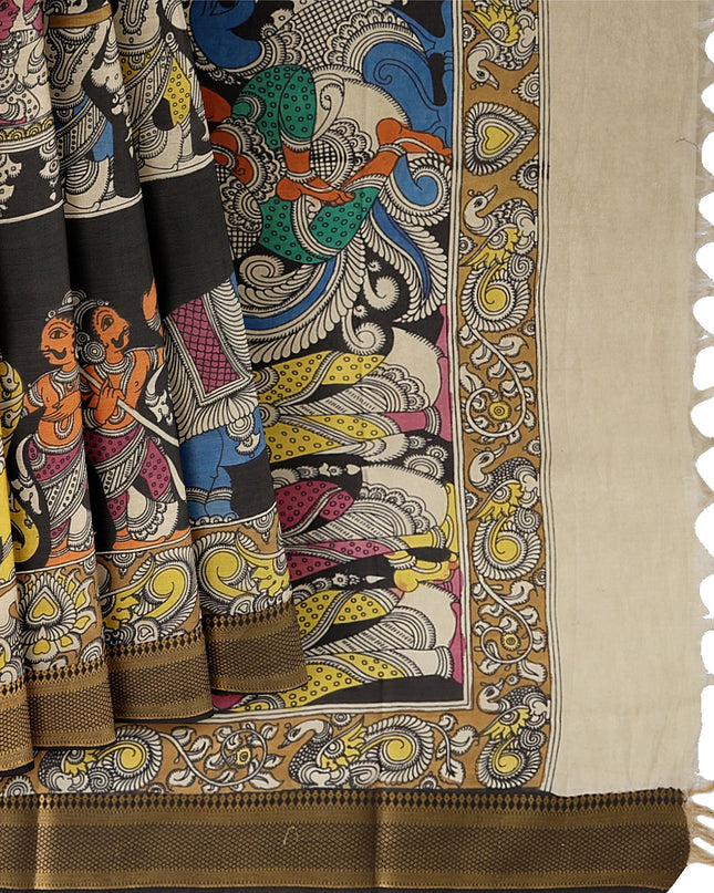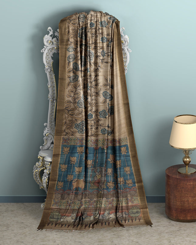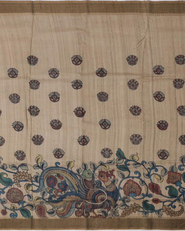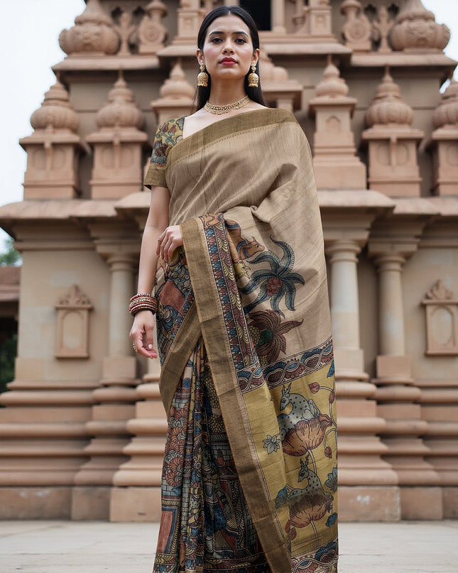 Celebrate the timeless charm of Indian heritage with our Kalamkari Silk Saree collection. Each saree is a masterpiece, hand-painted or block-printed by skilled artisans using natural dyes and traditional techniques passed down through generations. Woven on luxurious silk, these sarees showcase intricate motifs inspired by mythology, nature, and folklore.