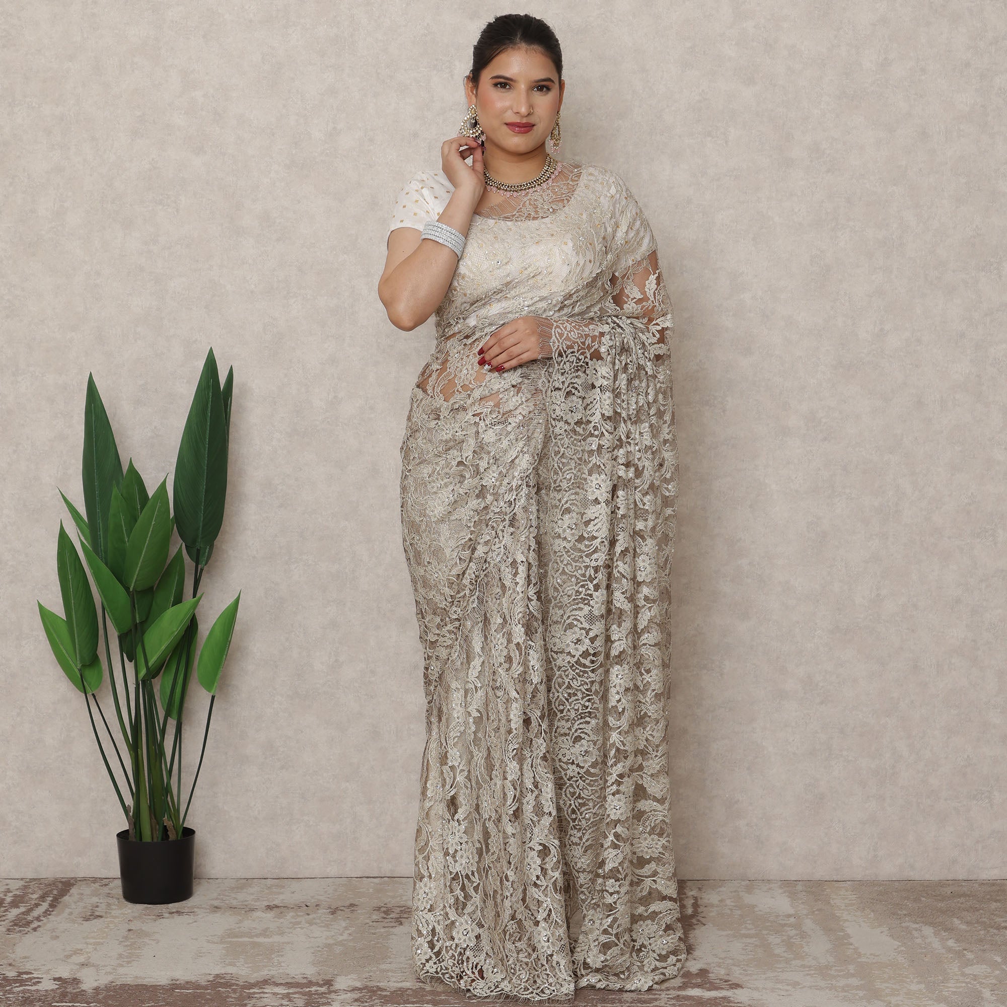 Drape yourself in refined opulence with this Antique Beige saree, crafted from authentic French Chantilly lace and embellished with delicate stone work that adds a soft, glamorous shimmer to its vintage-inspired elegance. The subtle sheen of antique Beige makes this saree a timeless choice for formal occasions, receptions, and evening soirees, effortlessly balancing traditional appeal with contemporary charm. Measuring approximately 5.5 meters in length and 110 cm in width, it offers ample fabric for graceful draping that suits both classic and modern silhouettes. The floral lace pattern brings out the artistry of French craftsmanship while the scattered stones enhance its festive appeal without overpowering its grace. Blouse piece is not included, allowing for creative styling with embellished or contrast designer blouses. Lightweight, luxurious, and culturally rich, this saree is a must-have for women who appreciate timeless fashion with a couture edge. Shop online now and buy online to elevate your ethnic wardrobe with this exquisite lace ensemble.