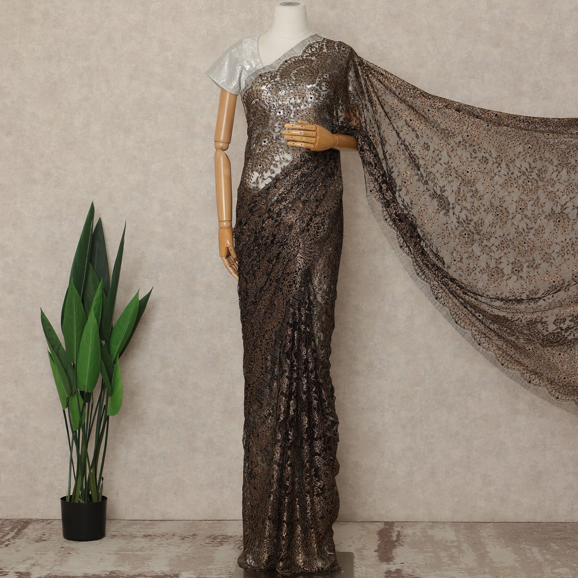 Antique Black Gold Premium French 2 Tone Chantilly Saree Lace With Stone Work Fabric 5.5 Meters Length 110 Cms Width Imported From France Elegant Designer Lace Blouse Not Included-D27373