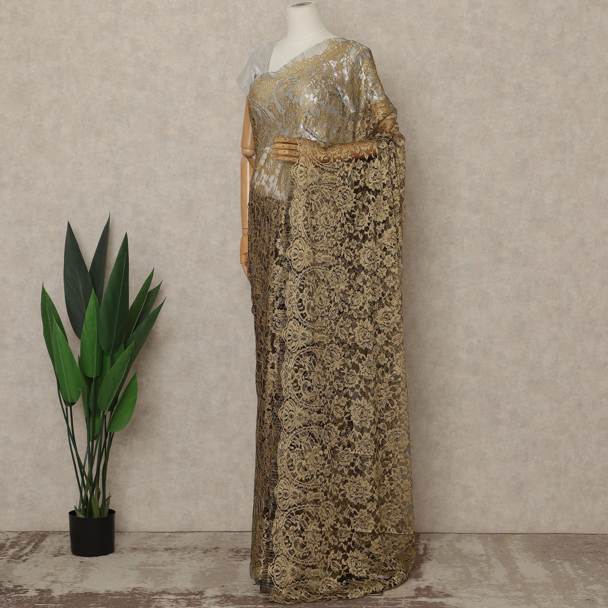 This Antique Gold Premium French 2-Tone Chantilly Lace Saree showcases a luxurious antique gold color enriched with a sophisticated two-tone effect that highlights the intricate floral Chantilly lace patterns, expertly crafted in France to reflect timeless elegance and superior craftsmanship, offered as a premium lace saree fabric piece measuring approximately 5.5 meters in length with a wide 110 cms width, making it ideal for creating refined sarees for weddings, receptions, evening wear, and festive occasions, where the sheer texture and graceful drape enhance the overall silhouette, and as an authentic French lace, it delivers couture-level quality and aesthetic appeal, while the blouse is not included to allow personalized styling, and careful hand wash or professional dry cleaning is recommended to maintain the delicate lace and rich golden tones.